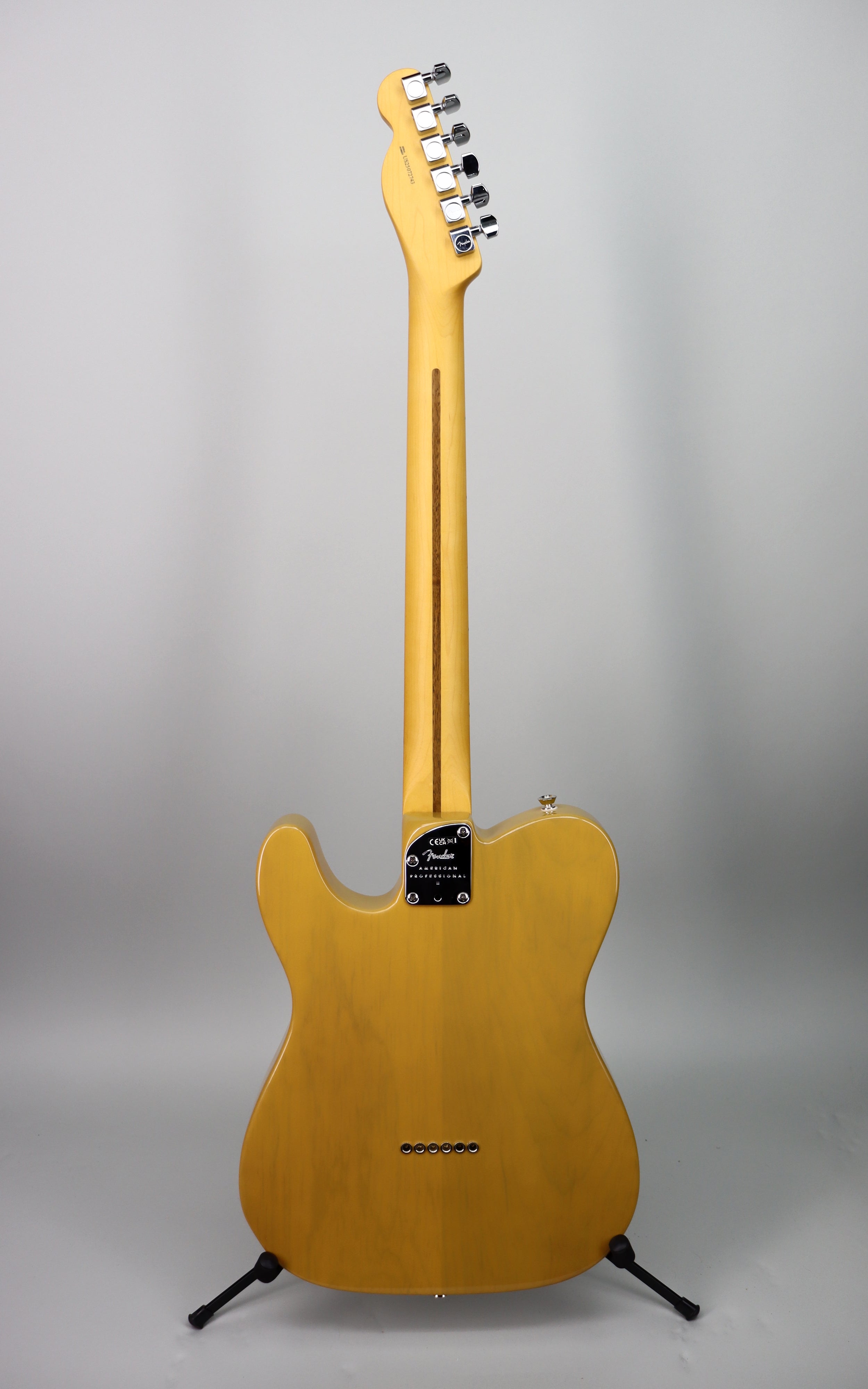 Specs: Roasted pine body; maple Deep “C” neck with super‑natural satin finish and rolled fingerboard edges; 22 narrow‑tall frets; bone nut; 3‑saddle top‑load/string‑through bridge with compensated brass “bullet” saddles; 25.5" scale length; 9.5" fingerboard radius; 1.685" nut width. Gloss urethane Butterscotch Blonde finish. Deluxe molded hardshell case included.