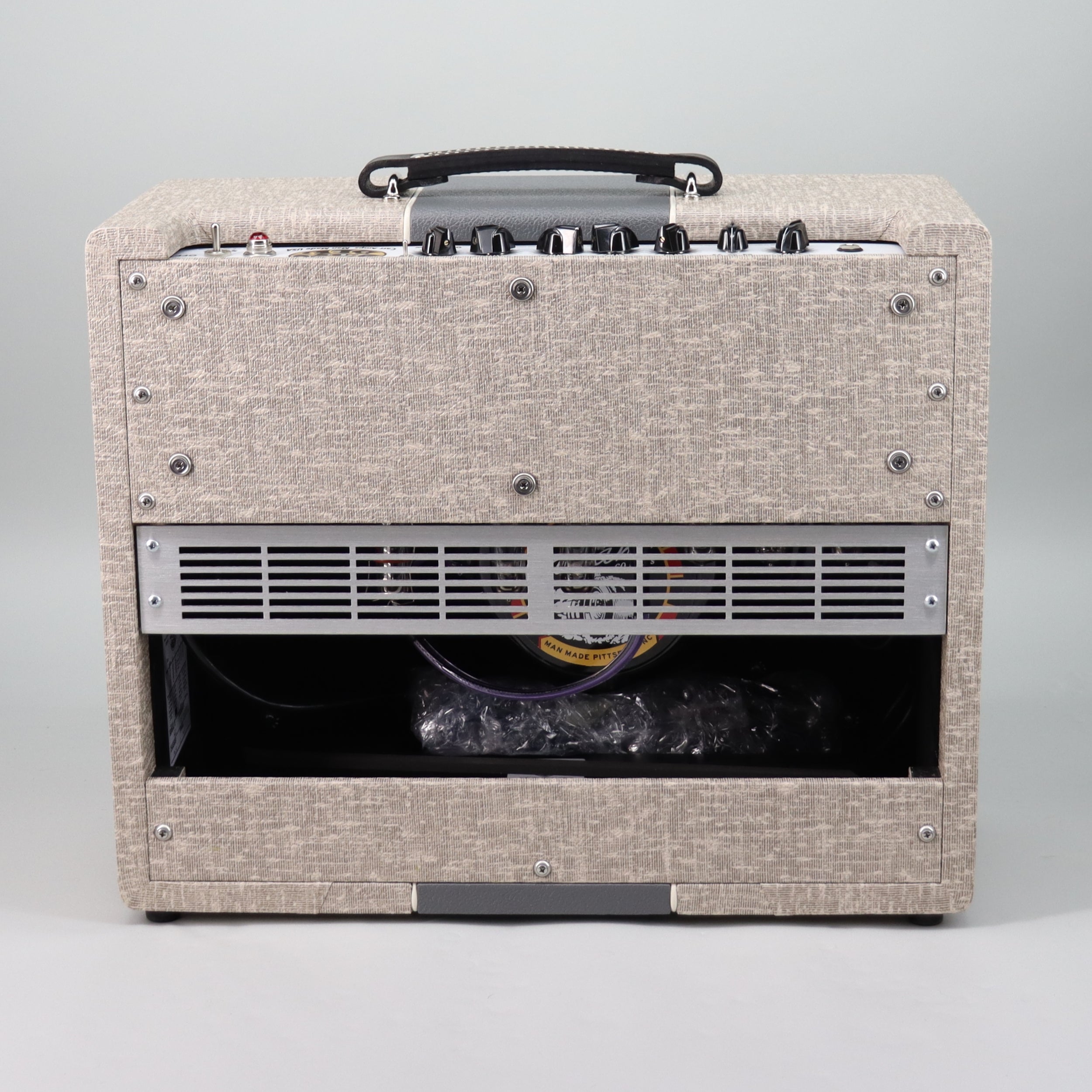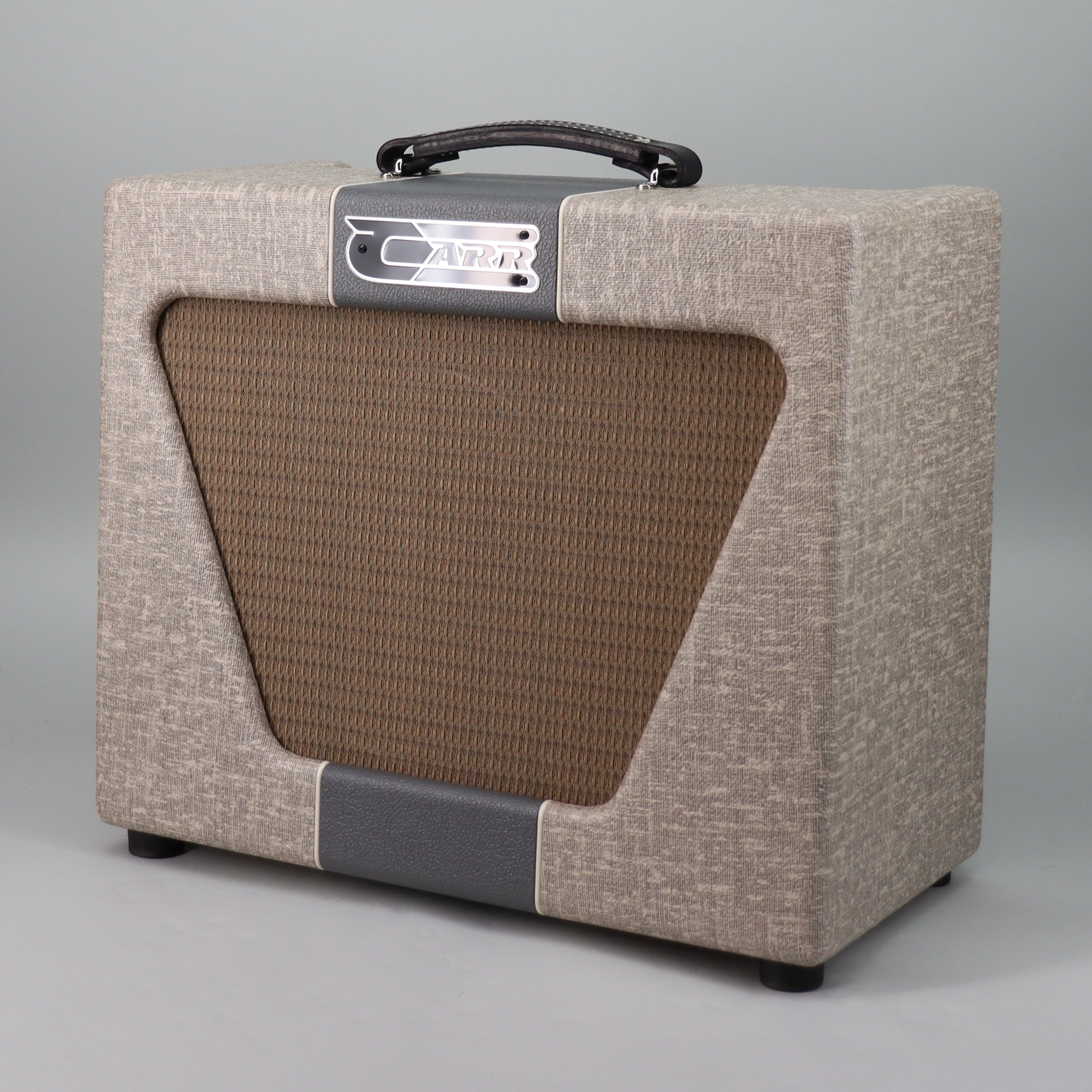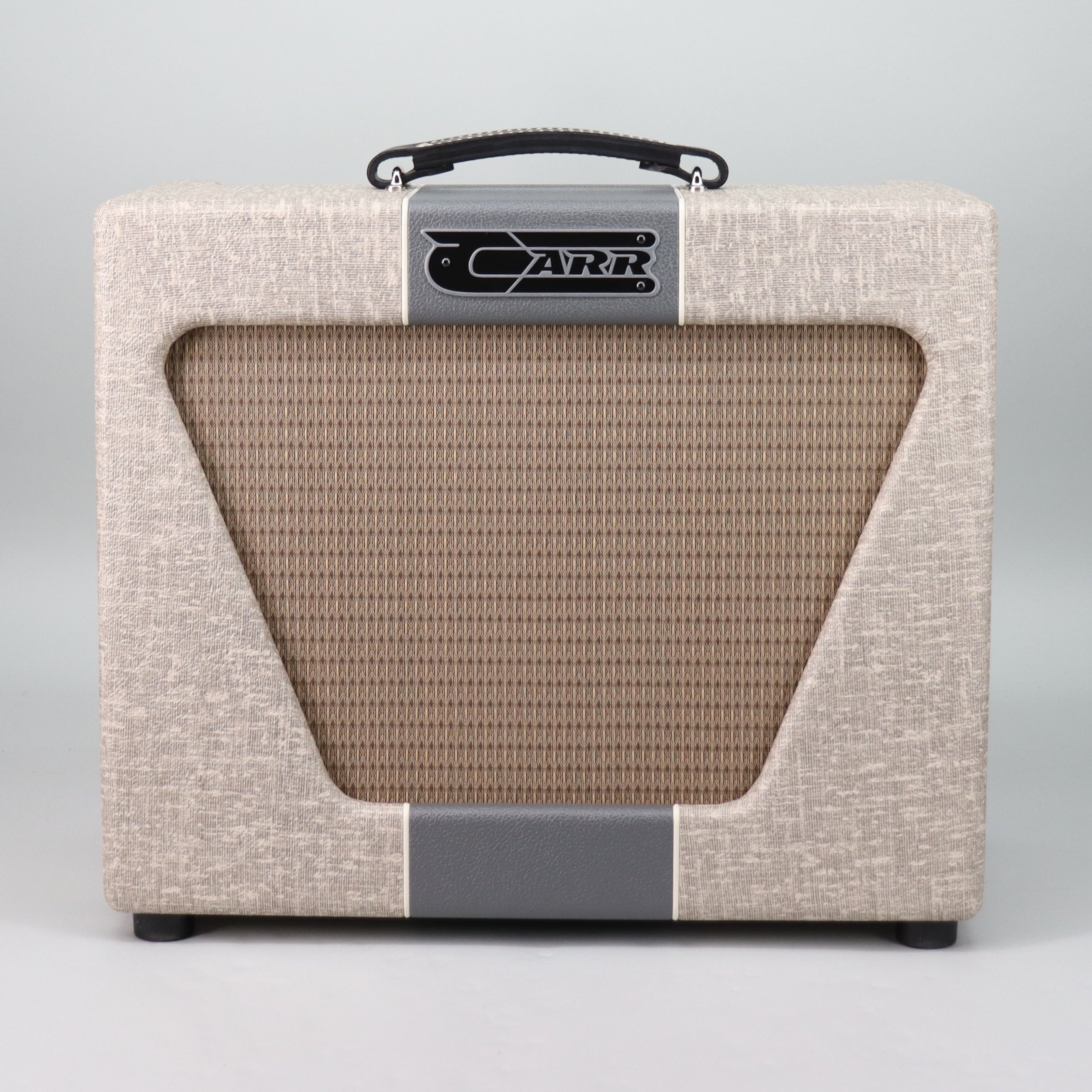 Specs: Hand-crafted from solid North Carolina yellow pine cabinet; 10 Watts full-output (attenuated down to 2 W and whisper mode); 1×12″ Carr Valiant speaker; hand wired point-to-point in USA with custom USA-made transformers, Jupiter signal capacitors, Analysis Plus cables; all tube spring reverb. Slub/Grey finish.