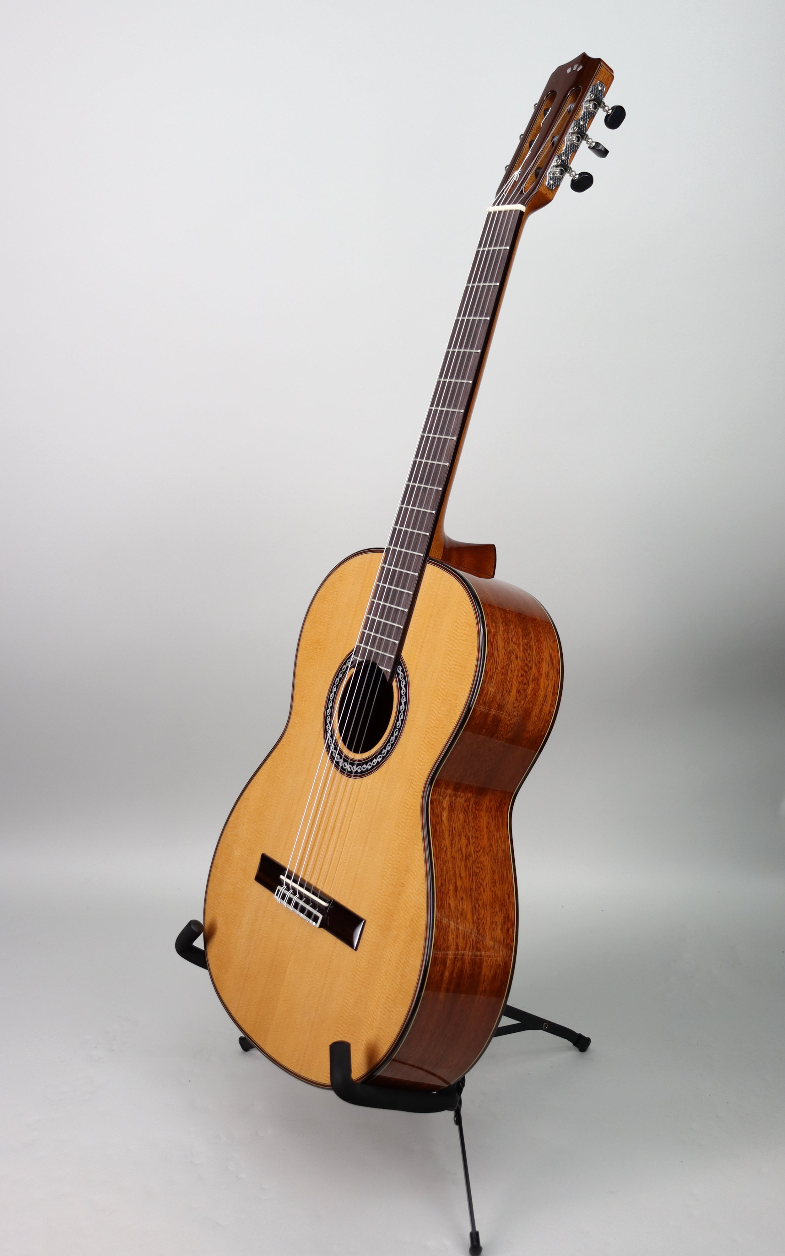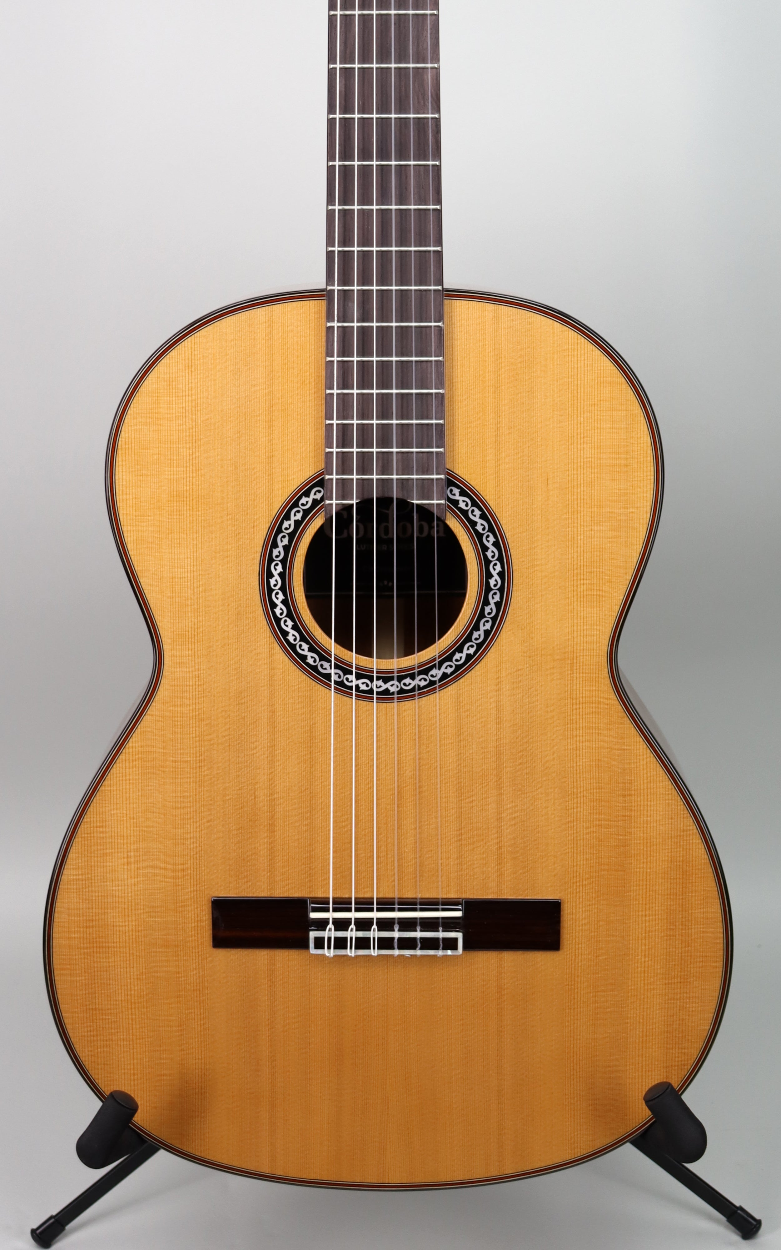 Specs: Solid Western red cedar top; solid African mahogany back and sides; hand‑carved mahogany Fusion neck with 16″‑radius rosewood fingerboard; dual‑action truss rod; classic Crossover C profile; ebony bridge; bone nut and saddle; 1-7/8" nut width; 26.6" scale; Spanish heel body; 7‑fan Spanish bracing; Indian rosewood bindings with multi‑ply purfling and mother‑of‑pearl rosette. High‑gloss polyurethane finish. Lightweight Cordoba polyfoam case included.