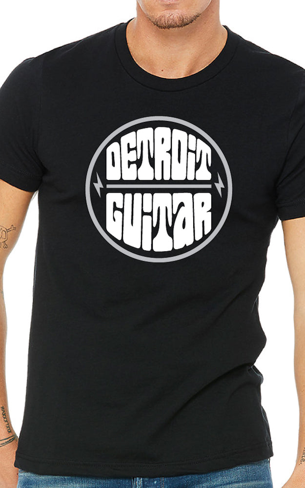 Detroit Guitar bubble logo t-shirt in black and silver. Available in Small, Medium, Large and Extra-Large both in Mens and Ladies (please specify size at checkout).