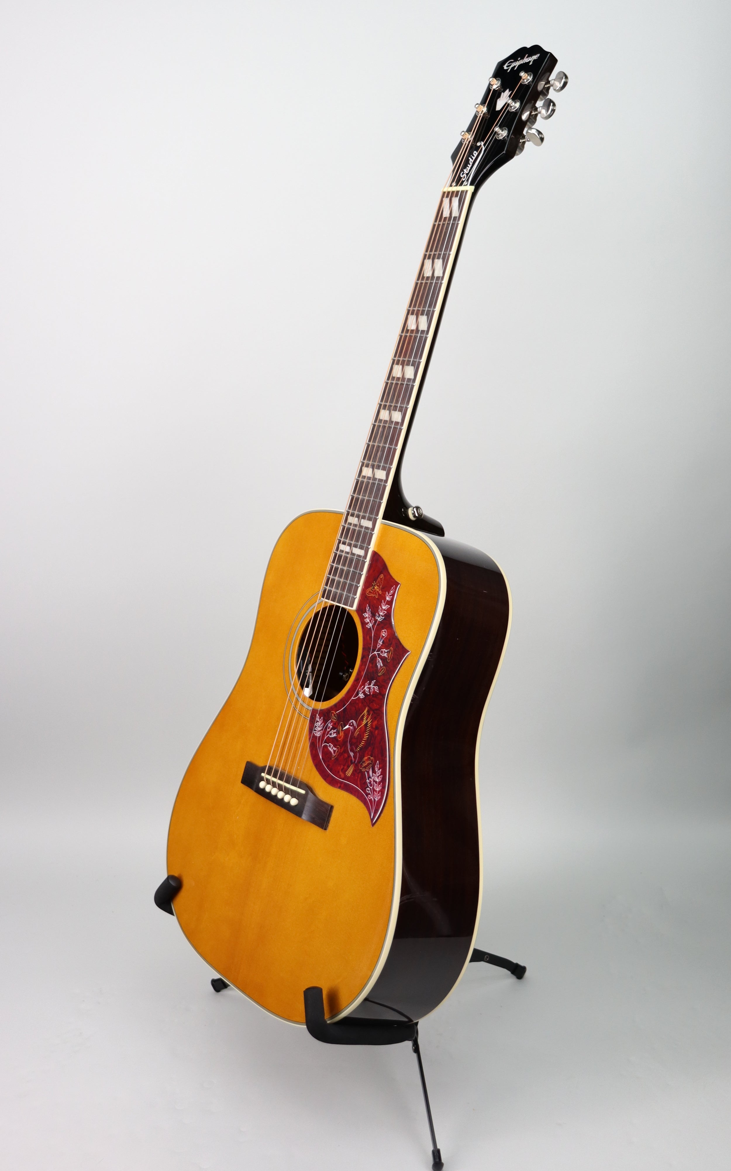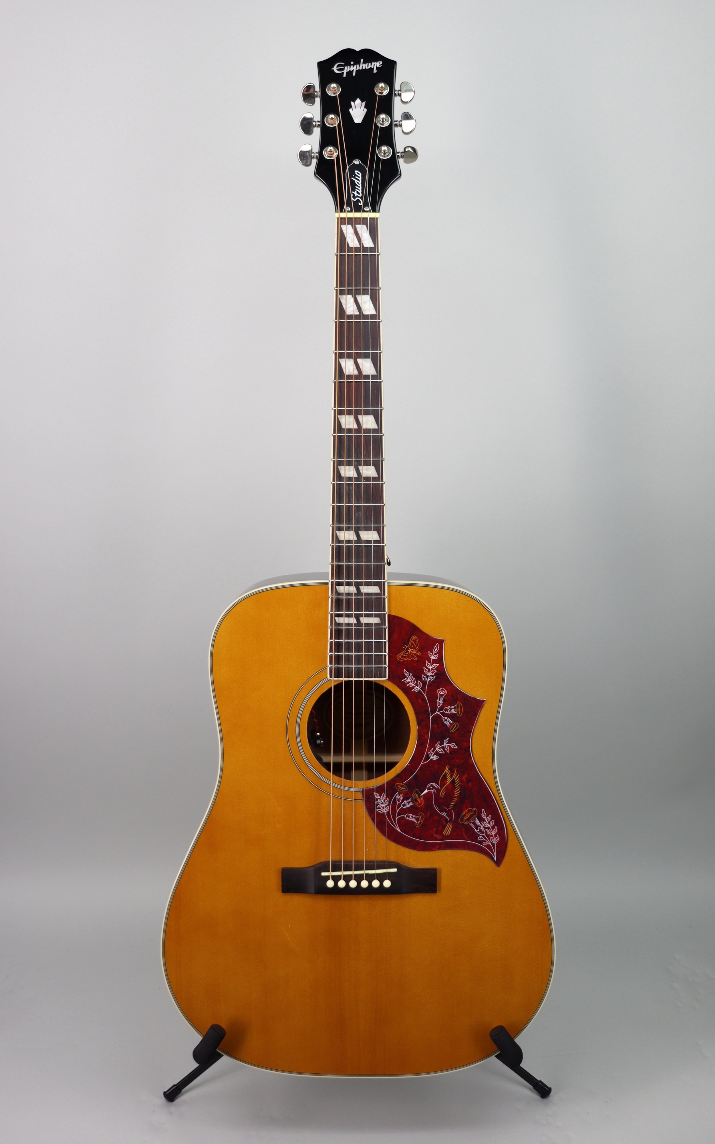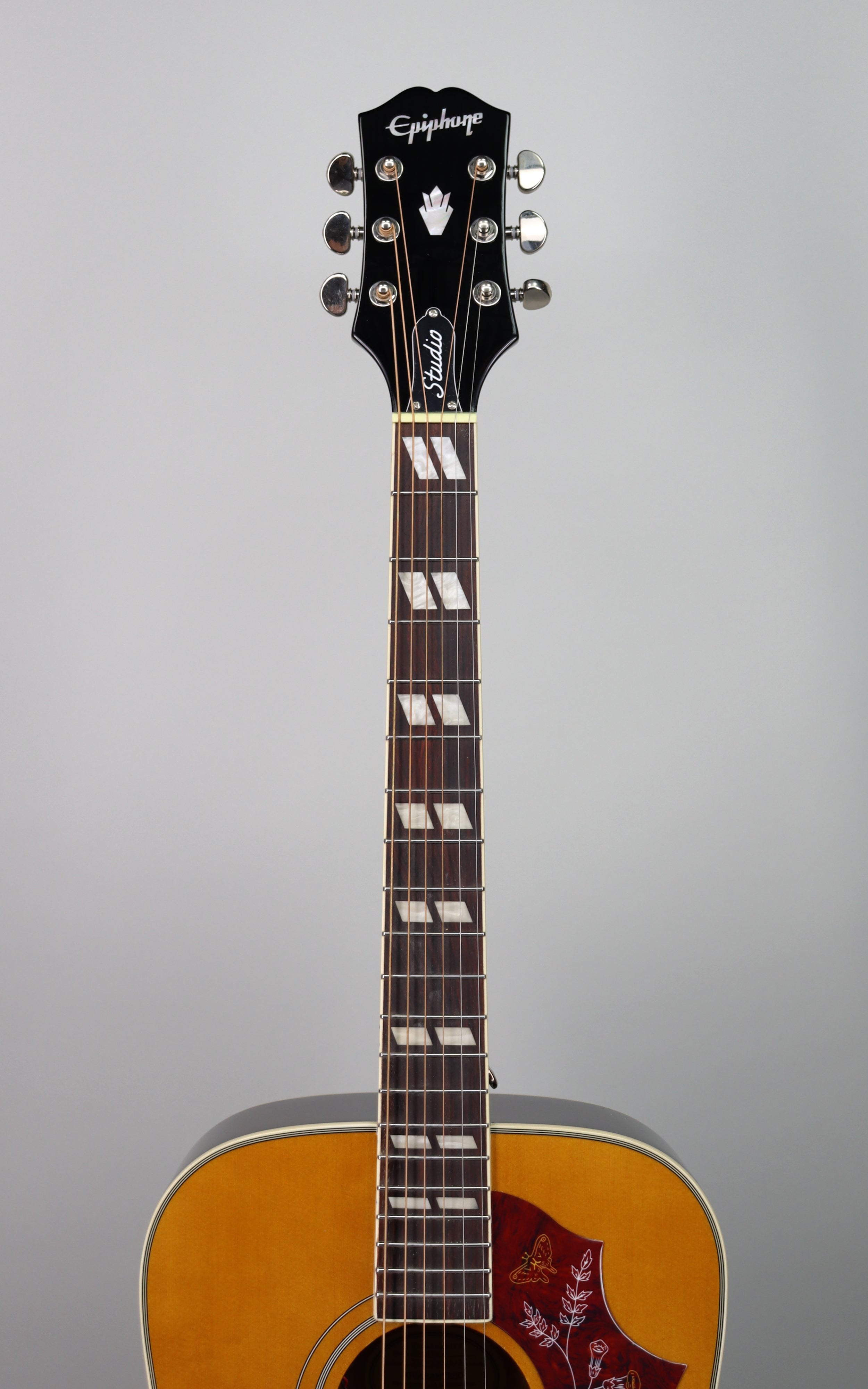 The Epiphone Hummingbird Studio in Antique Natural offers a vintage-inspired aesthetic and stage-ready acoustic-electric performance wrapped into one dynamic instrument. Designed to deliver the big, balanced tone associated with the original Hummingbird silhouette, this model pairs a solid spruce top with layered mahogany back and sides for excellent projection and clarity. With a comfortable Rounded “C” mahogany neck, Grover tuners, and built-in Fishman electronics, this guitar is ideal for songwriters, performers and serious players looking for classic looks and modern utility in one package.