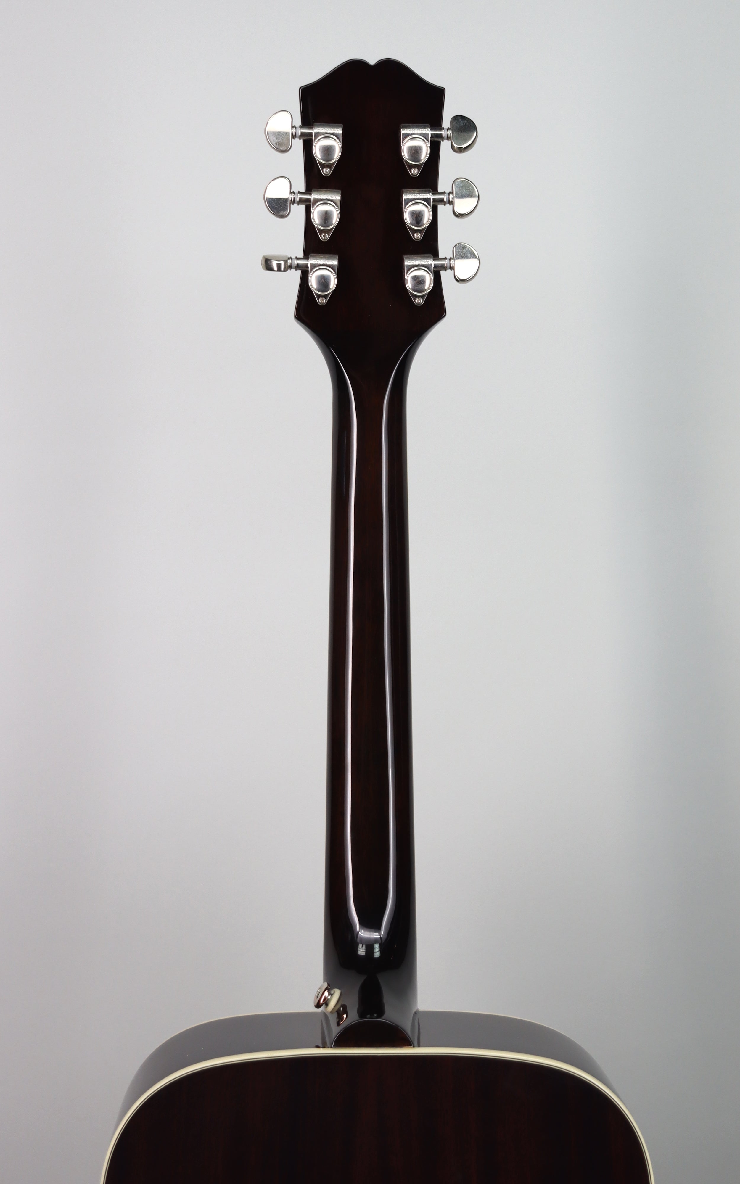 Specs: Solid spruce top; layered mahogany back and sides; mahogany neck with a glued-in tapered dovetail joint; rosewood fingerboard; 20 frets; pearloid split parallelogram inlays; 24.75″ scale length; 1.69″ nut width; belly-up rosewood bridge. Gloss Antique Natural finish. Gigbag included