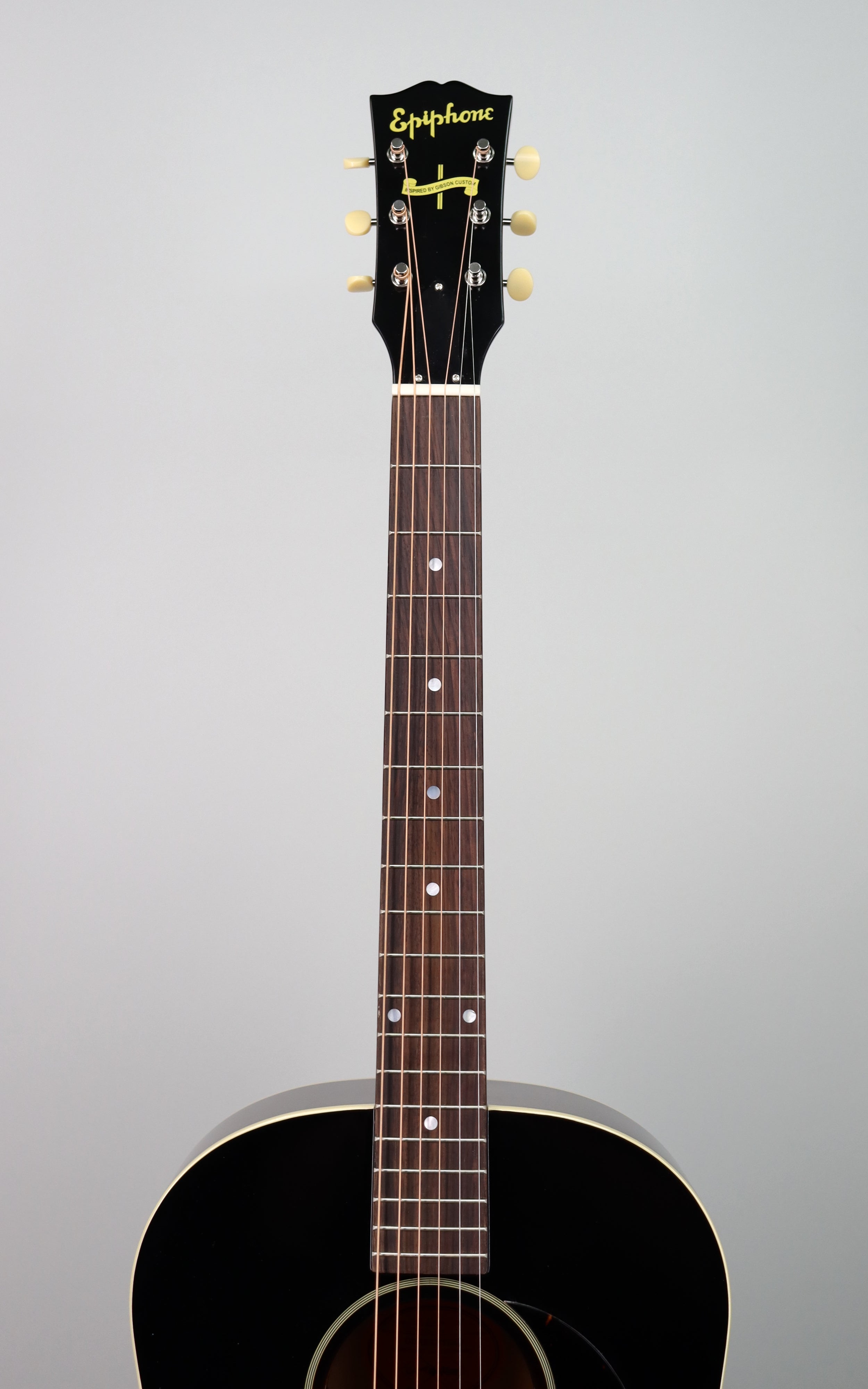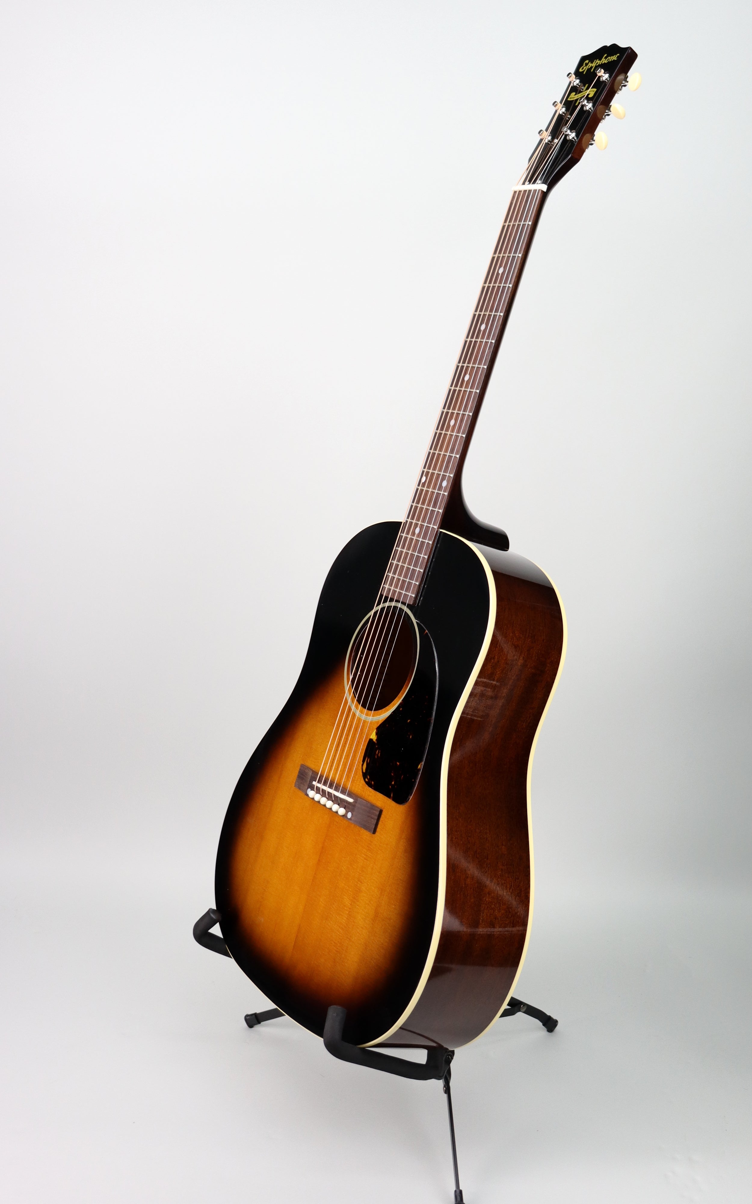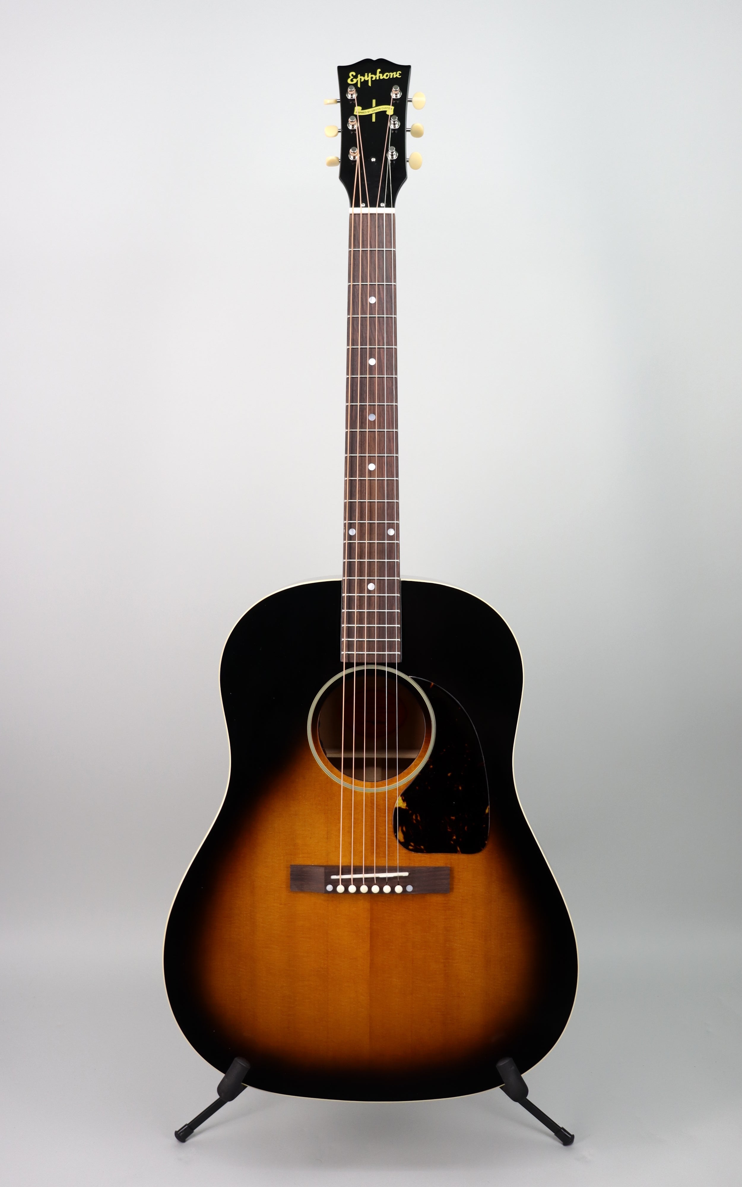Specs: Solid Mahogany back and sides; thermally aged solid spruce top; one-piece Mahogany neck; scalloped X-bracing; single-ply top and back binding; V-shaped neck profile; 12″-radius rosewood fingerboard; bone nut and compensated bone saddle; VOS Vintage Sunburst finish; Epiphone hardshell case with Inspired by Gibson logo.