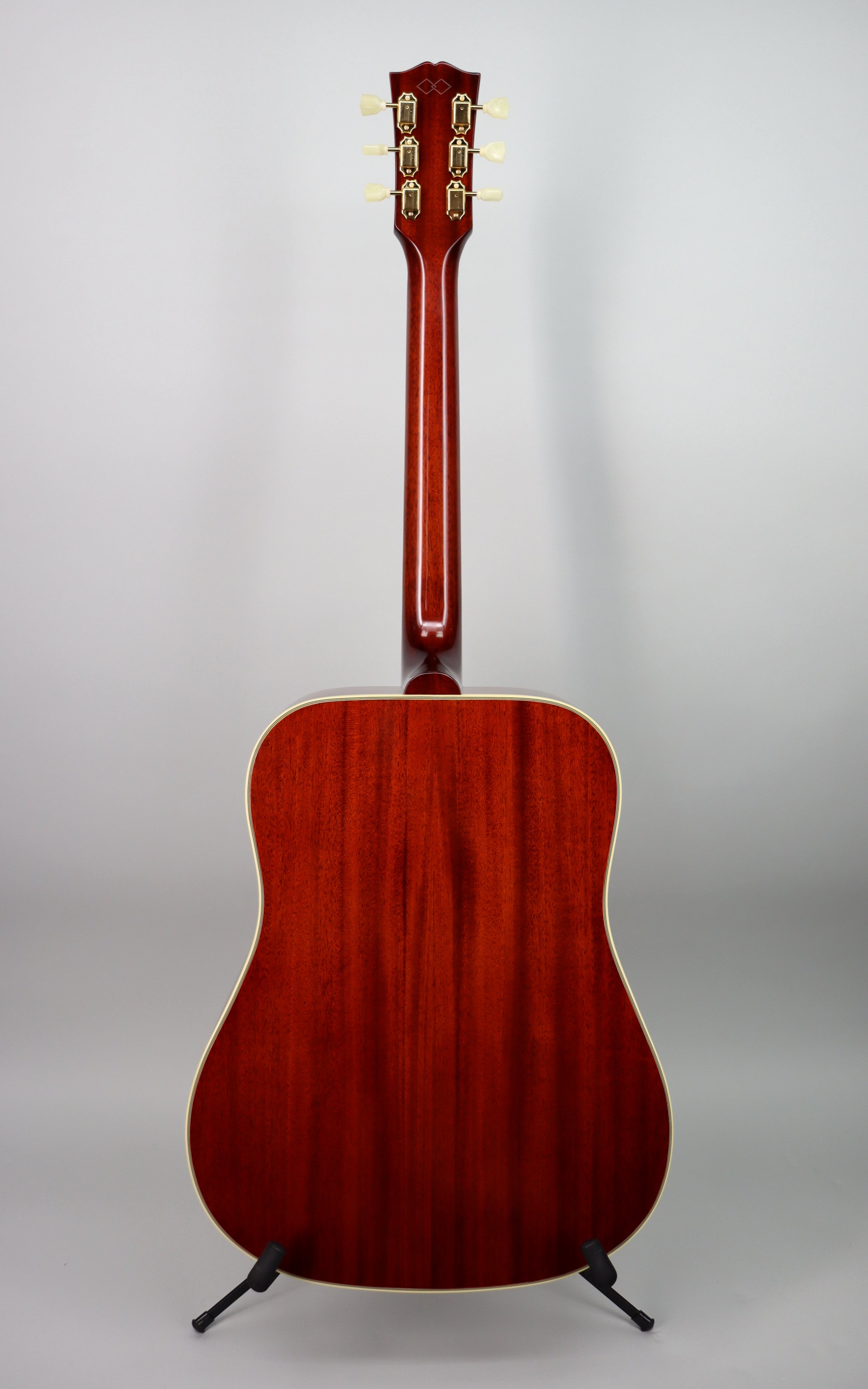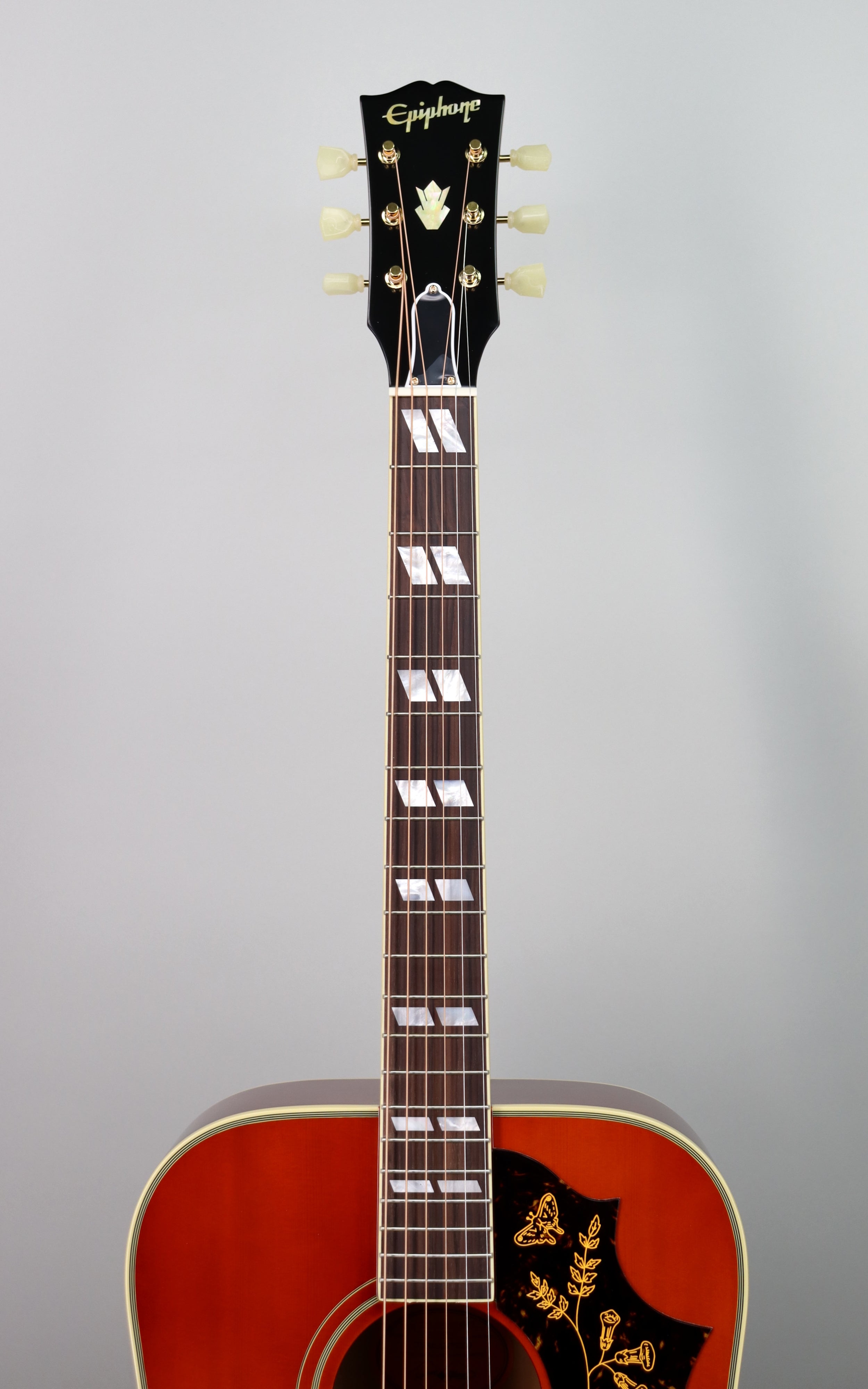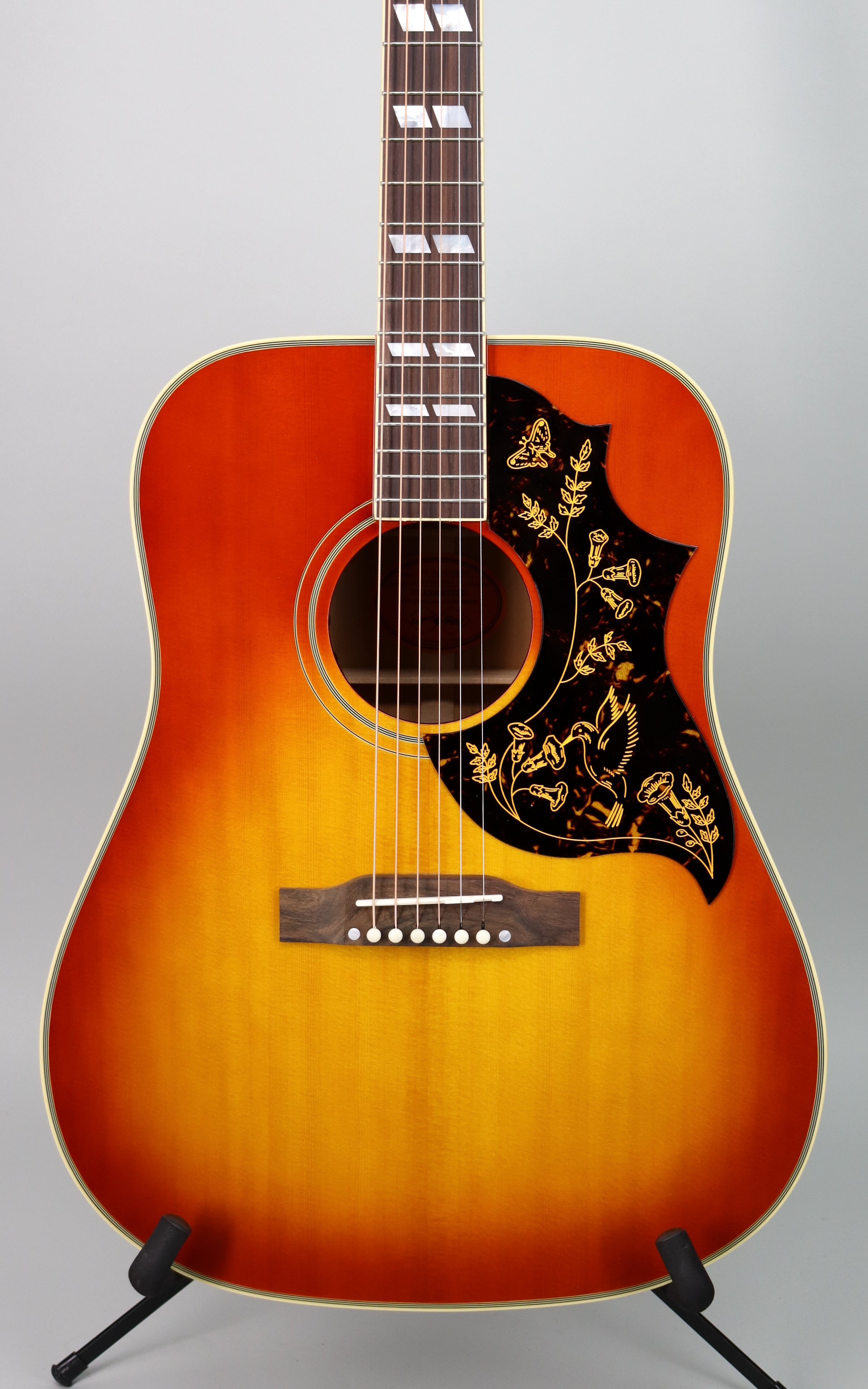 Specs: Solid mahogany body; thermally aged solid Sitka spruce top with traditional scalloped X‑brace; solid mahogany back and sides; multi‑ply top and back binding, single‑ply fretboard binding; one‑piece, thermally aged mahogany neck with rounded profile, dovetail joint; bound Indian rosewood fingerboard with 20 frets; 12″ fingerboard radius; 24.75″ scale; 1.74″ bone nut; compensated bone saddle on rosewood belly‑up bridge; Epiphone Deluxe tuners with green keystone buttons; dual‑action truss rod, 2‑ply bell cover; bone bridge pins; classic engraved Hummingbird pickguard. Vintage Gloss Heritage Cherry Sunburst finish. Includes Red‑Line inspired hardshell case with Inspired by Gibson Custom graphics.