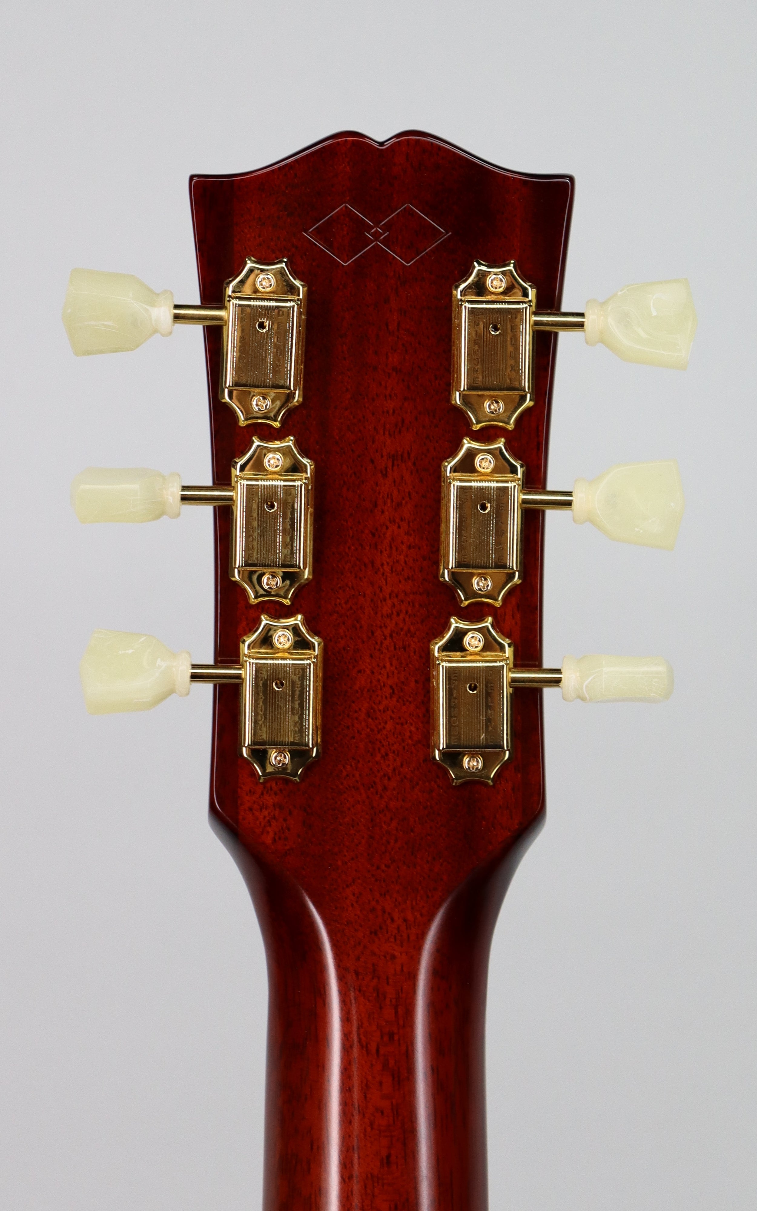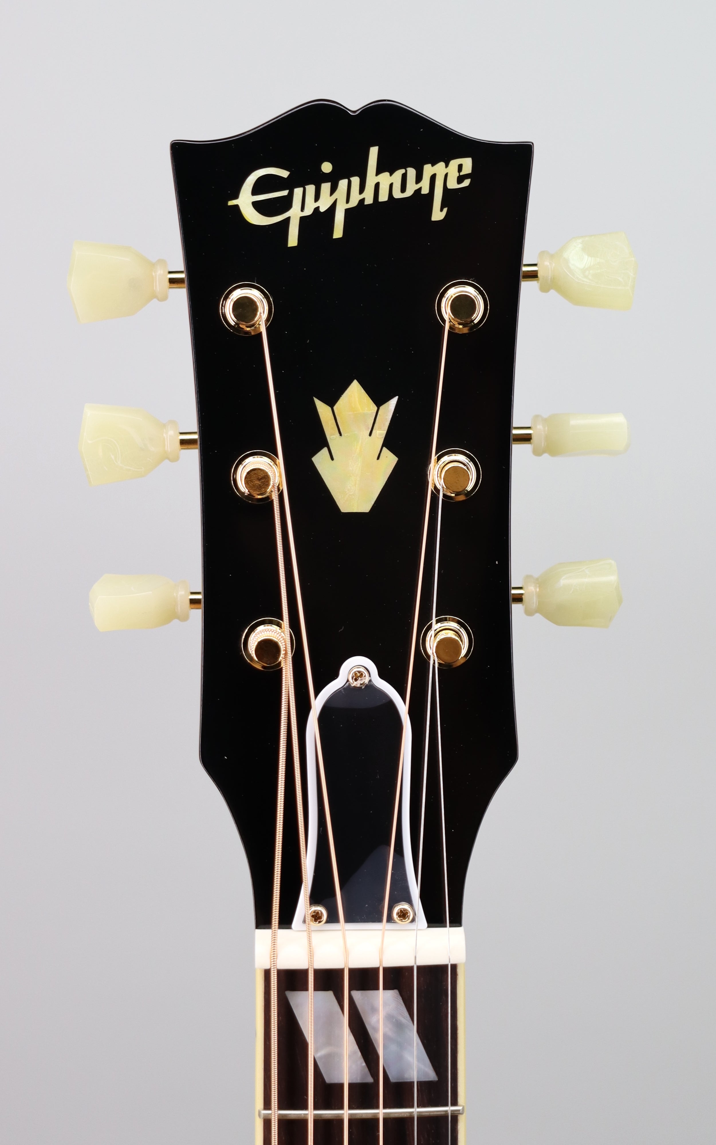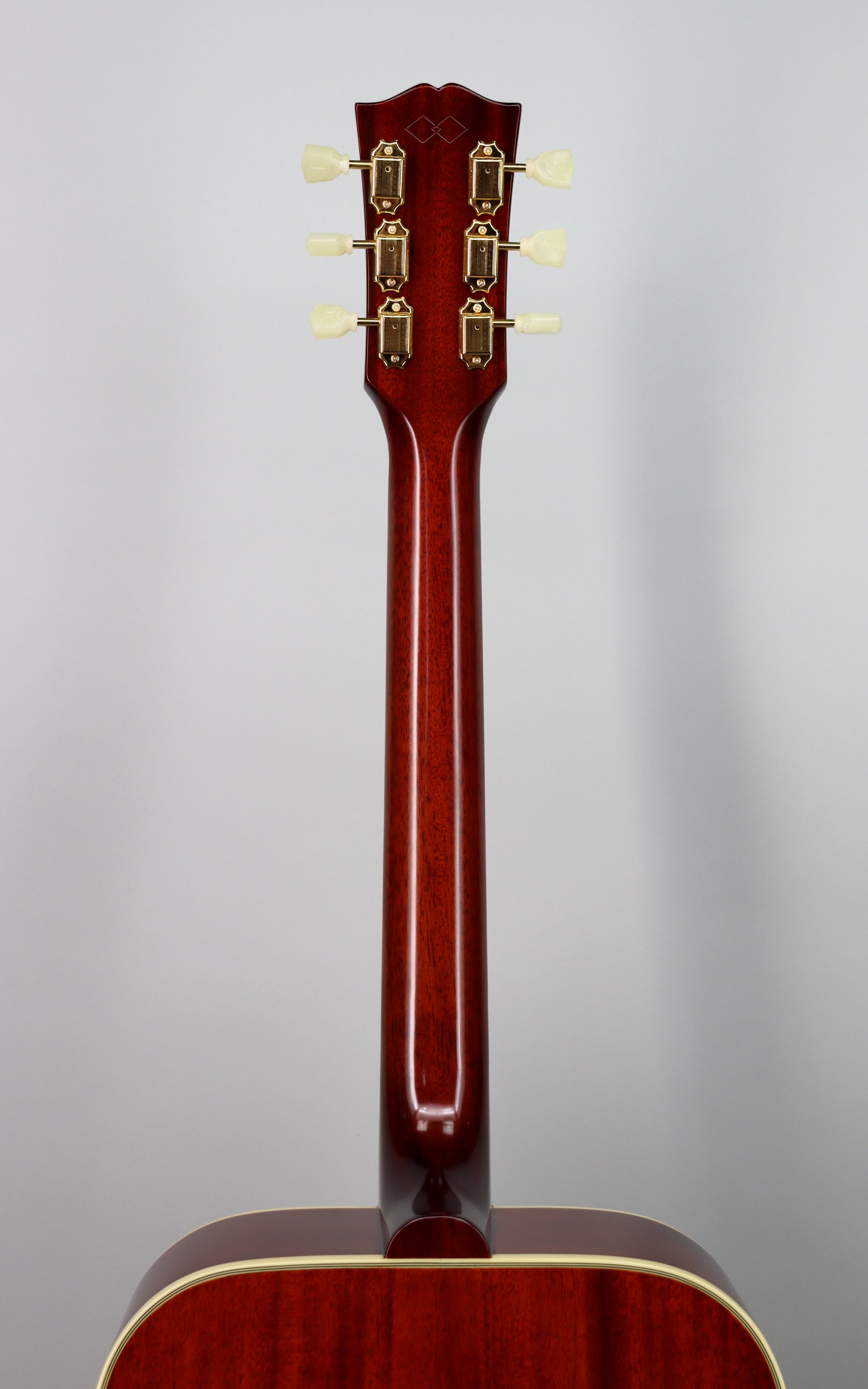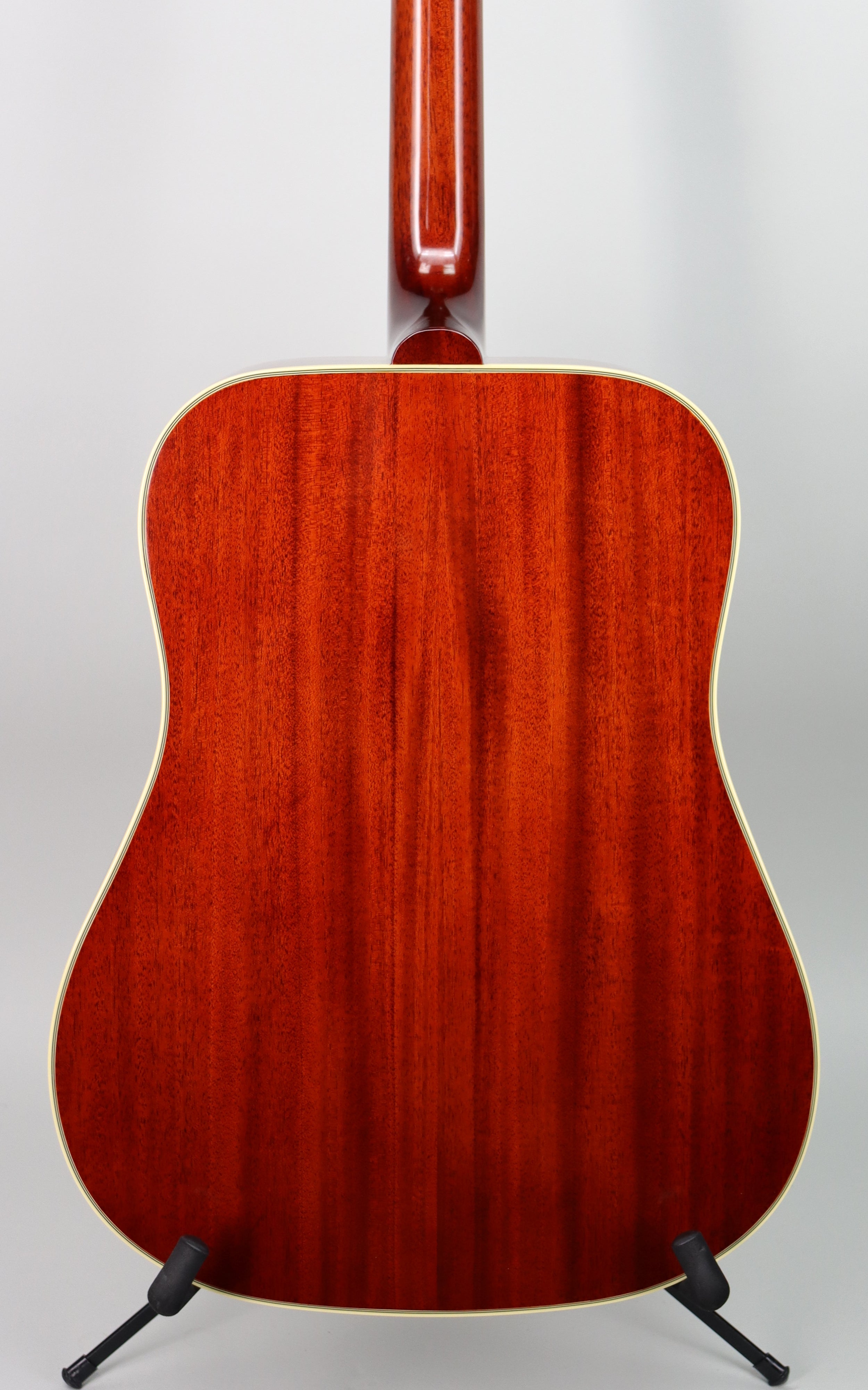 Specs: Solid mahogany body; thermally aged solid Sitka spruce top with traditional scalloped X‑brace; solid mahogany back and sides; multi‑ply top and back binding, single‑ply fretboard binding; one‑piece, thermally aged mahogany neck with rounded profile, dovetail joint; bound Indian rosewood fingerboard with 20 frets; 12″ fingerboard radius; 24.75″ scale; 1.74″ bone nut; compensated bone saddle on rosewood belly‑up bridge; Epiphone Deluxe tuners with green keystone buttons; dual‑action truss rod, 2‑ply bell cover; bone bridge pins; classic engraved Hummingbird pickguard. Vintage Gloss Heritage Cherry Sunburst finish. Includes Red‑Line inspired hardshell case with Inspired by Gibson Custom graphics.