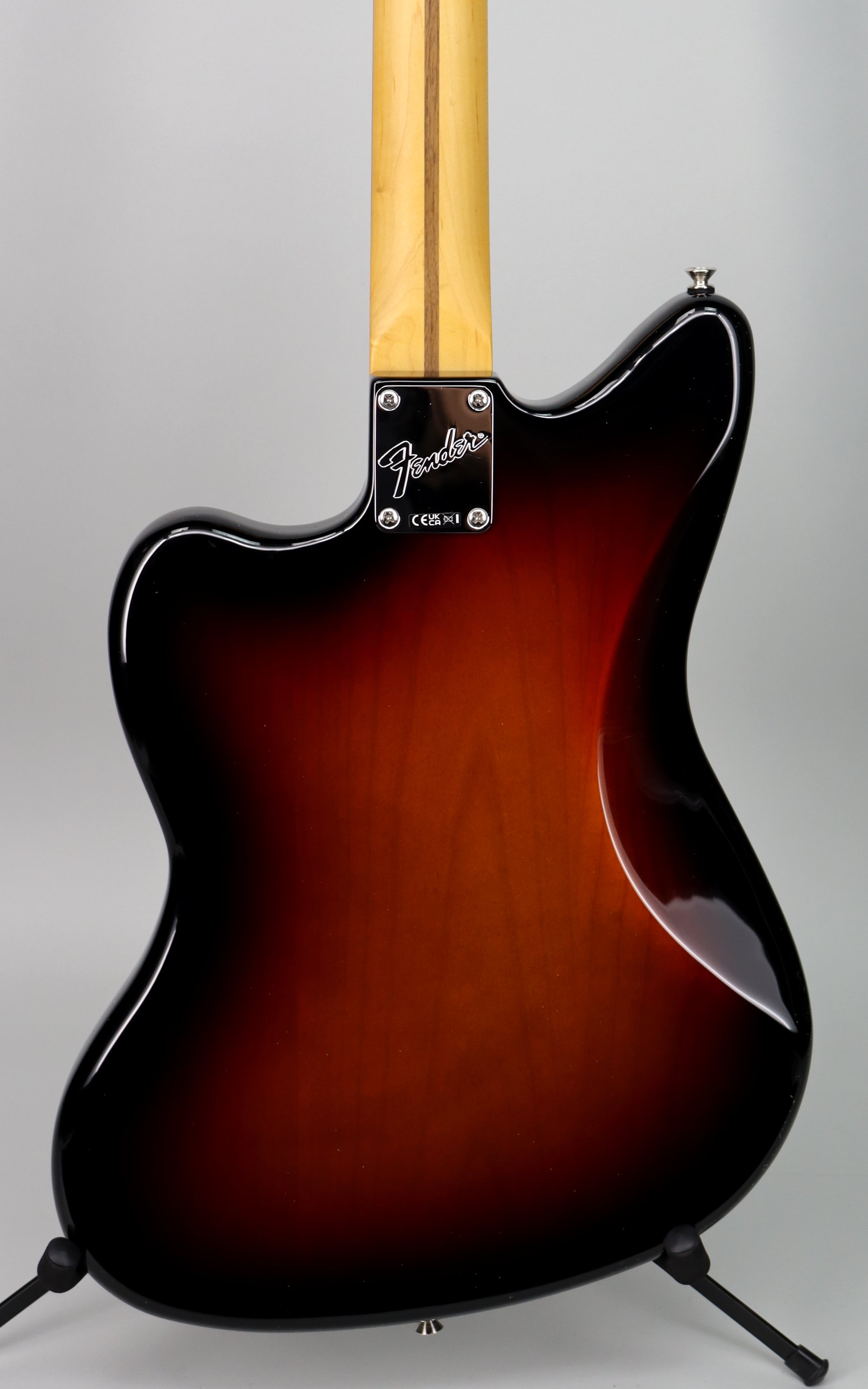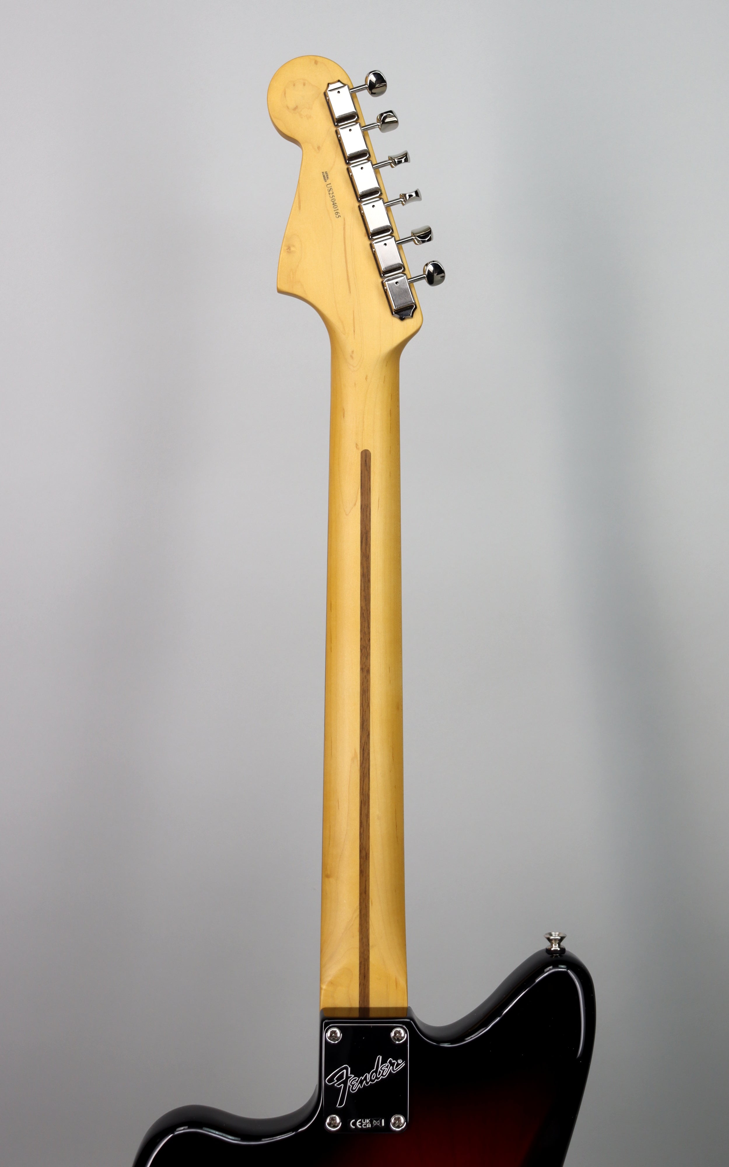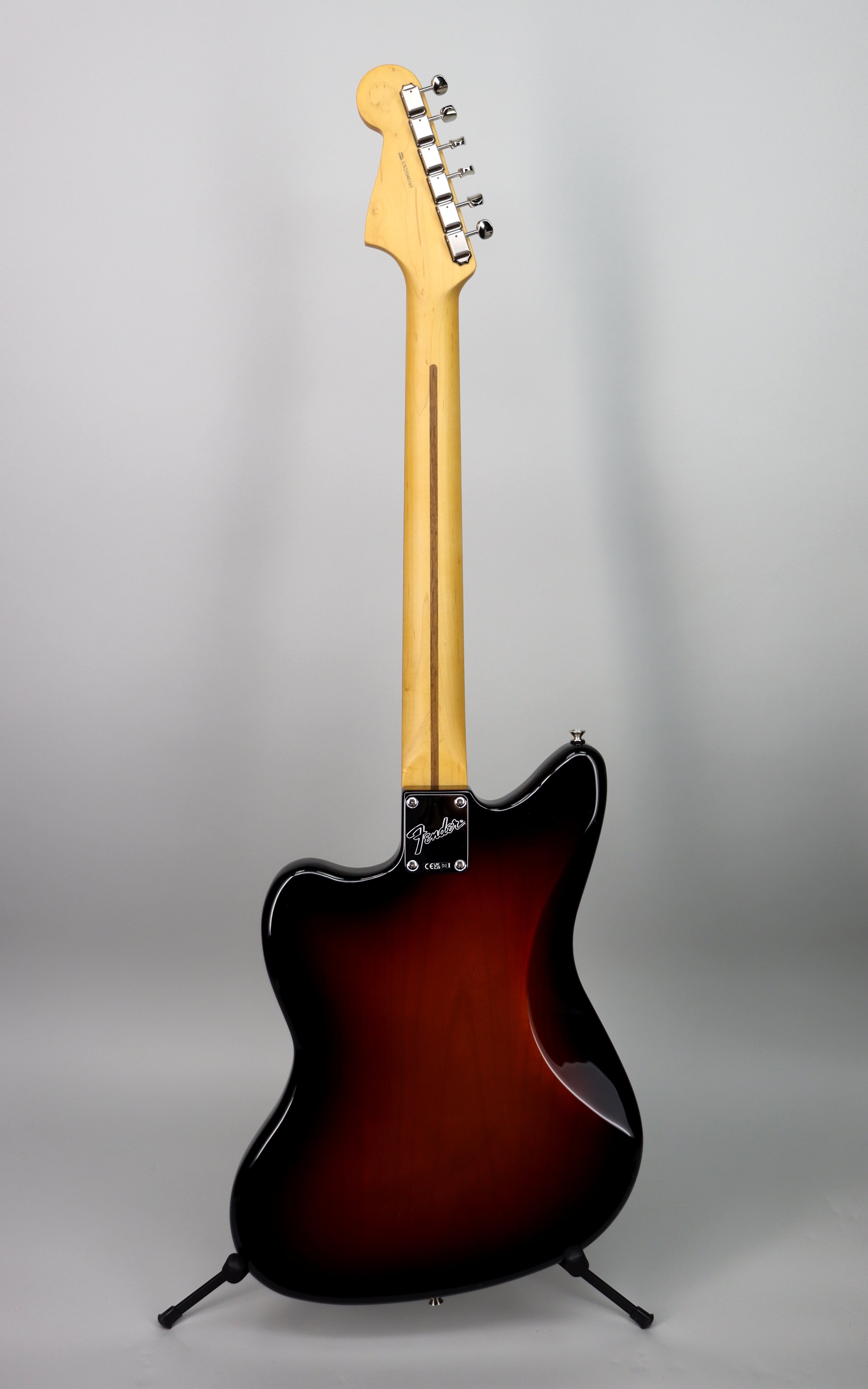 Specs: Alder body; satin maple Modern "C" neck; rosewood 9.5" radius fingerboard; 25.5" scale length; 22 medium jumbo frets; synthetic bone nut; 1.685" nut width; ; Jazzmaster® bridge with Mustang® saddles and vintage-style “floating” tremolo tailpiece; nickel/chrome hardware. Satin urethane 3-Tone Sunburst finish. Fender gigbag..