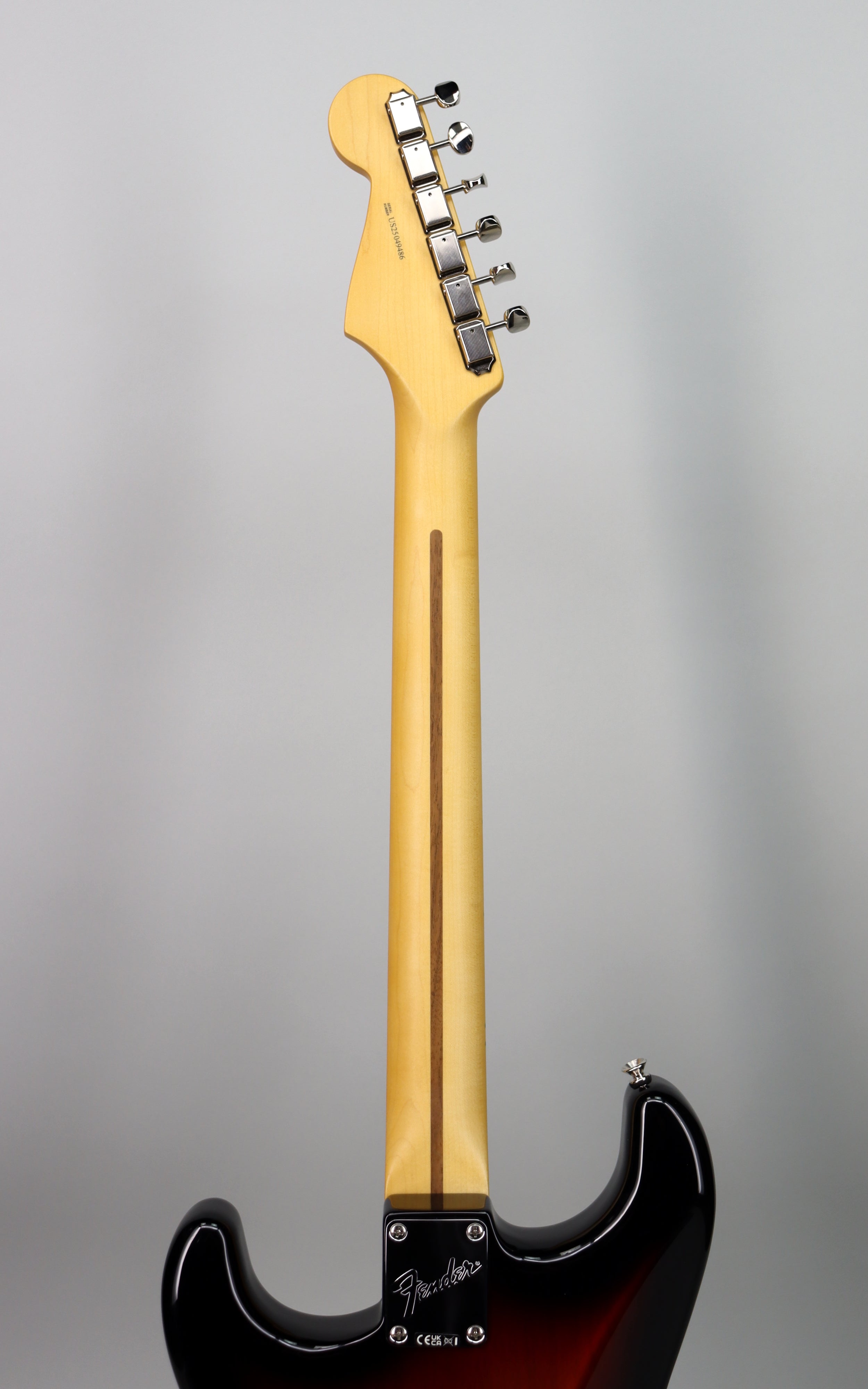 Specs: Alder body; maple Modern “C” neck with satin urethane finish; maple fingerboard; 9.5" fingerboard radius; 22 medium jumbo frets; synthetic bone nut; 1.685" nut width; 25.5" scale length; 6-saddle vintage-style synchronized tremolo bridge with 6-screw mounting; 3-ply black/white/black pickguard; nickel/chrome hardware with aged white knobs, pickup covers, and switch tip; Fender ClassicGear™ staggered tuners; vintage-style strap buttons. Gloss urethane 3-Tone Sunburst finish.