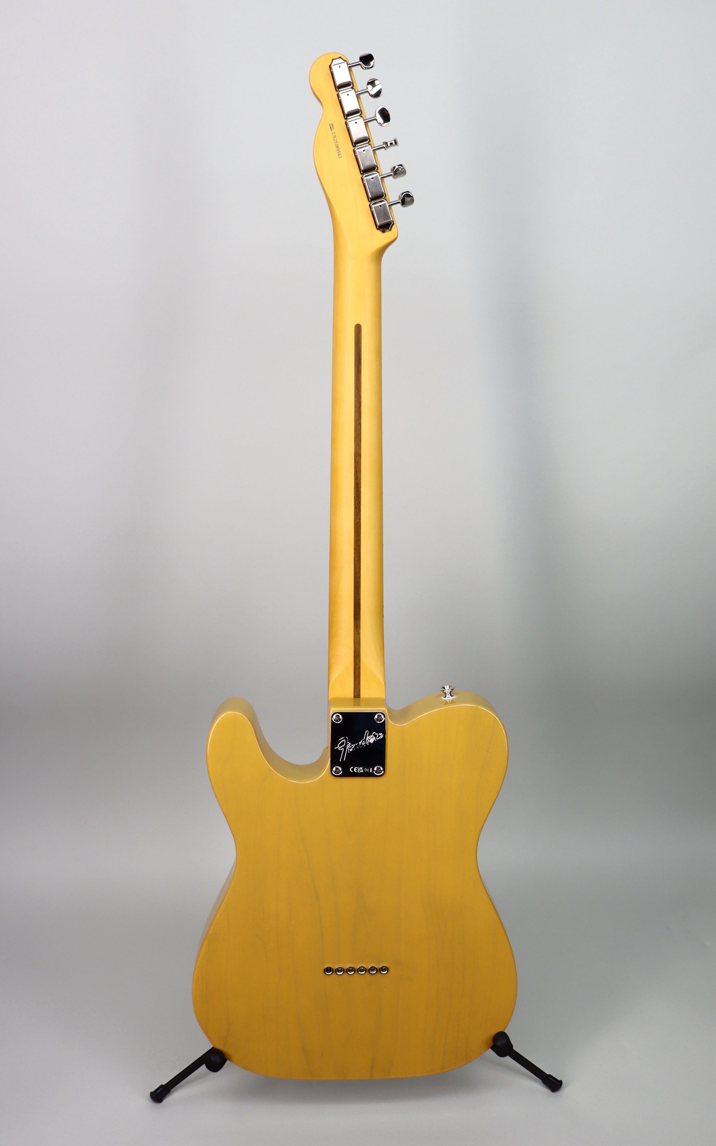 Specs: Solid alder body; maple Moden "C" neck with satin urethane finish; maple fingerboard; 9.5" fingerboard radius; 25.5" scale length; 22 medium jumbo frets; synthetic bone nut; 1.685" nut width; 3-saddle vintage-style Tele® bridge with slotted brass barrel saddles; 1-ply black pickguard; Fender® ClassicGear™ staggered tuning machines; dual-wing string trees; nickel/chrome hardware. Gloss urethane Butterscotch Blonde finish. Deluxe gigbag.