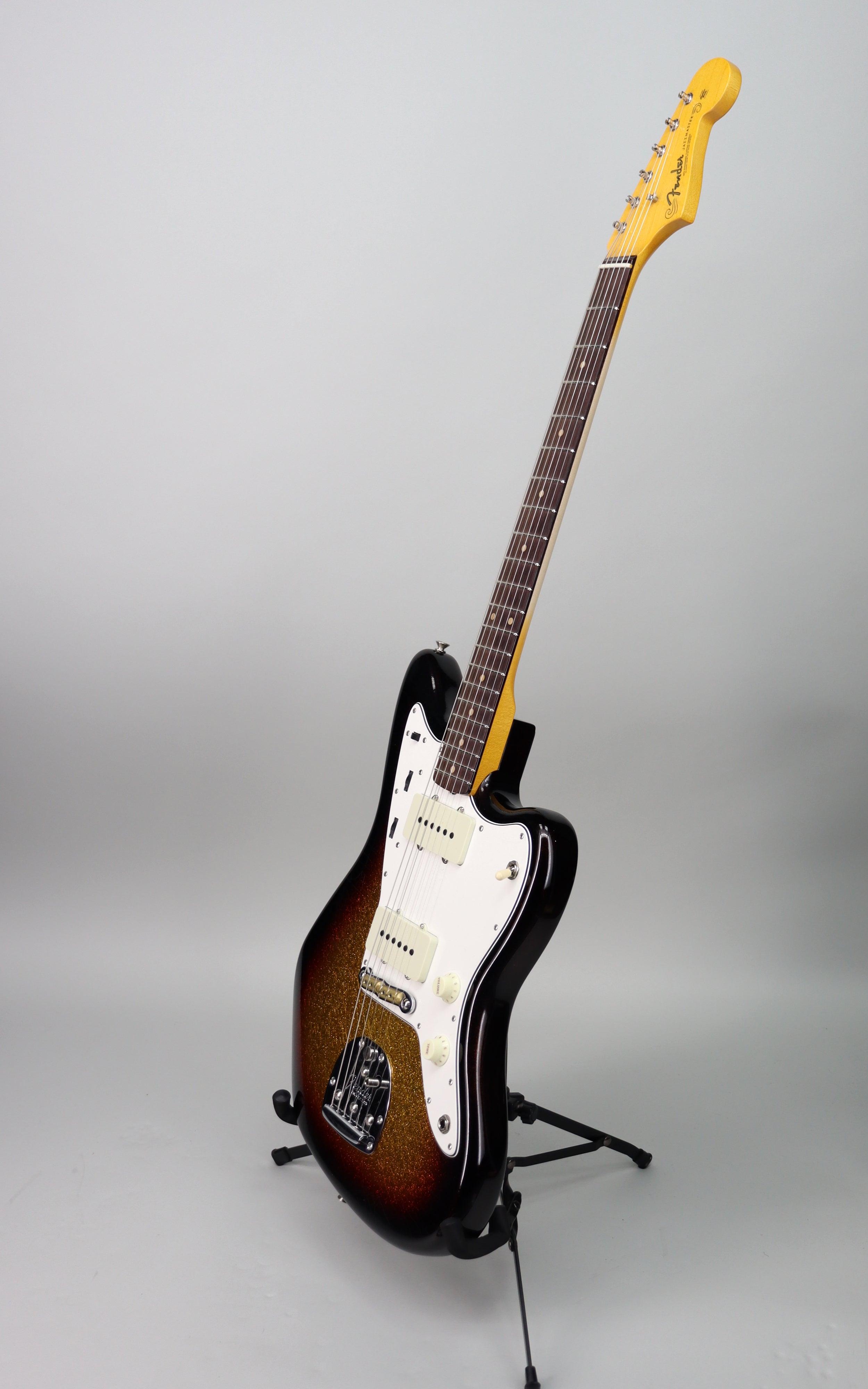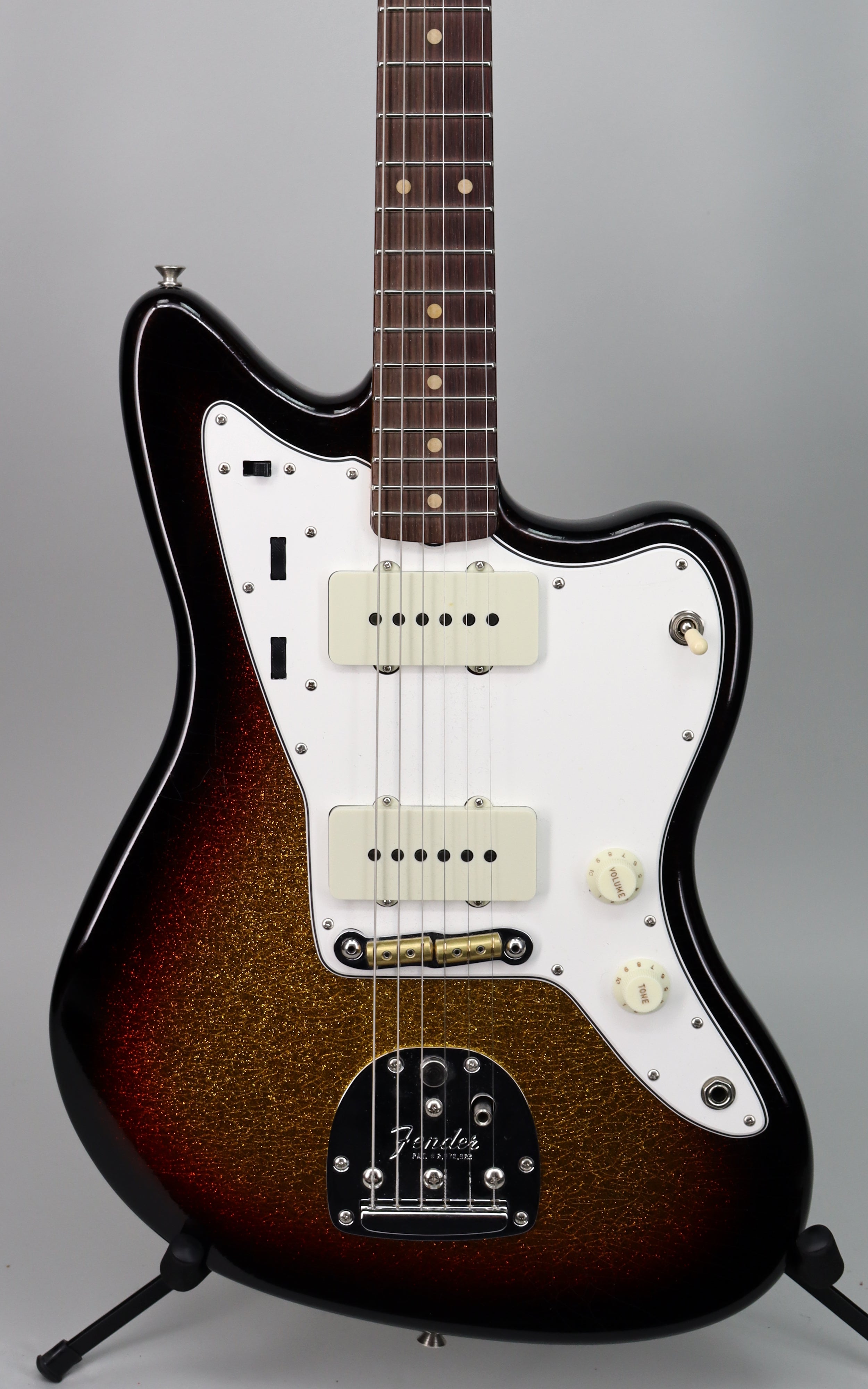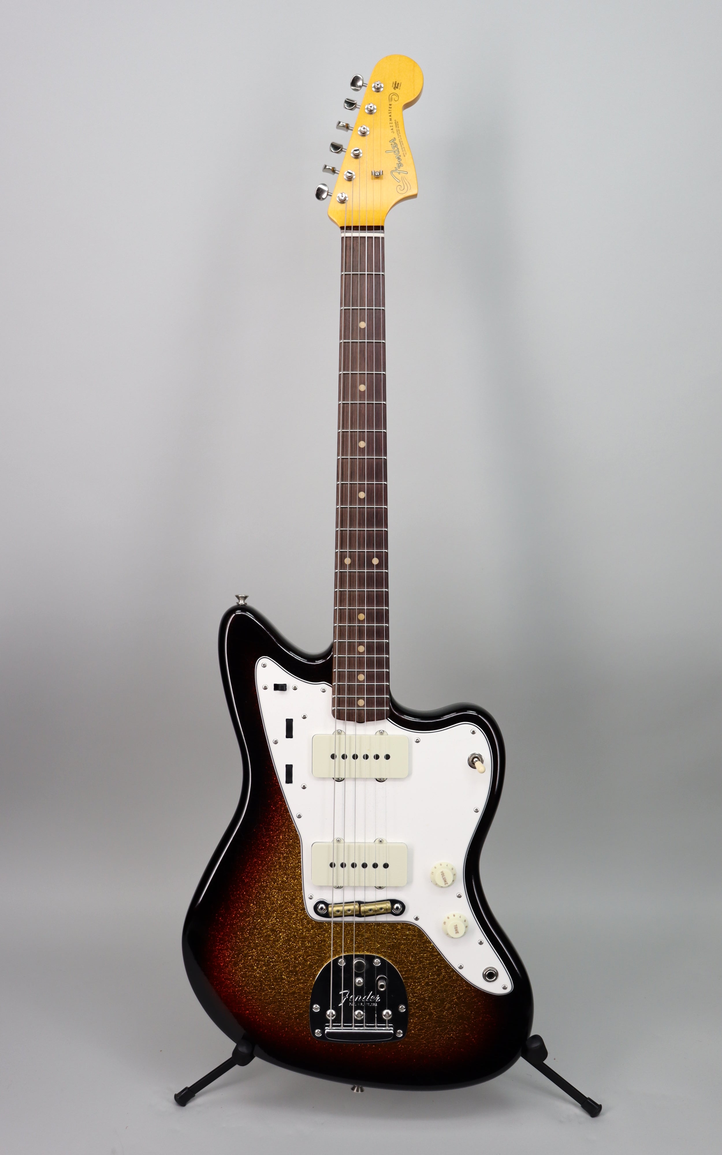 Specs: 2-piece select light weight alder body; ’62 Jazzmaster body style; maple ’65 Strat “C” neck shape; slab AAA-grade rosewood fingerboard with vintage clay dots and wide dot spacing; 7.25"–9.50" compound radius; 21 narrow tall (6105) frets; 1.650" bone nut; 4-bolt neck; vintage-style tuners with Fender logo; chrome/nickel hardware; RSD Jaguar/Jazzmaster bridge; vintage-style tremolo arm. Nitrocellulose lacquer Relic Aged 3-Tone Sunburst Sparkle finish. Fender Custom Shop brown Jazzmaster/Jaguar case.
