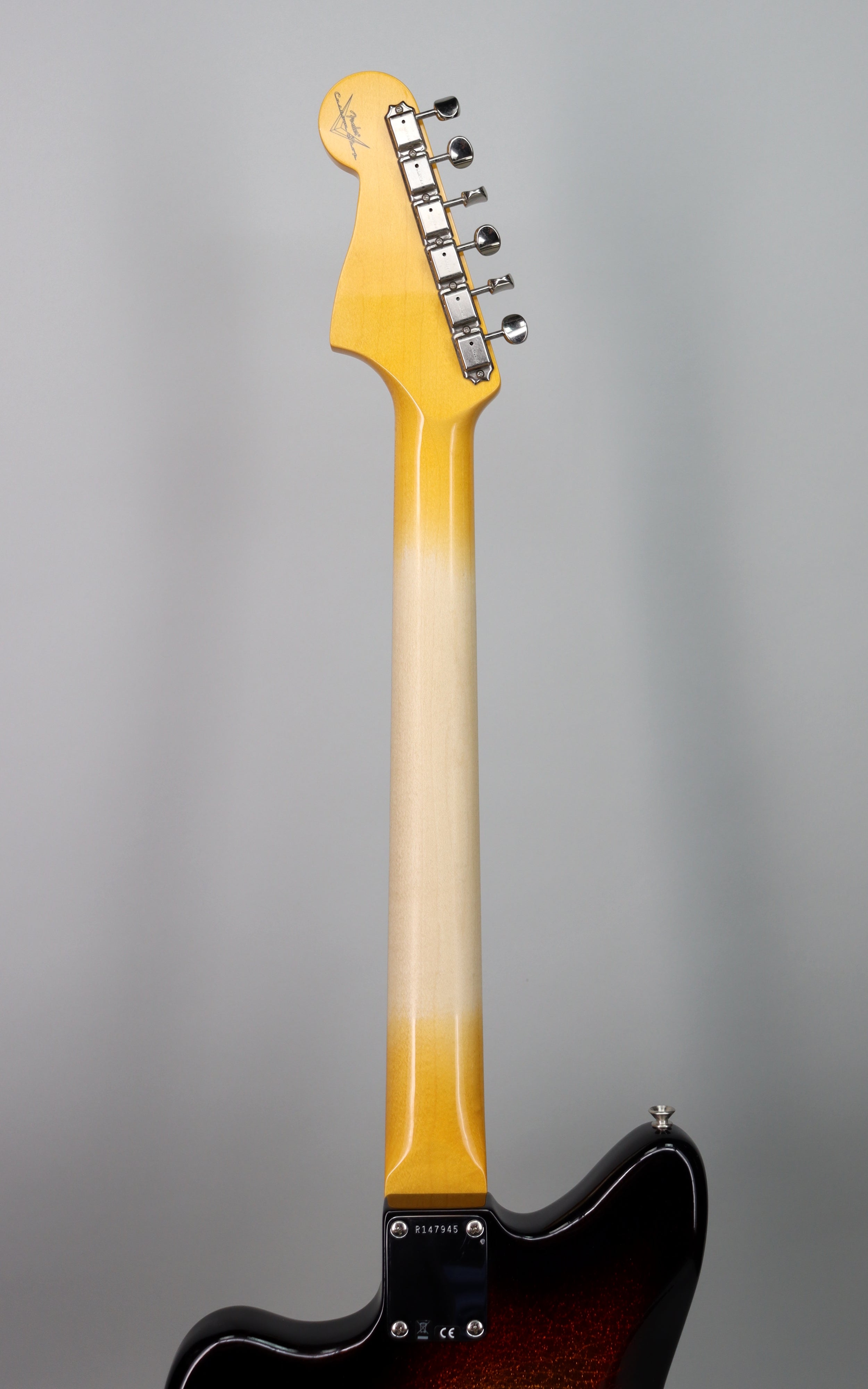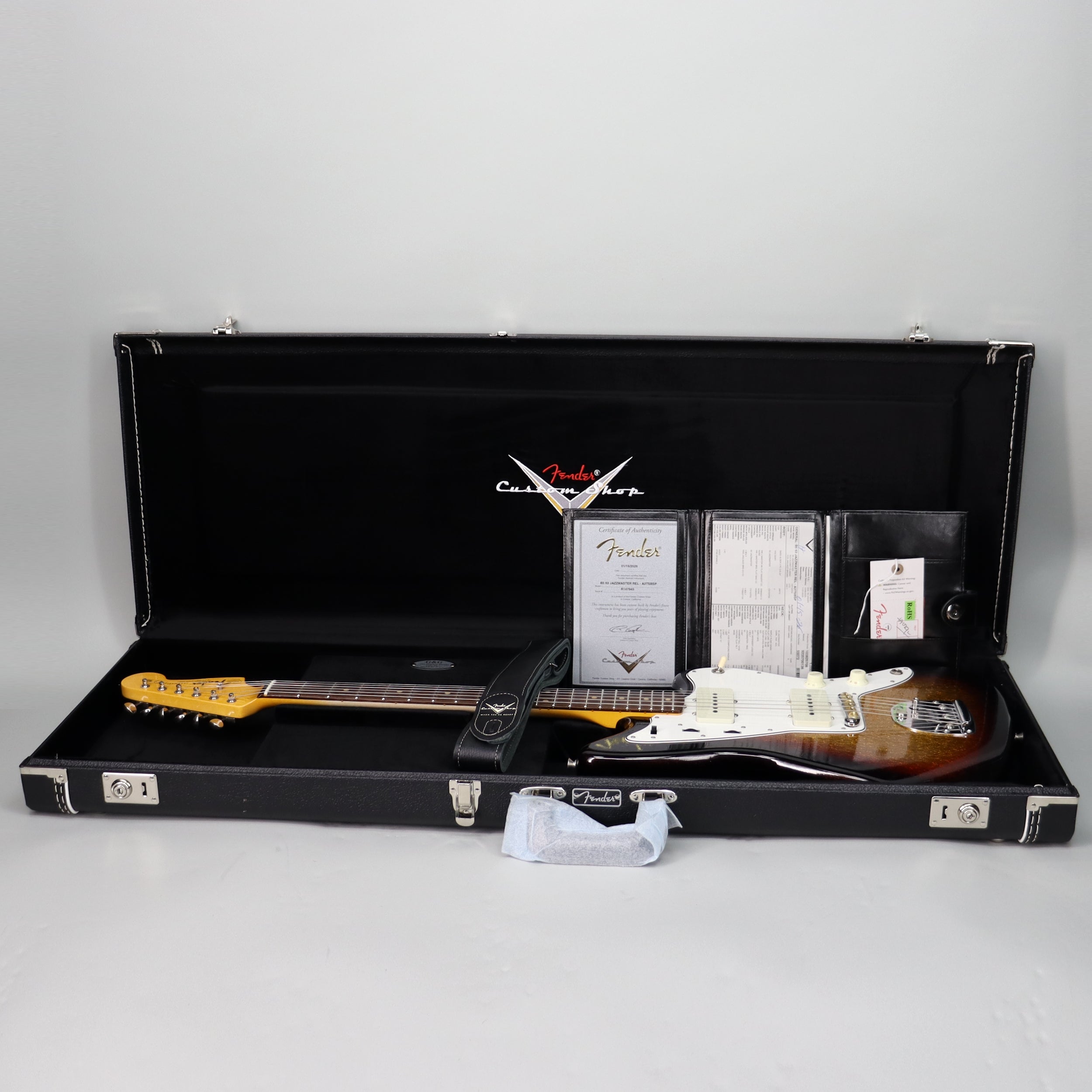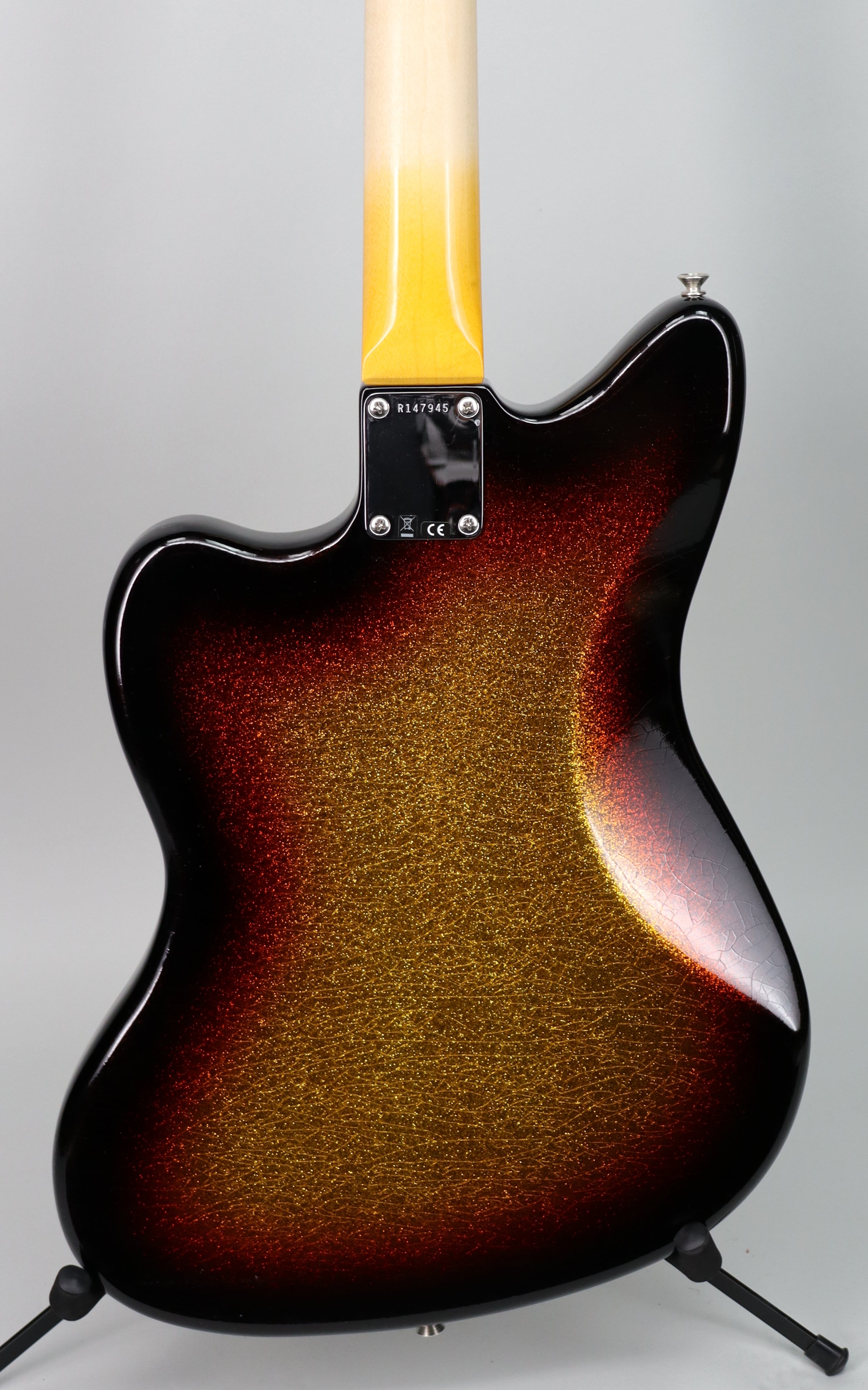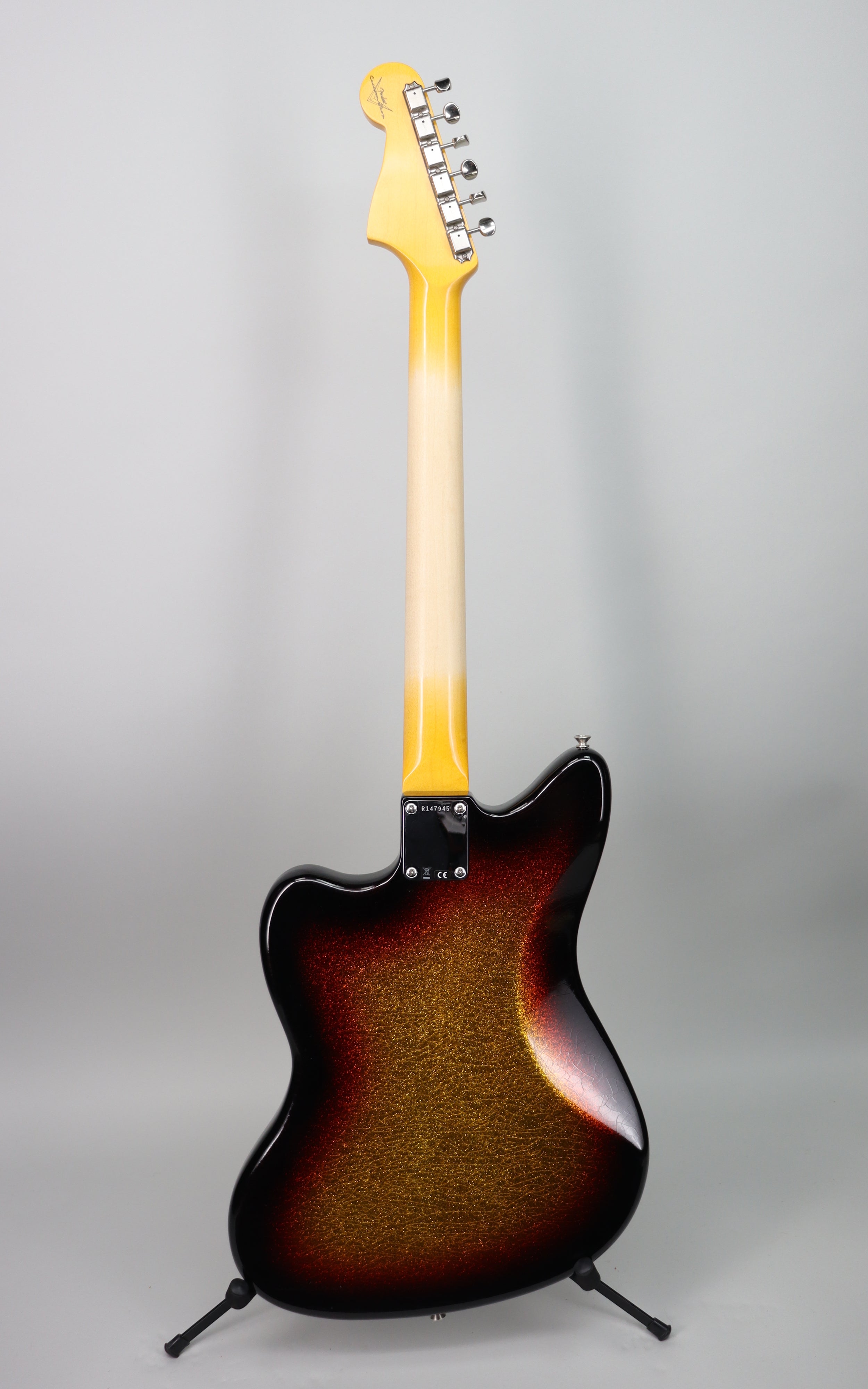 Specs: 2-piece select light weight alder body; ’62 Jazzmaster body style; maple ’65 Strat “C” neck shape; slab AAA-grade rosewood fingerboard with vintage clay dots and wide dot spacing; 7.25"–9.50" compound radius; 21 narrow tall (6105) frets; 1.650" bone nut; 4-bolt neck; vintage-style tuners with Fender logo; chrome/nickel hardware; RSD Jaguar/Jazzmaster bridge; vintage-style tremolo arm. Nitrocellulose lacquer Relic Aged 3-Tone Sunburst Sparkle finish. Fender Custom Shop brown Jazzmaster/Jaguar case.