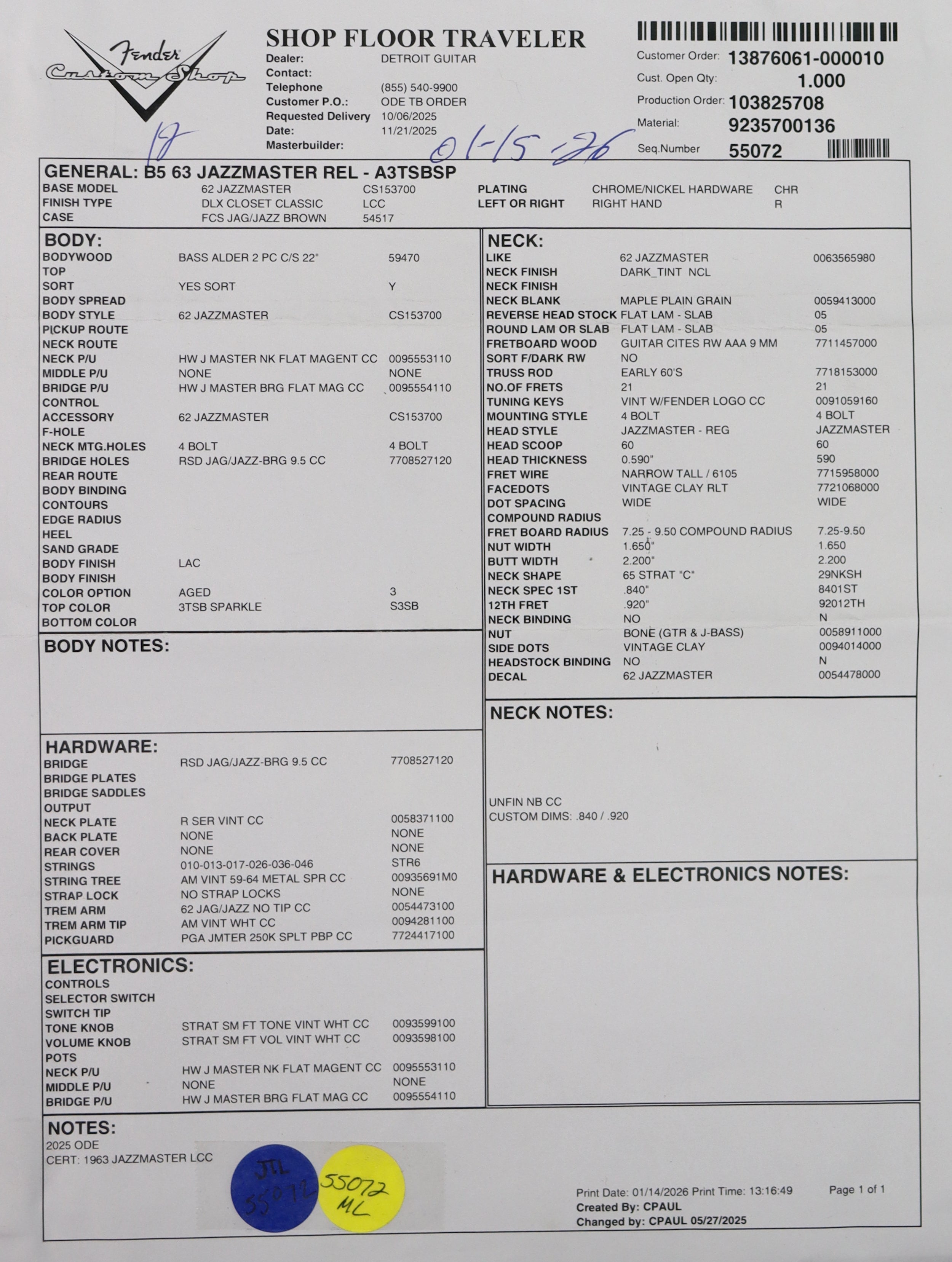 Built for Detroit Guitar, this Fender Custom Shop ’63 Jazzmaster nails that early-’60s offset feel with a Deluxe Closet Classic vibe—played-in and broken-in, but still classy. A 2-piece select alder body delivers the snap and midrange you want from a great Jazzmaster, while the hand-wound flat-magnet Jazzmaster pickups bring the chime, width, and articulate bite that makes these guitars so addicting for clean tones, edge-of-breakup textures, and fuzzy leads. The ’65 Strat “C” neck carve with a 7.25"–9.50" compound radius and narrow tall (6105) frets gives you that vintage comfort down low, with an easier feel up the neck when you lean into bends.