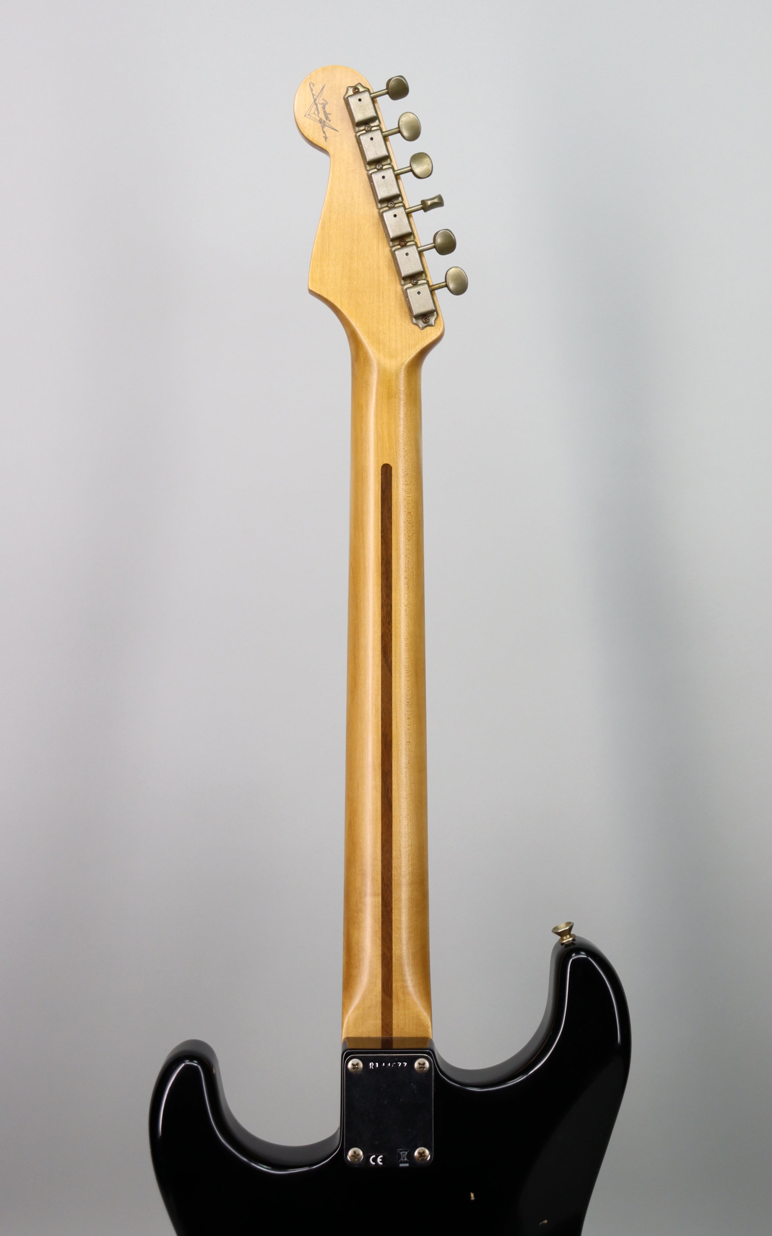 Specs: Light weight alder body with swimming pool routing; maple rift-sawn neck with adjusted ’60s Oval “C” profile (.810”–.940”) and satin back; AAA-grade rosewood fingerboard; 9.5”-12" compound fingerboard radius; 22 6105 narrow tall frets; bone nut; 1.687" nut width; shielded cavities. Nitrocellulose lacquer Journeyman Relic Aged Black finish. Fender Custom Shop case, COA, Floor Traveler and case candy.