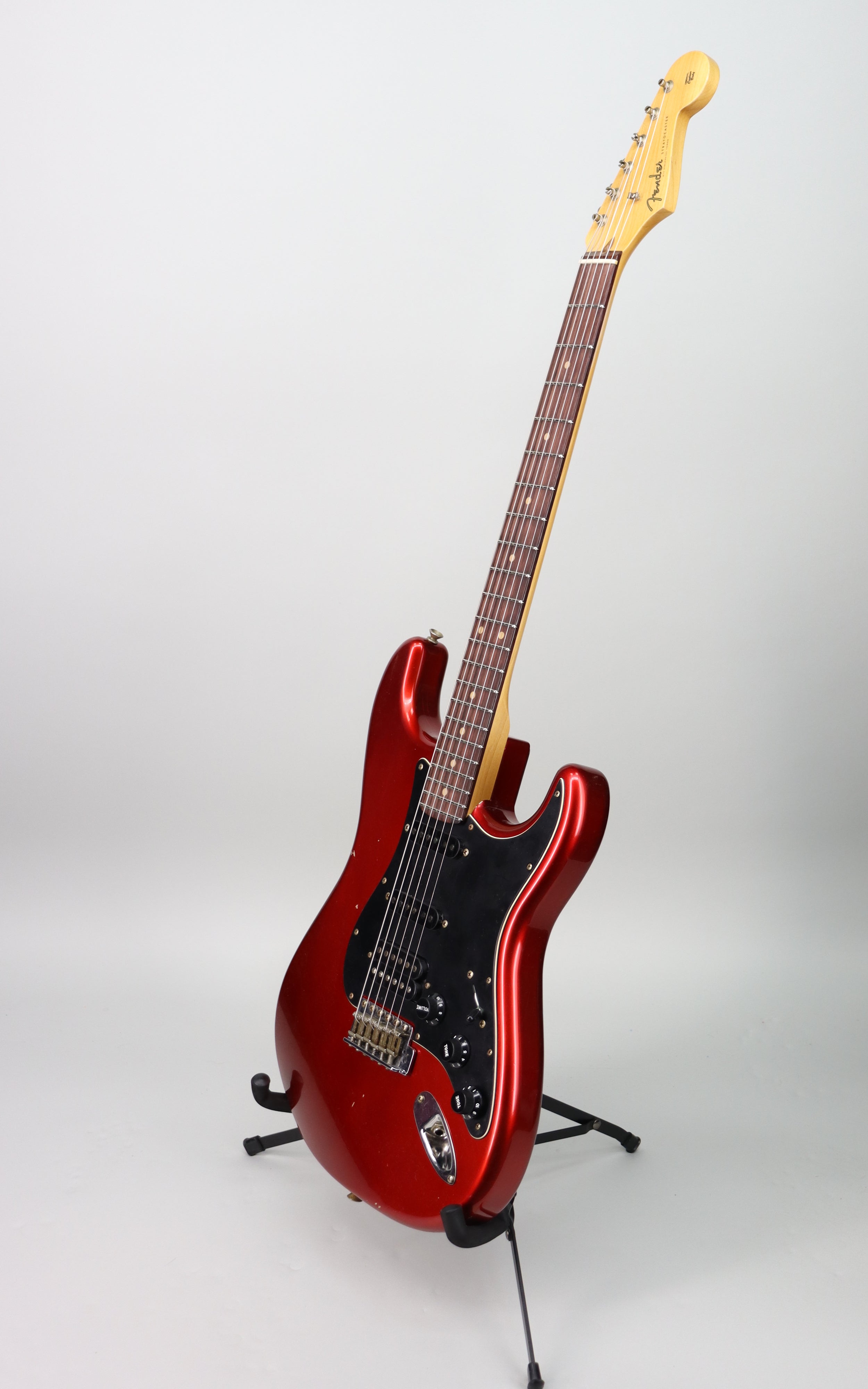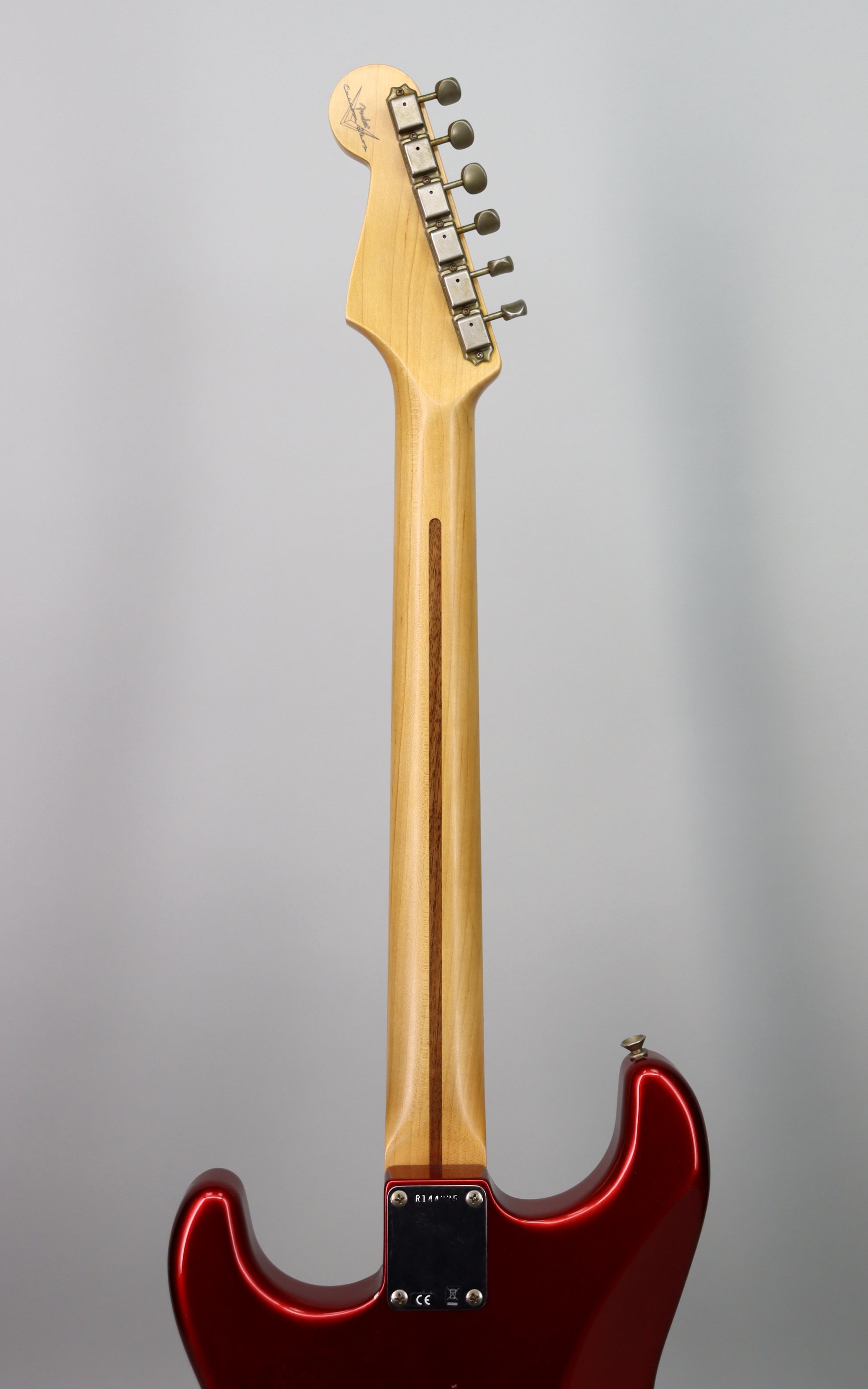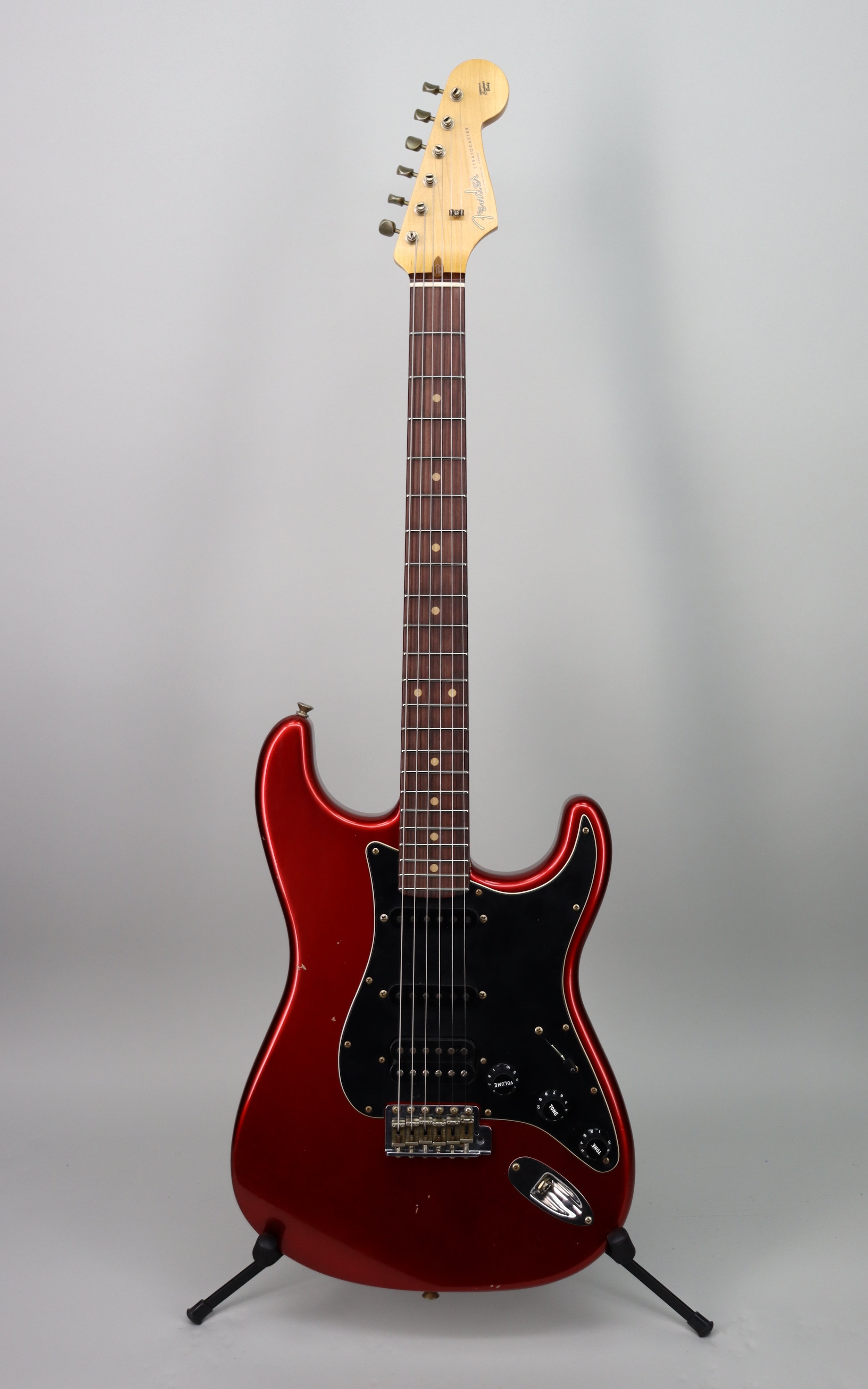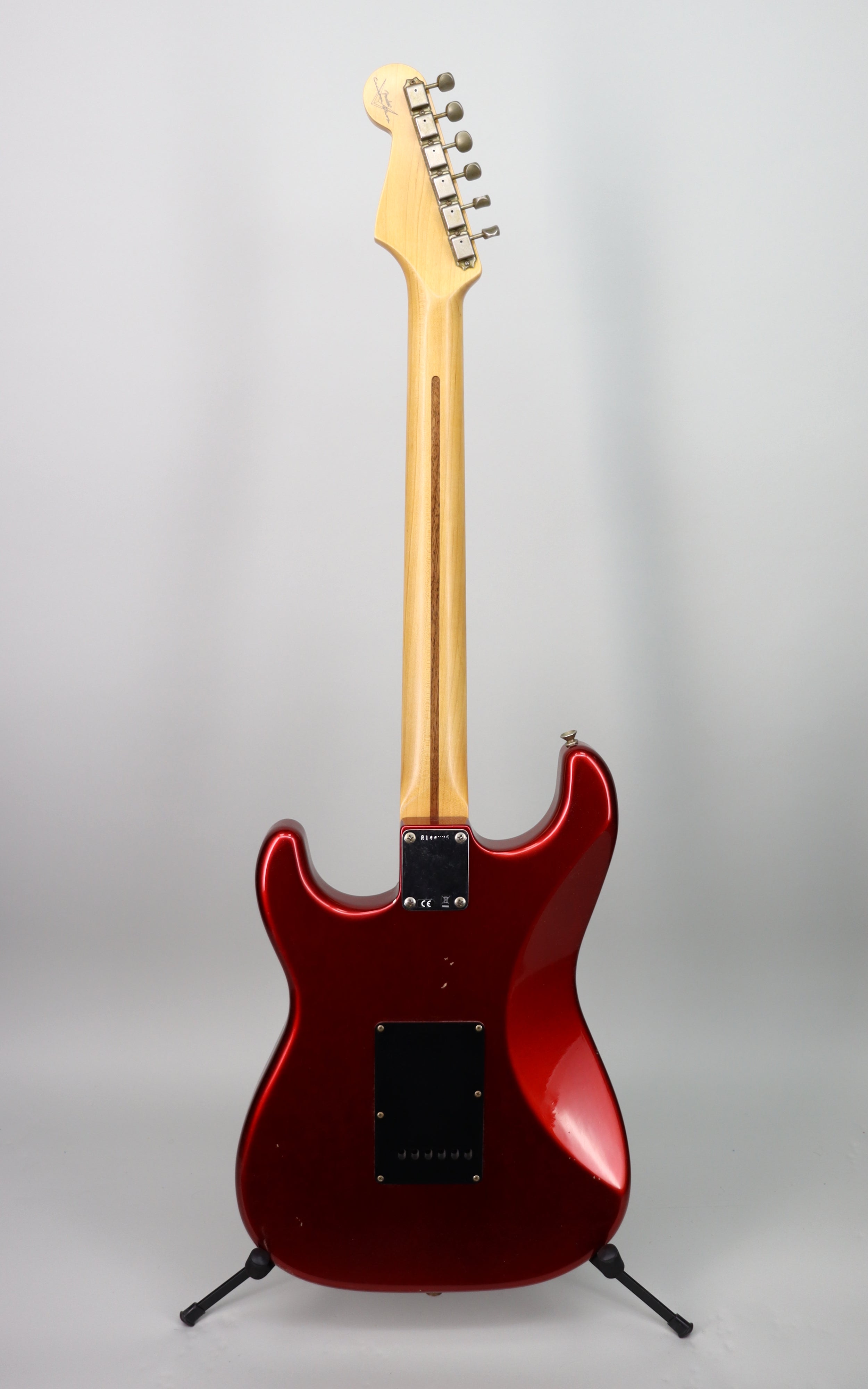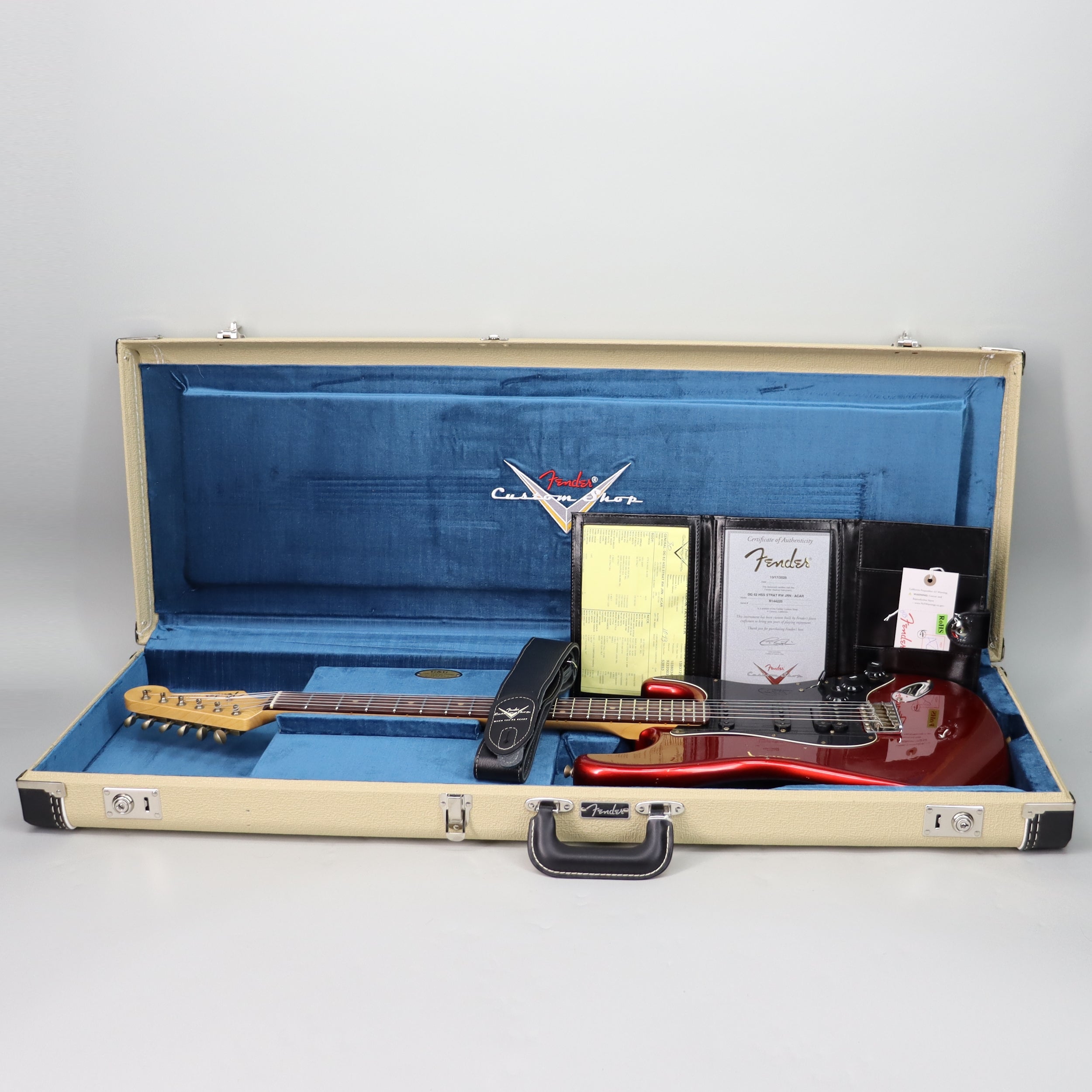 Specs: Light weight alder body with swimming pool routing; maple rift-sawn neck with adjusted ’60s Oval “C” profile (.810”–.940”) and satin back; AAA-grade rosewood fingerboard; 9.5”-12" compound fingerboard radius; 22 6105 narrow tall frets; bone nut; 1.687" nut width; shielded cavities. Nitrocellulose lacquer Journeyman Relic Aged Candy Apple Red finish. Fender Custom Shop case, COA, Floor Traveler and case candy.