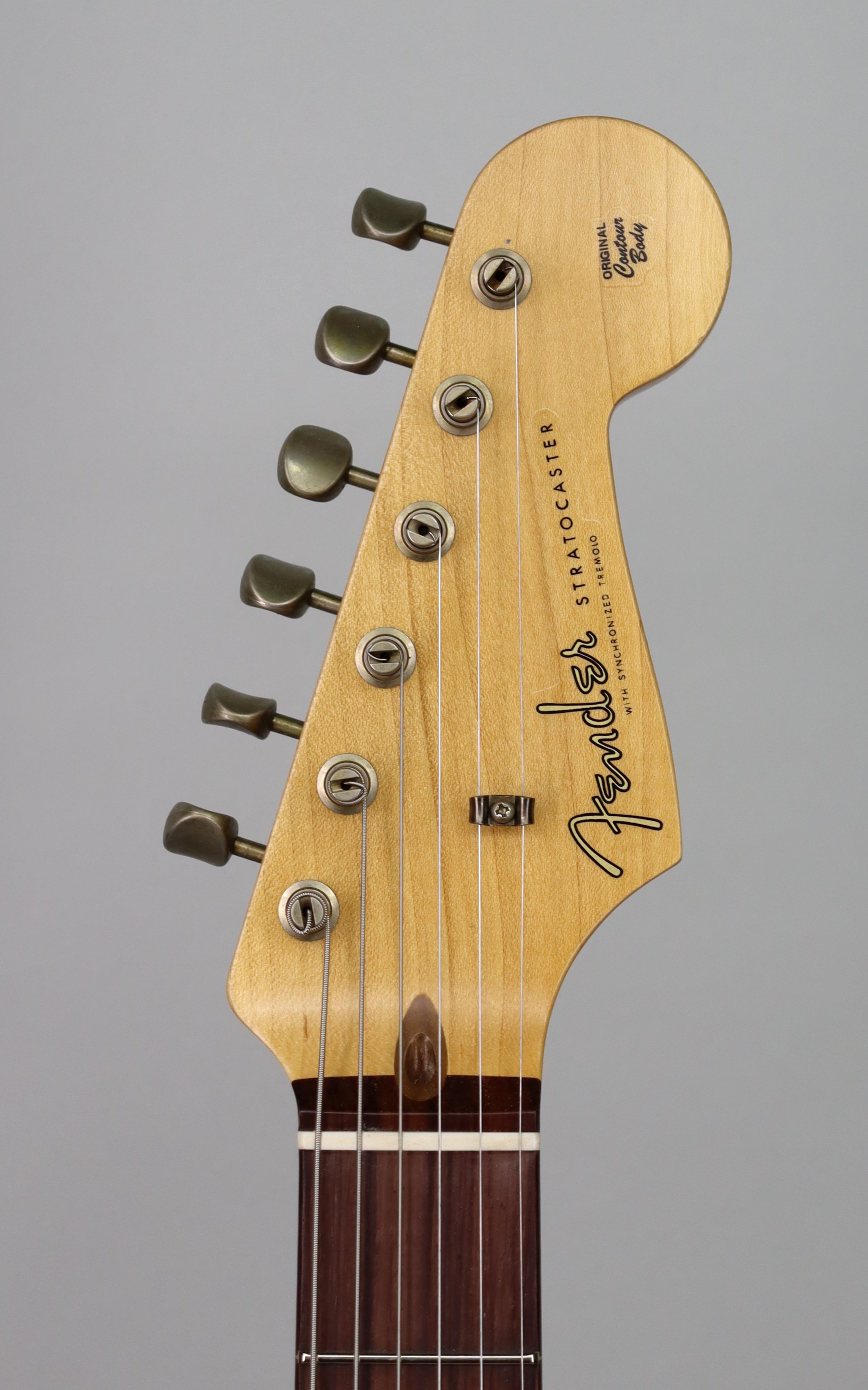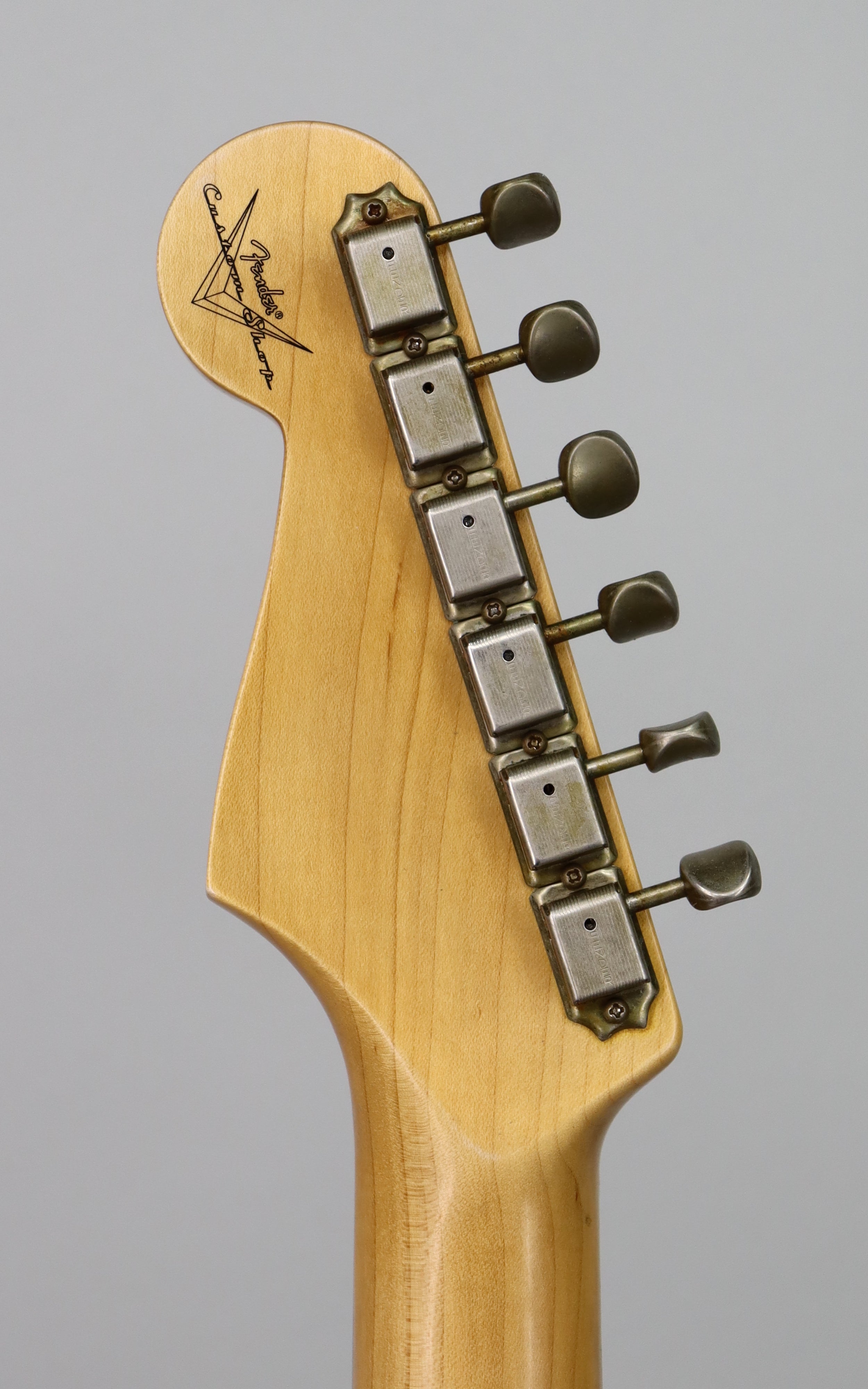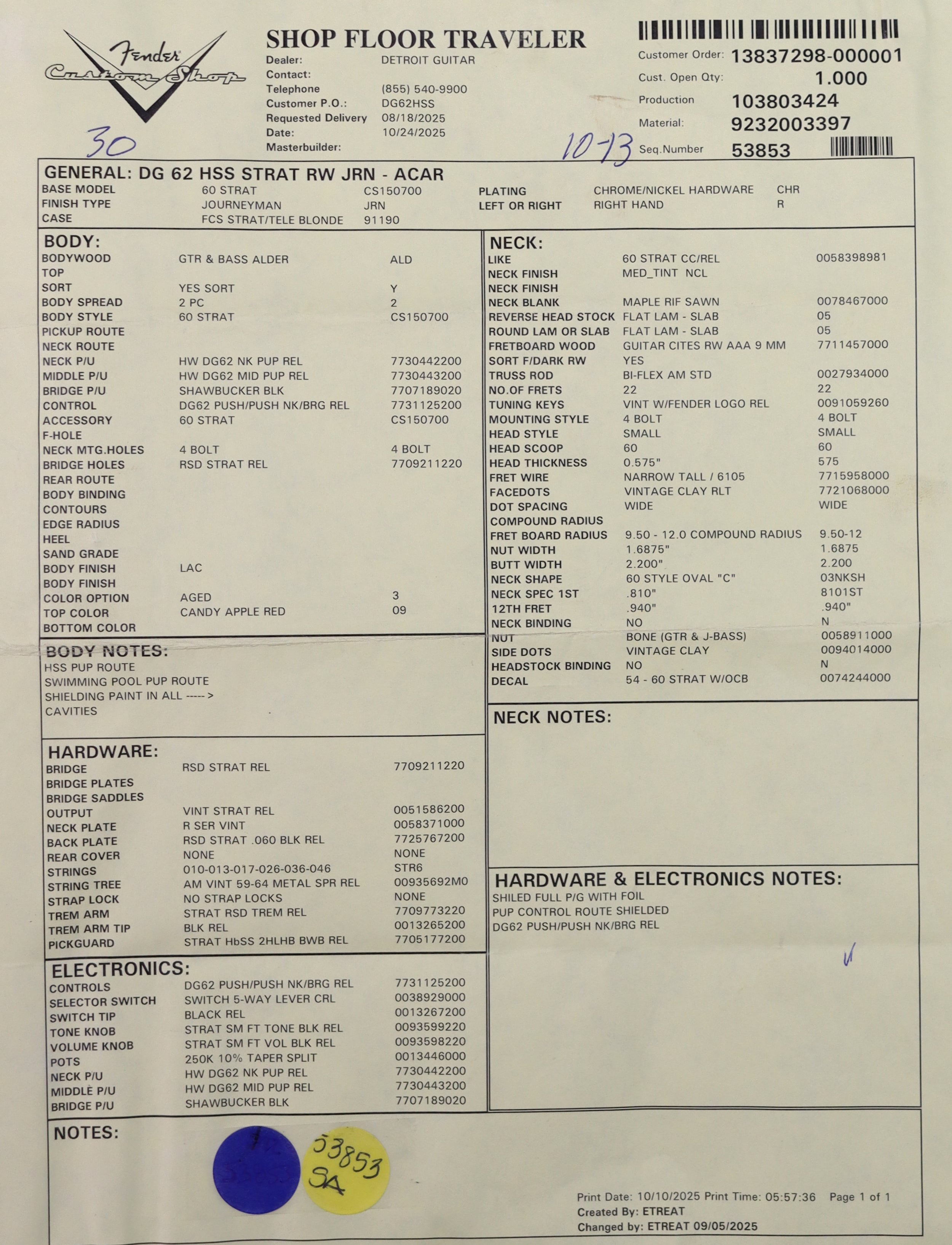 This Fender Custom Shop Dealer Select ’62 Stratocaster HSS Journeyman Relic in Aged Candy Apple Red is one of Detroit Guitar’s exclusive Dealer Select builds—made only for Detroit Guitar and featuring a set of very special specs. At its core are custom Hand-Wound ’62 Strat single-coil pickups (DG62S),in the middle and neck position for a perfectly balanced tonal palette. The bridge pickup is a Shawbucker humbucker. Additional enhancements include truss rod access through the headstock, modern string spacing, a push/push tone control that allows the bridge and neck pickups to be engaged together, a versatile swimming pool routing with full wire shielding, and an adjusted ’60s Oval “C” neck carve measuring .810”–.940” for authentic yet refined feel.