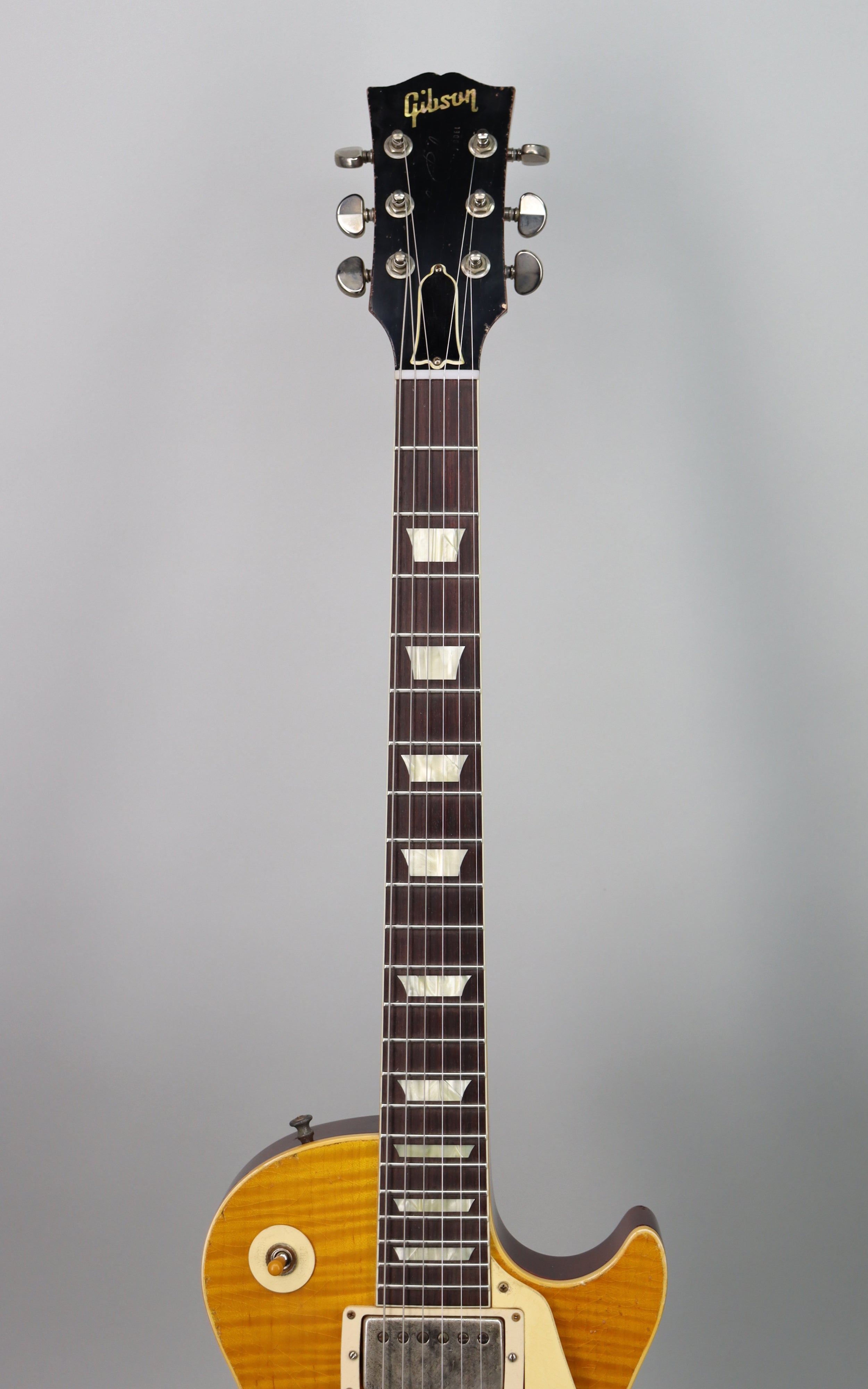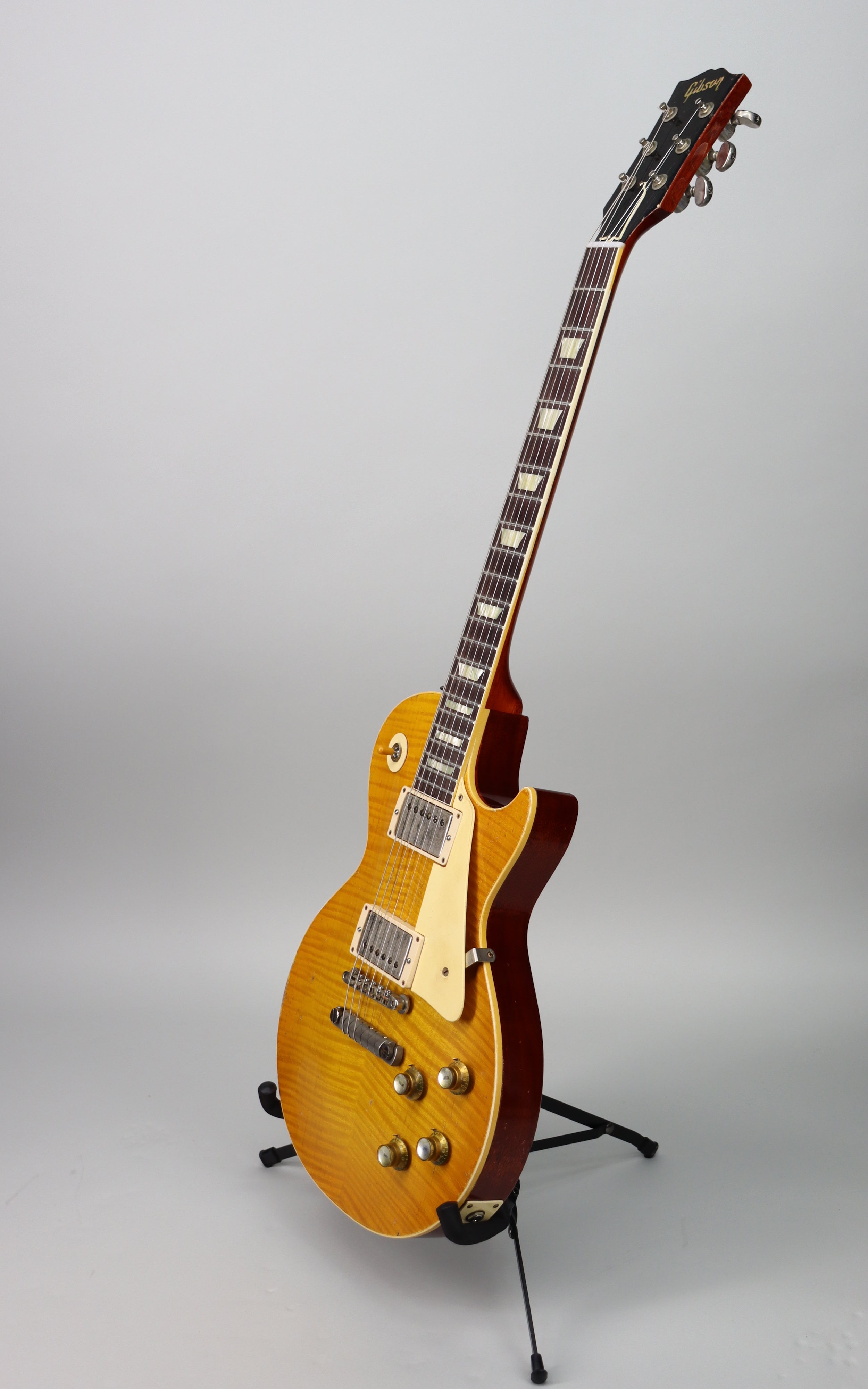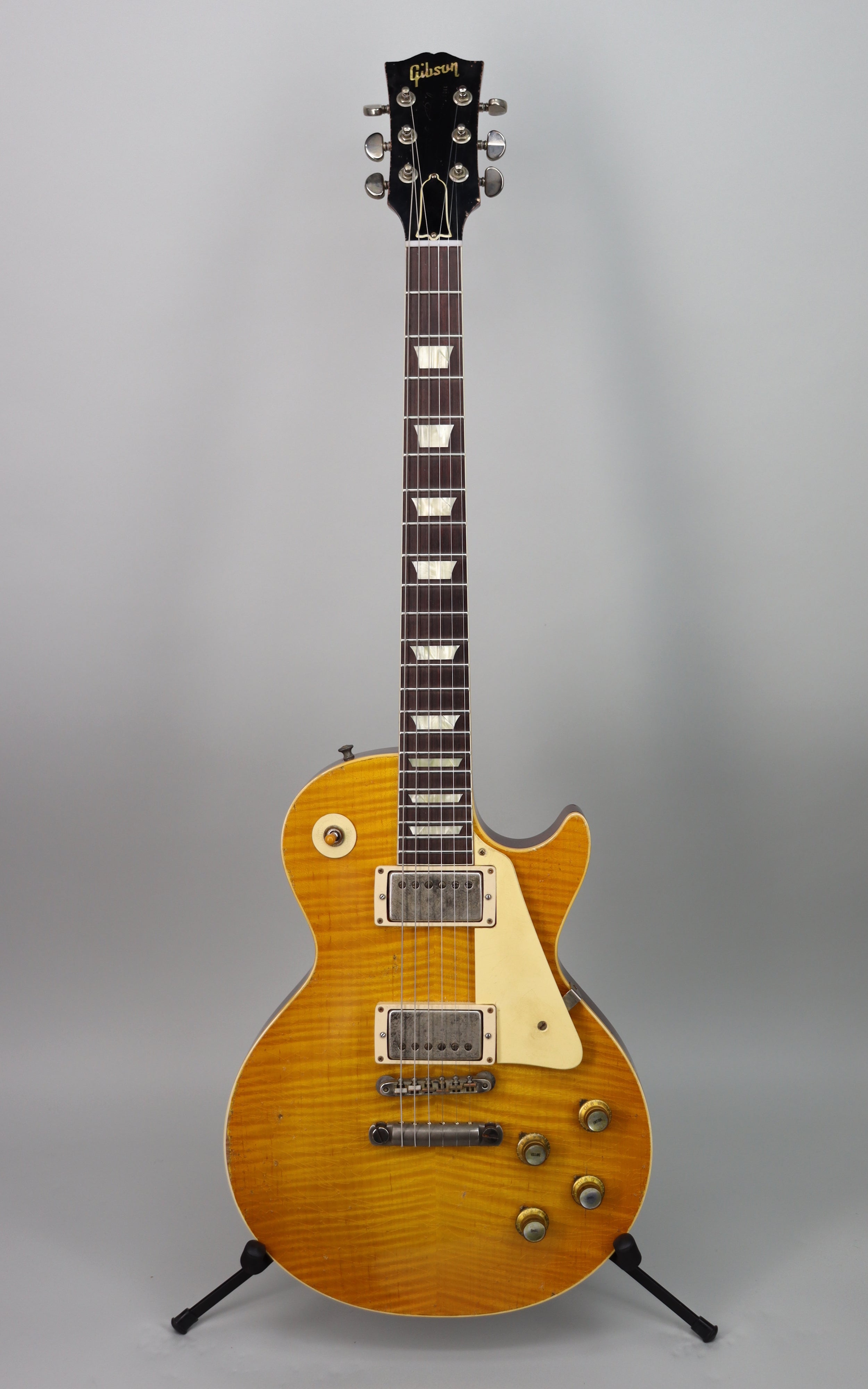 Specs: 1-piece light weight mahogany body; 2-piece hand-selected figured maple top; solid mahogany V3 neck; 24.75" scale length; Indian rosewood fingerboard with hide glue fit; 12" fingerboard radius; 22 authentic medium jumbo frets; 1.687 nut width; lightweight aluminum stop bar with no-wire ABR-1 bridge; Grover tuners; nickel hardware. Nitrocellulose Lacquer Butterscotch finish with Murphy Lab Heavy Aged treatment. Brown/Pink Lifton reissue 5-latch case.