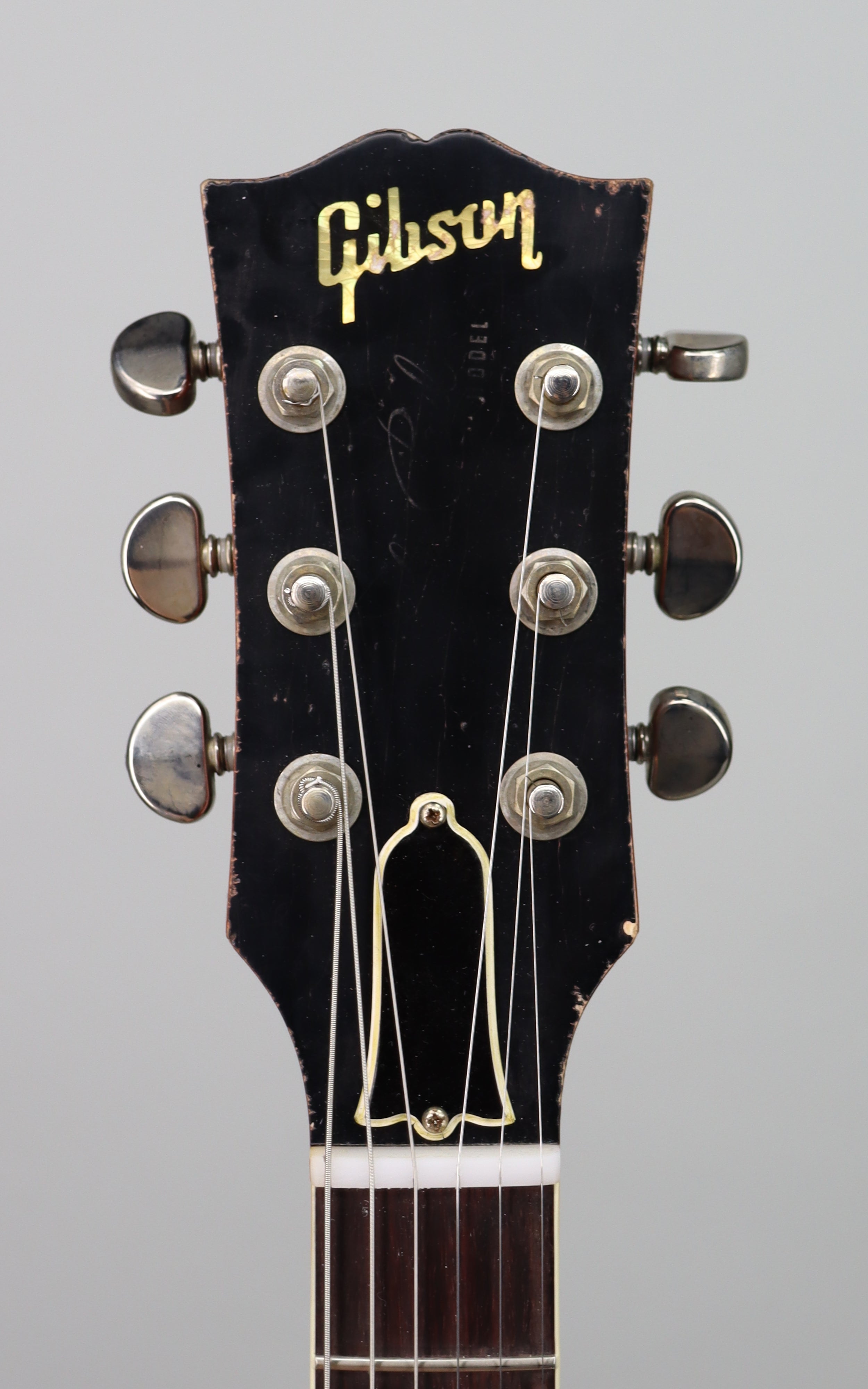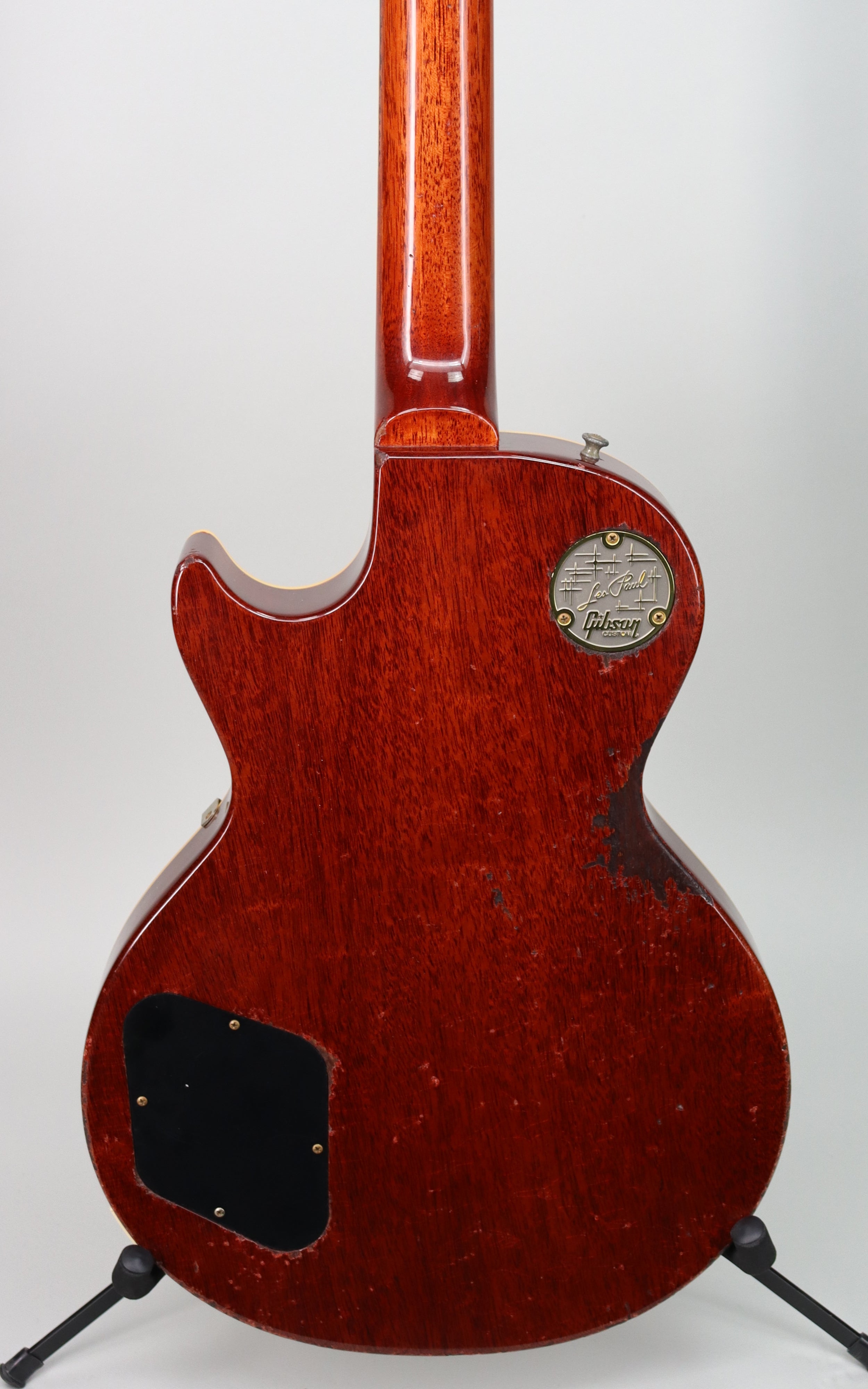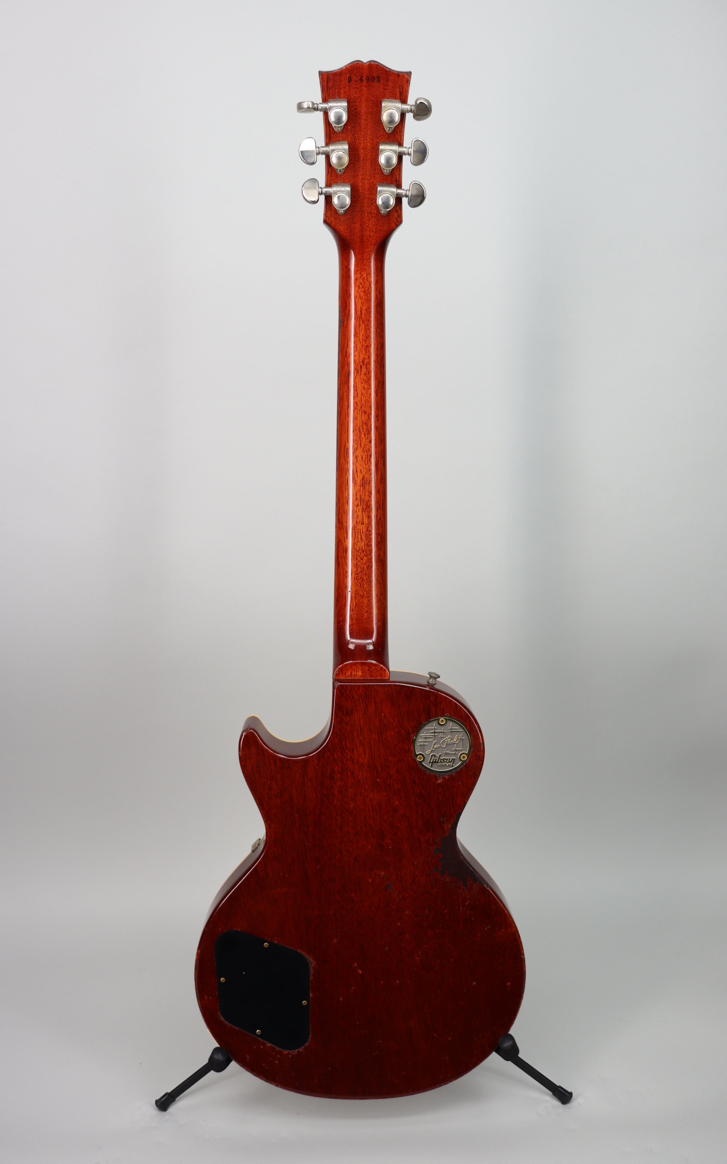 Specs: 1-piece light weight mahogany body; 2-piece hand-selected figured maple top; solid mahogany V3 neck; 24.75" scale length; Indian rosewood fingerboard with hide glue fit; 12" fingerboard radius; 22 authentic medium jumbo frets; 1.687 nut width; lightweight aluminum stop bar with no-wire ABR-1 bridge; Grover tuners; nickel hardware. Nitrocellulose Lacquer Butterscotch finish with Murphy Lab Heavy Aged treatment. Brown/Pink Lifton reissue 5-latch case.