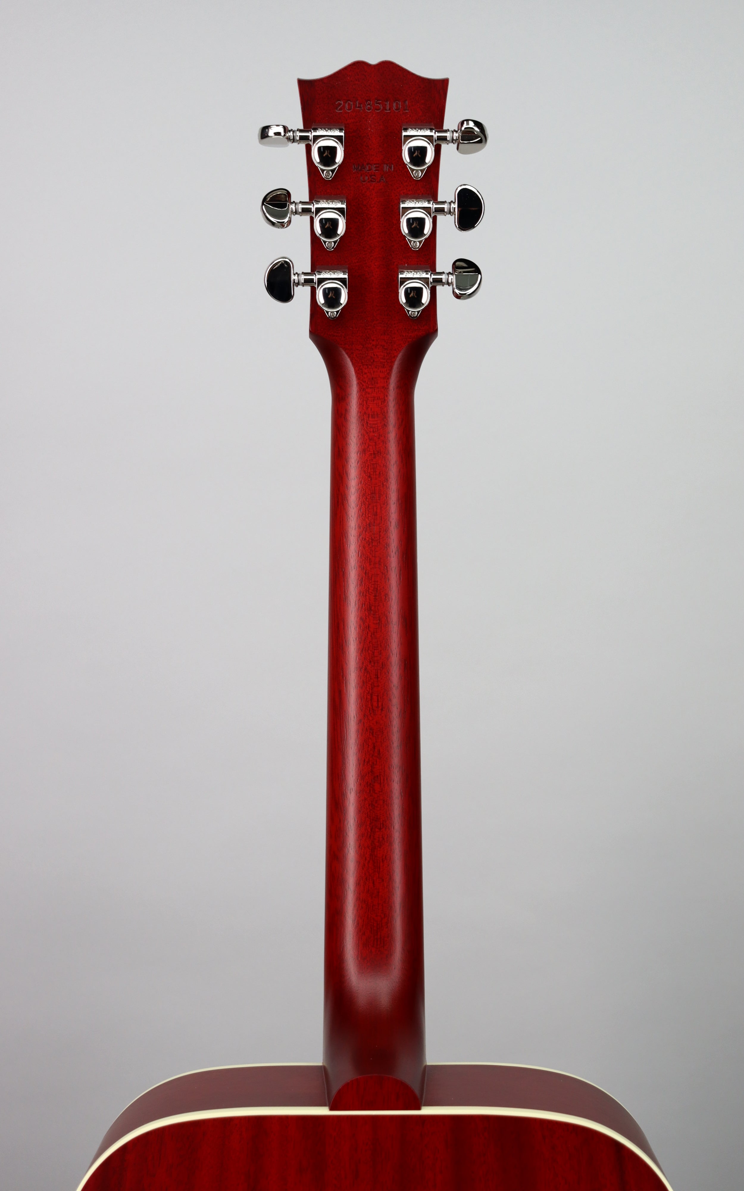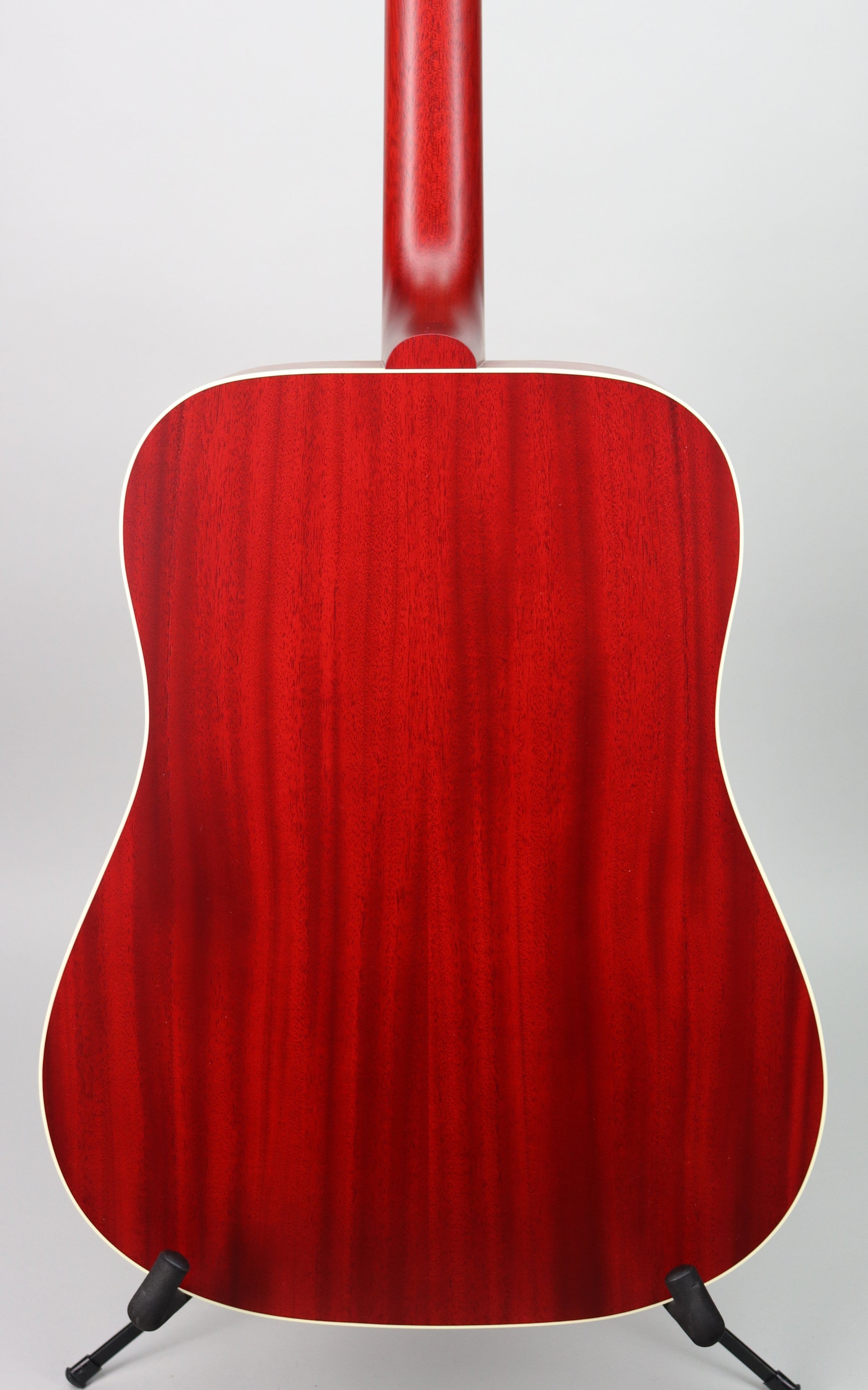 Specs: Square shoulder dreadnought; solid Sitka spruce top; solid mahogany back and sides; traditional scalloped X-bracing; utile neck; rosewood fingerboard; 24.75" scale length; 12" fingerboard radius; 20 standard frets; 1.725" nut width; tusq nut/saddle; traditional rosewood belly-up bridge; Grover Rotomatic tuning machines. Satin nitro-cellulose Vintage Cherry Sunburst finish. Premium soft shell case.