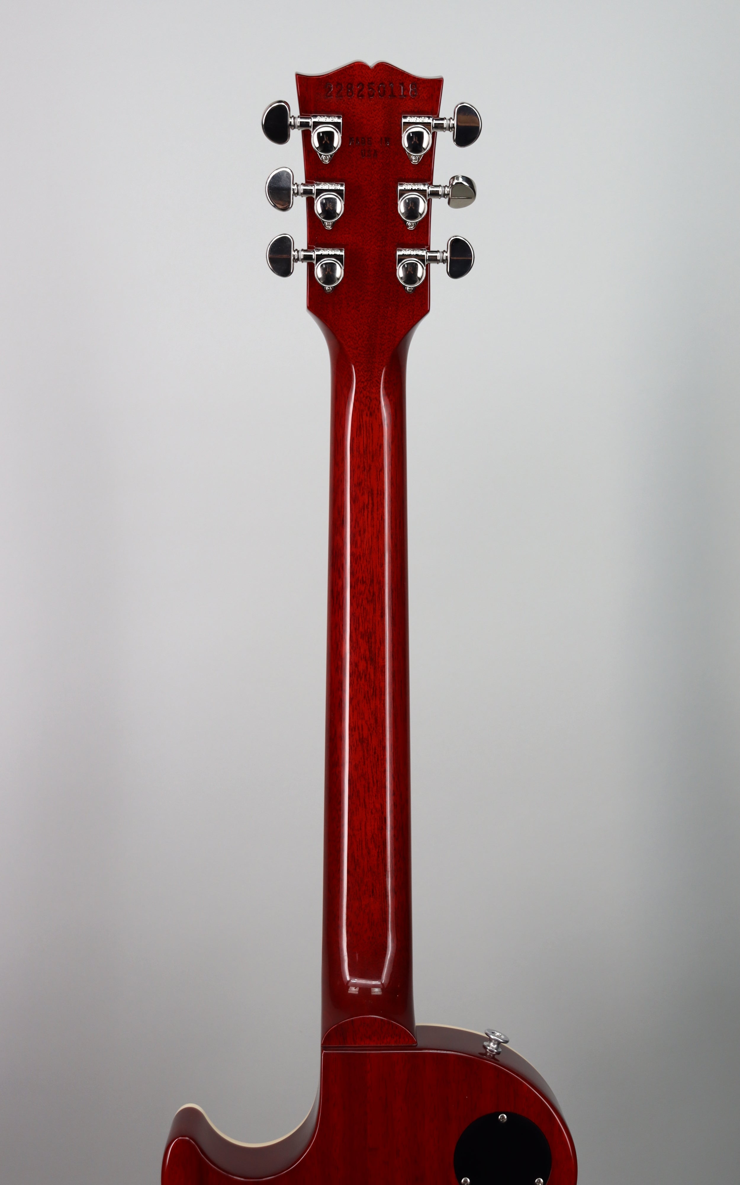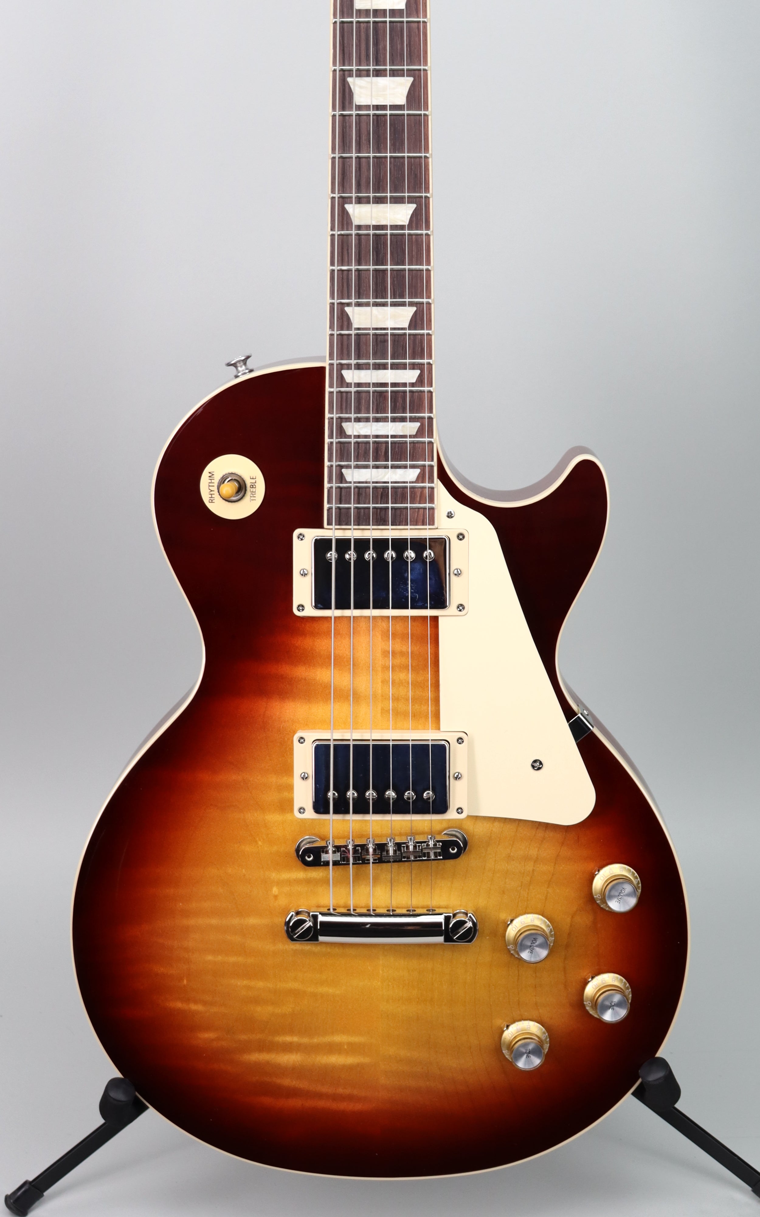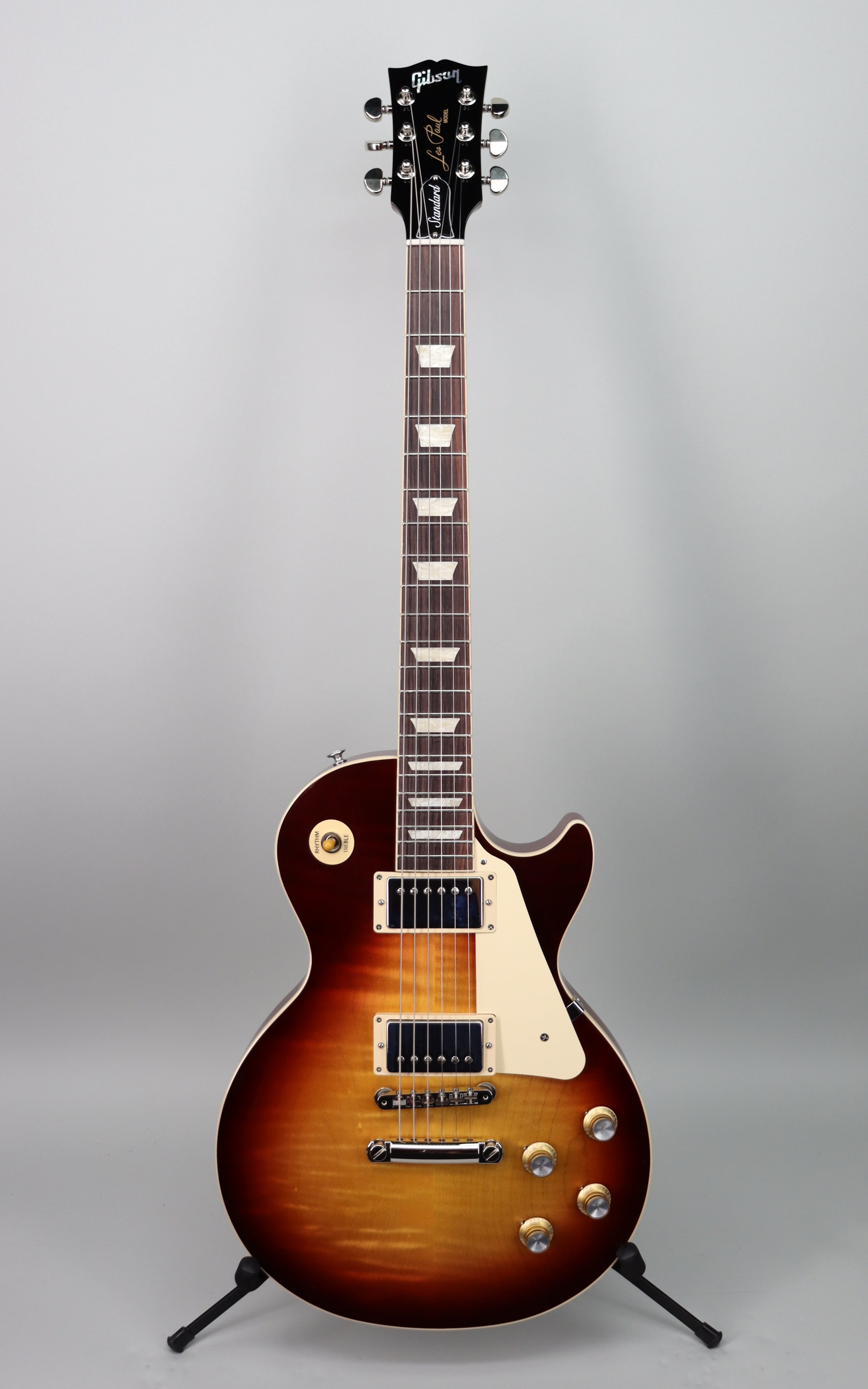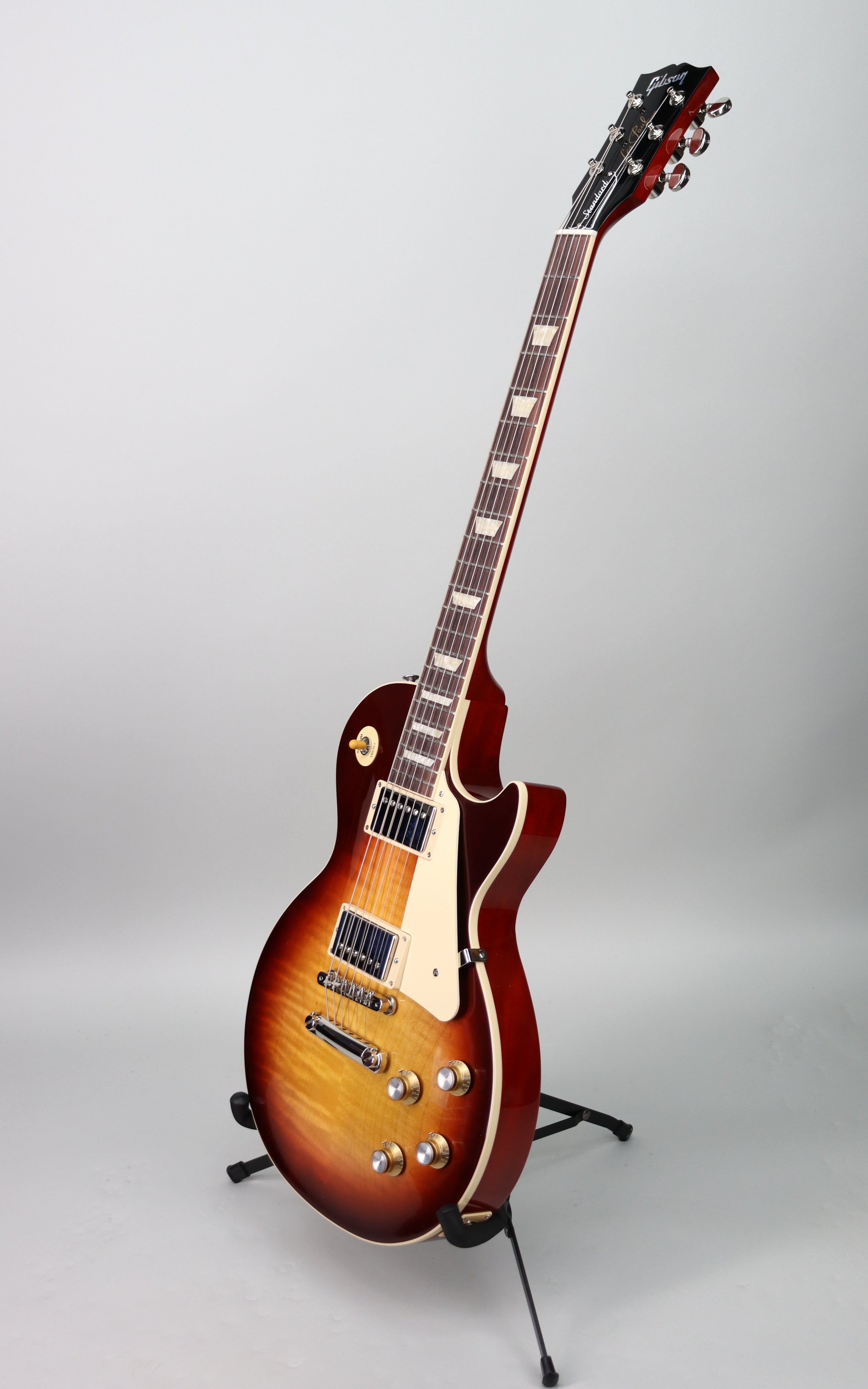 Specs: AA figured maple top; mahogany body; mahogany Slim Taper neck; 24.75" scale length; rosewood fingerboard; 12" fingerboard radius; 22 medium jumbo frets; 1.69" nut width; ABR-1 tune-o-matic bridge; Grover Rotomatic tuners with kidney buttons. Nitrocellulose lacquer Bourbon Burst finish. Gibson hardshell case included.