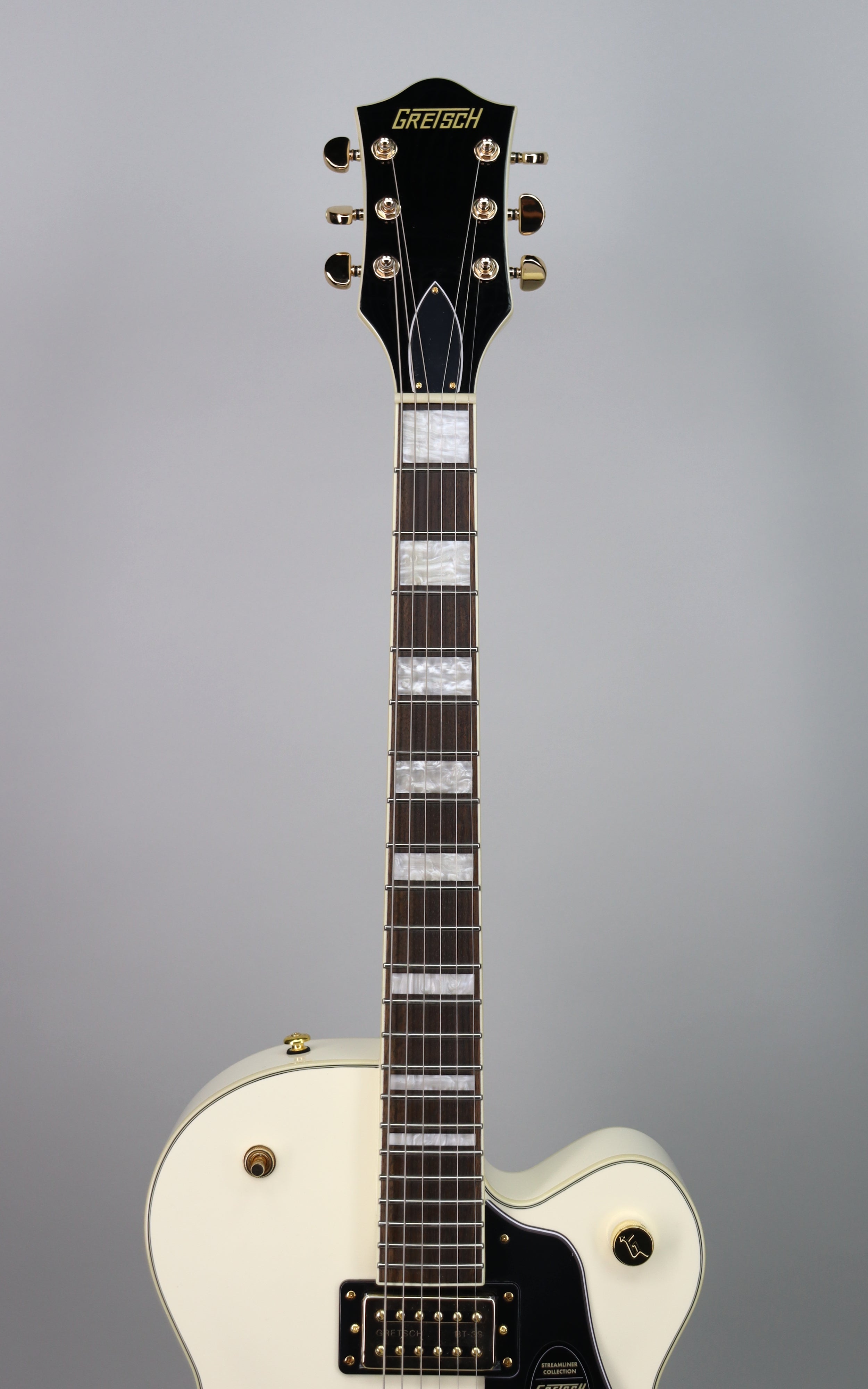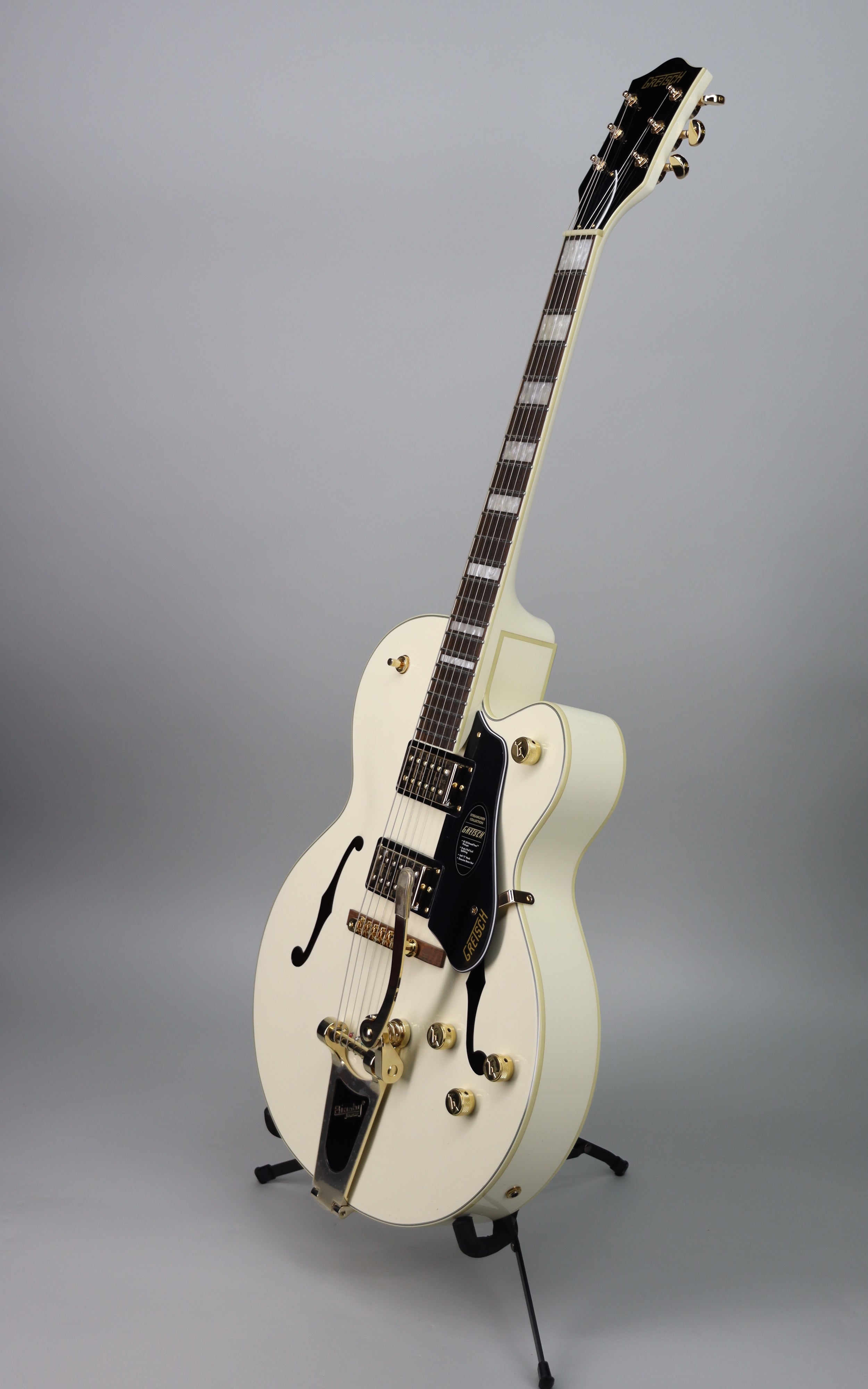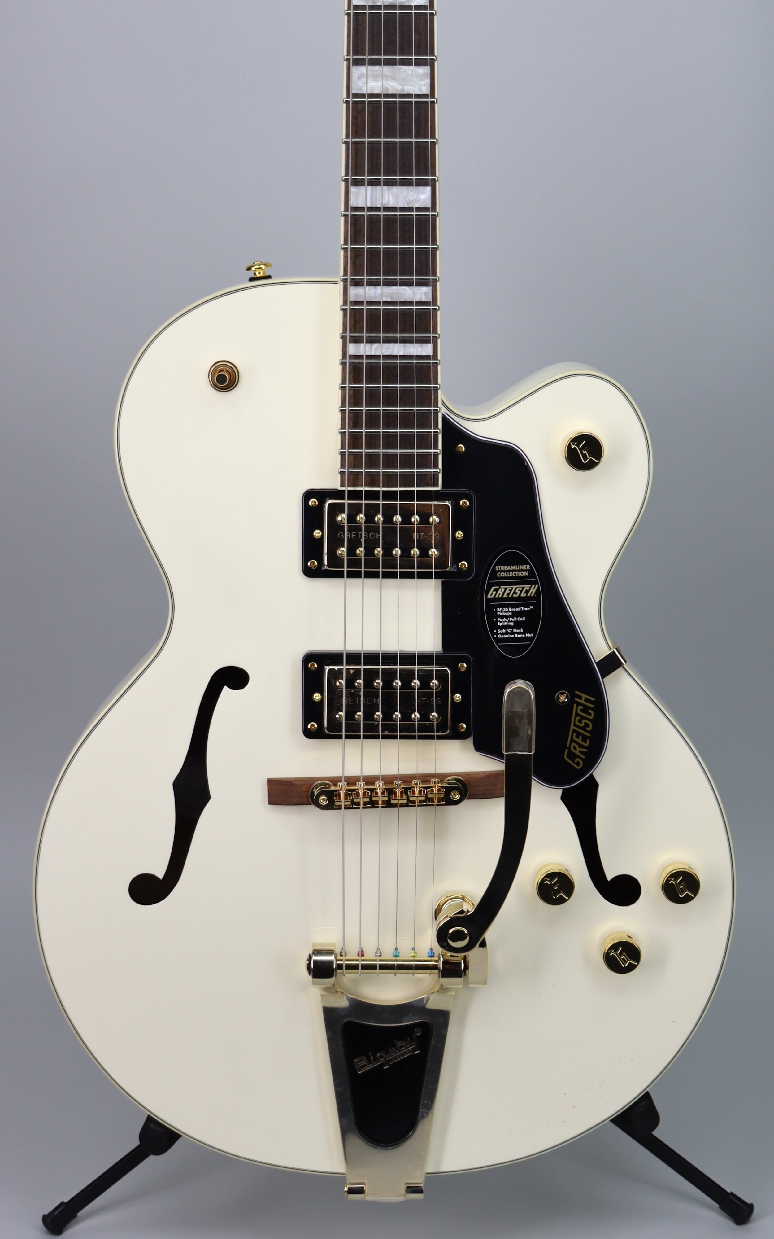 Specs: Laminated maple hollow body with arched laminated maple top and arched laminated maple back; parallel tone bar bracing; single cutaway Streamliner body shape; nato set-neck with gloss finish and soft “C” profile; 24.75" scale length; laurel fingerboard with 12" radius, pearloid Big Block inlays and 22 medium jumbo frets; 1.6875" bone nut; Adjusto-Matic bridge with secured laurel base; Bigsby B60 tailpiece; gold hardware with die-cast sealed tuning machines, G-Arrow control knobs and 3-ply black pickguard. Gloss Vintage White finish.