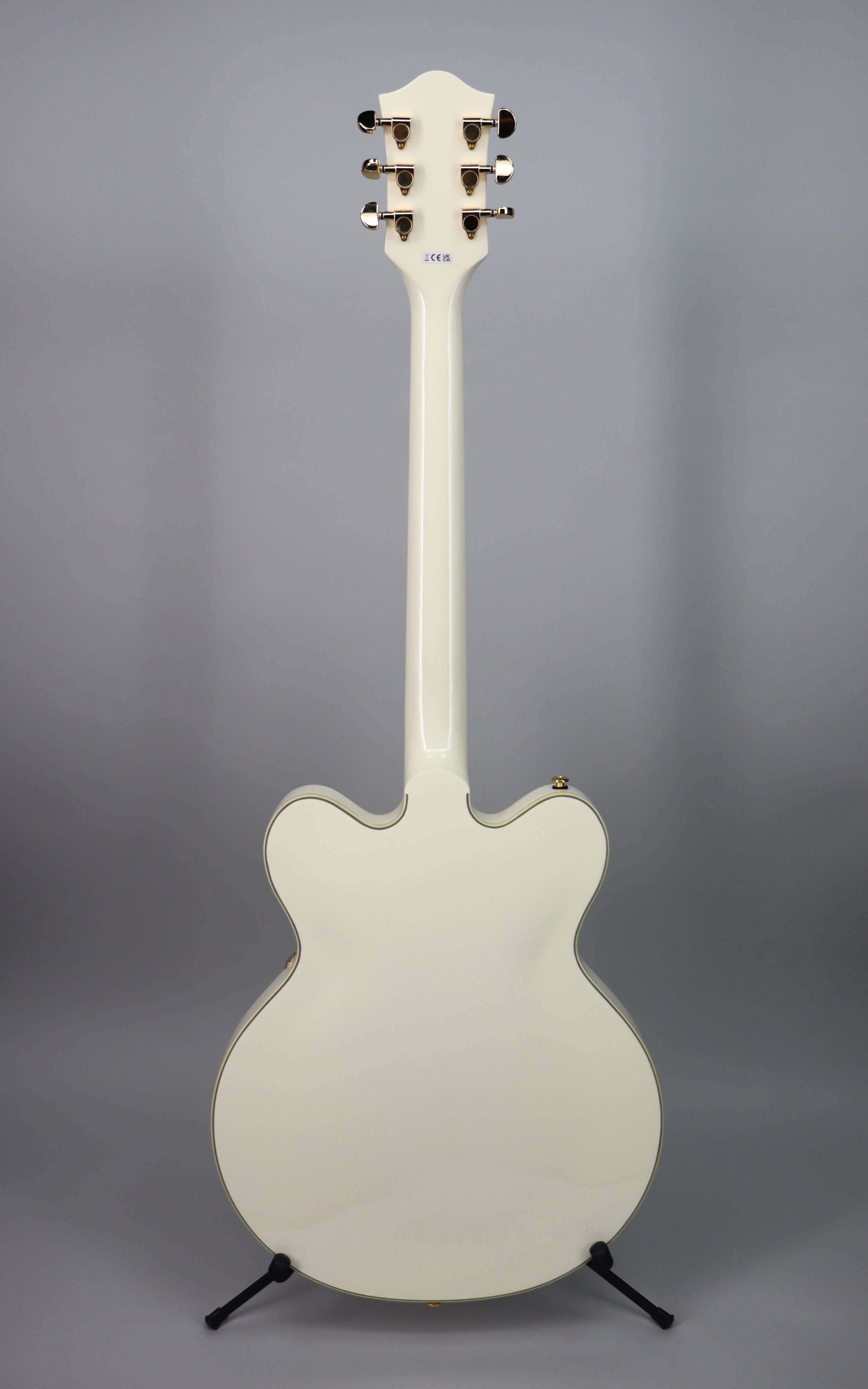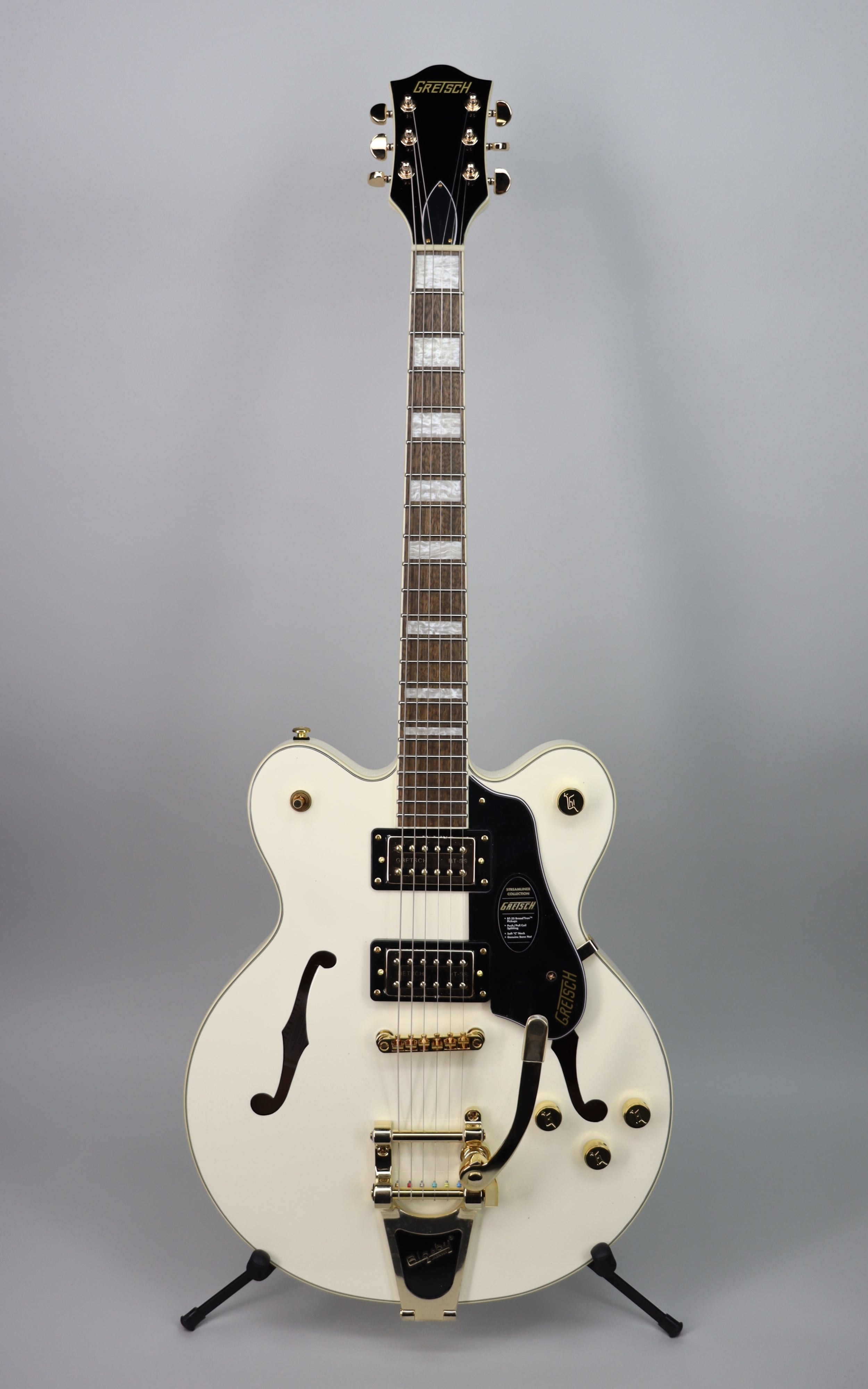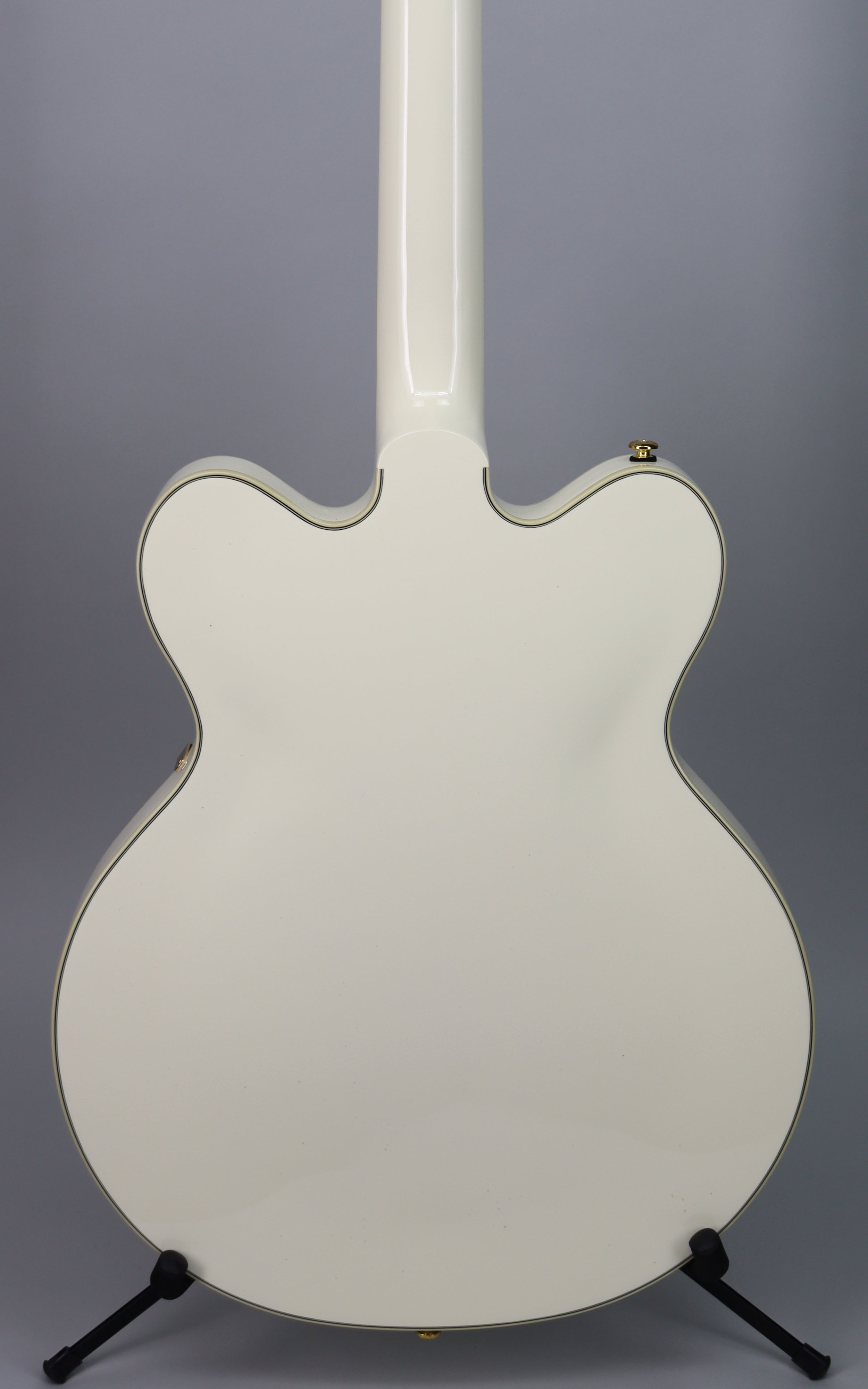 Specs: Laminated maple body with arched laminated maple top and back; center block bracing with double cutaway and F-holes; nato set-neck with Soft “C” profile; 24.75" scale length; 12" radius laurel fingerboard with pearloid Big Block inlays and 22 medium jumbo frets; bone nut with 1.6875" width; Adjusto-Matic™ bridge with anchored mounting; Bigsby® B70 vibrato tailpiece; gold die-cast sealed tuning machines. Gloss Vintage White finish.