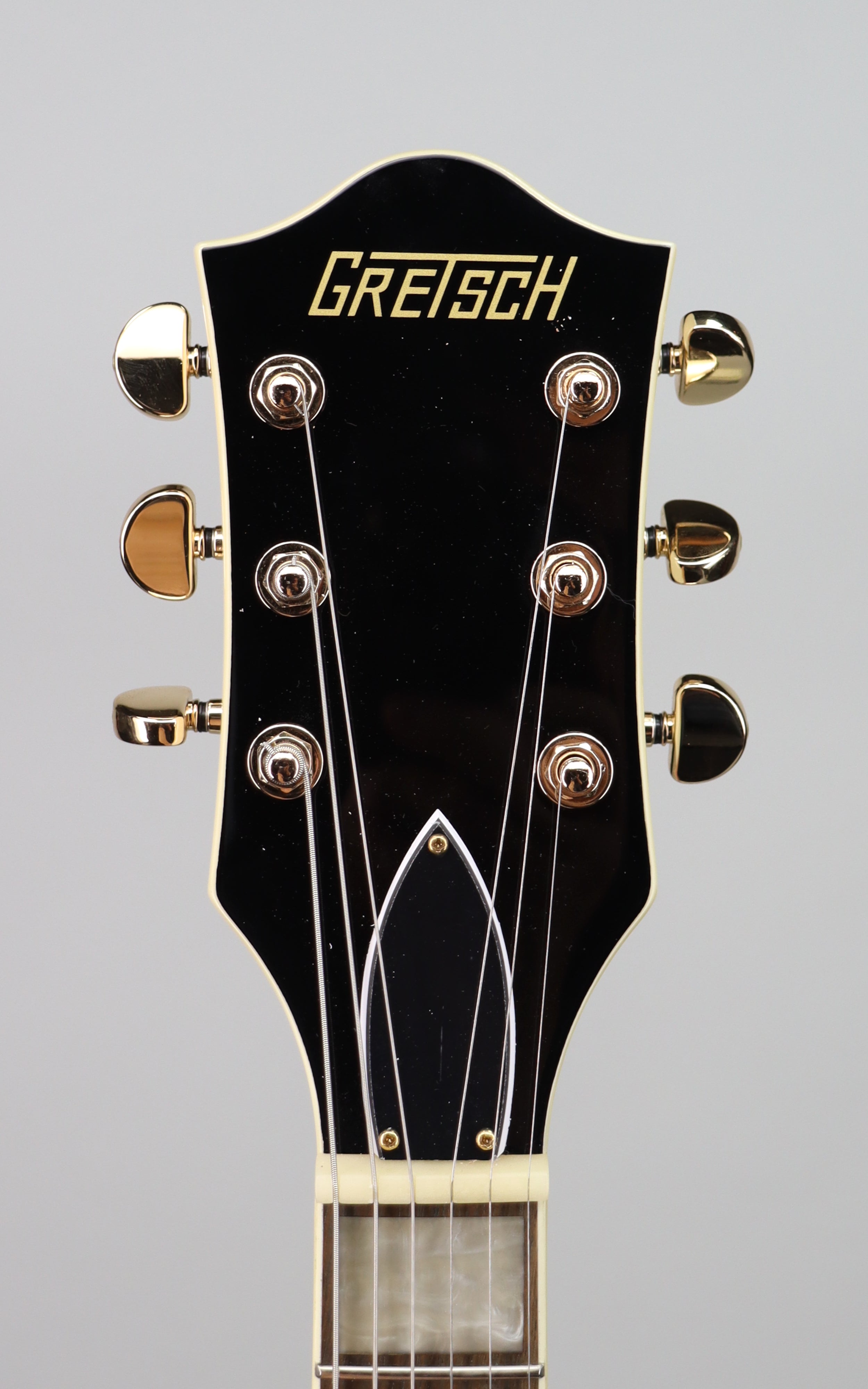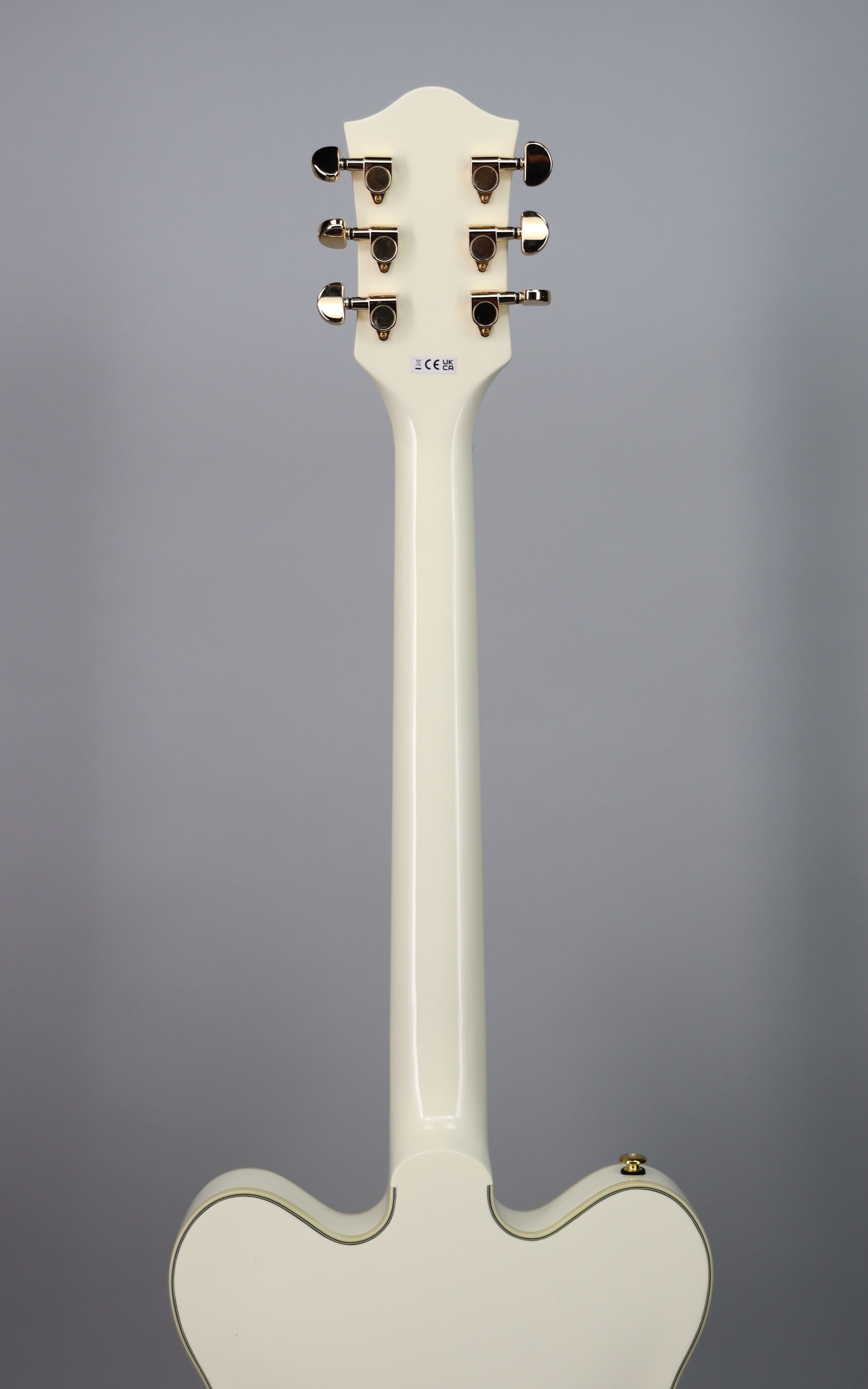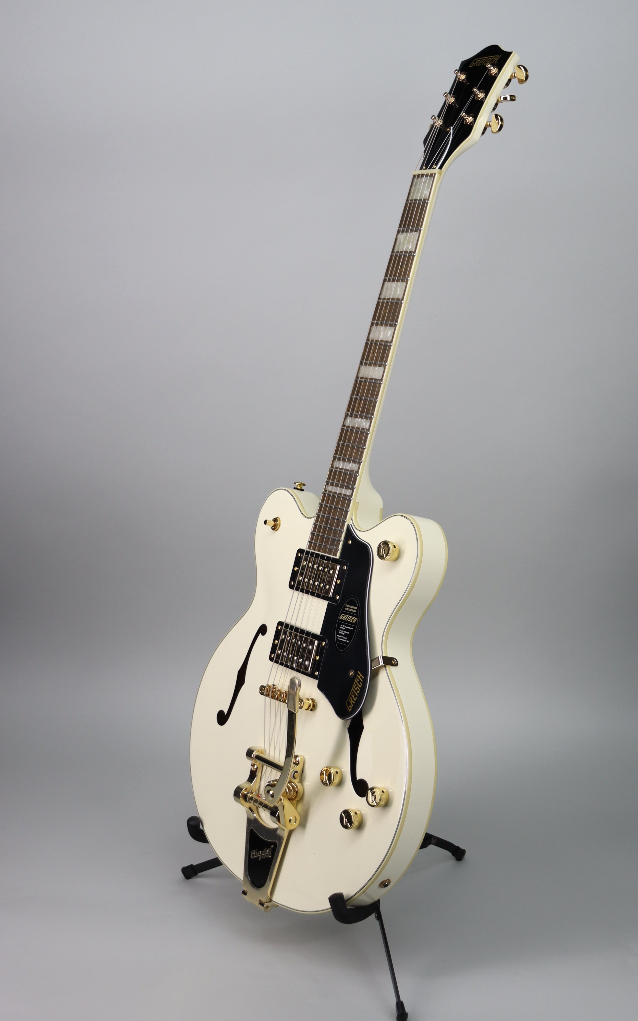 Specs: Laminated maple body with arched laminated maple top and back; center block bracing with double cutaway and F-holes; nato set-neck with Soft “C” profile; 24.75" scale length; 12" radius laurel fingerboard with pearloid Big Block inlays and 22 medium jumbo frets; bone nut with 1.6875" width; Adjusto-Matic™ bridge with anchored mounting; Bigsby® B70 vibrato tailpiece; gold die-cast sealed tuning machines. Gloss Vintage White finish.