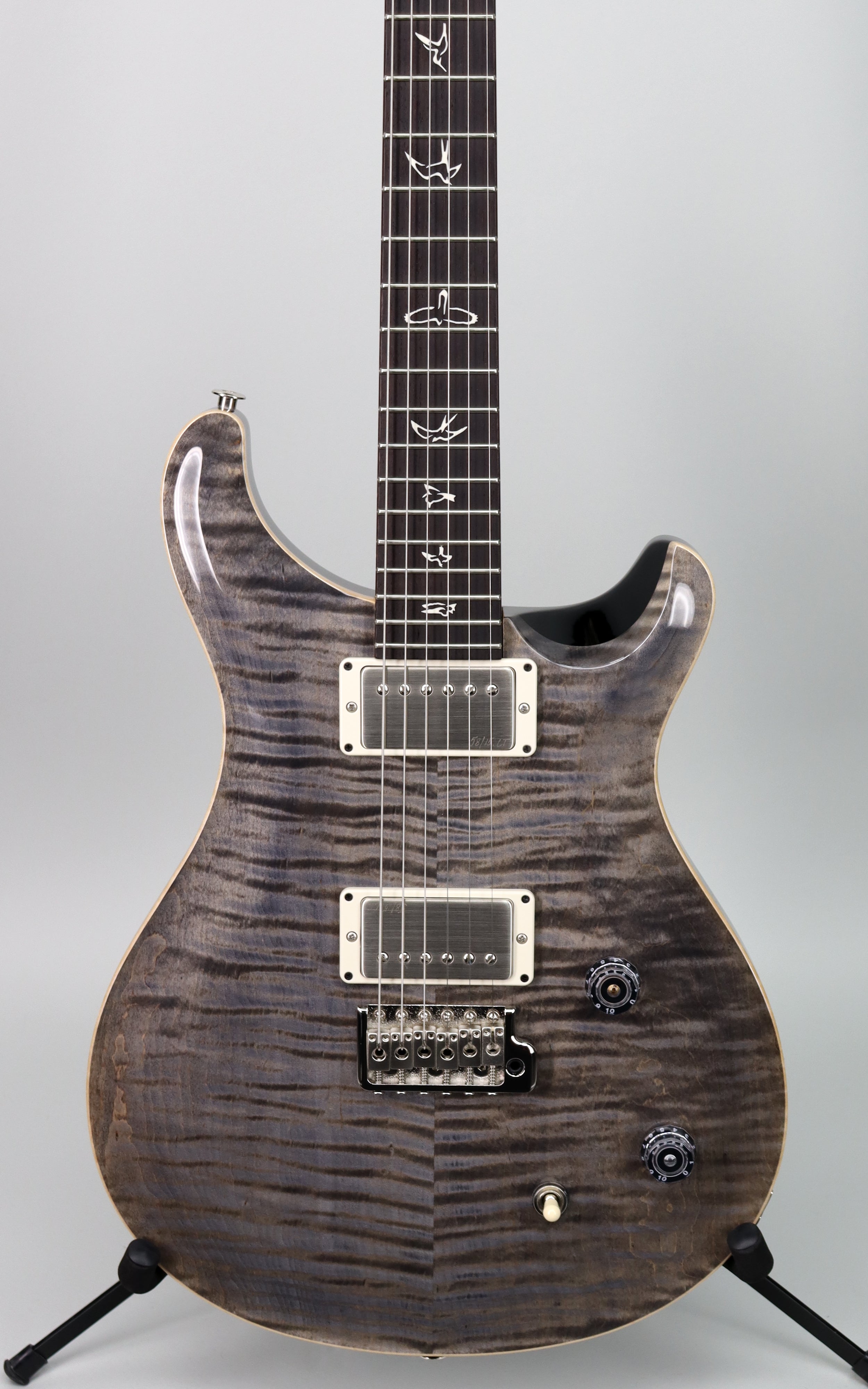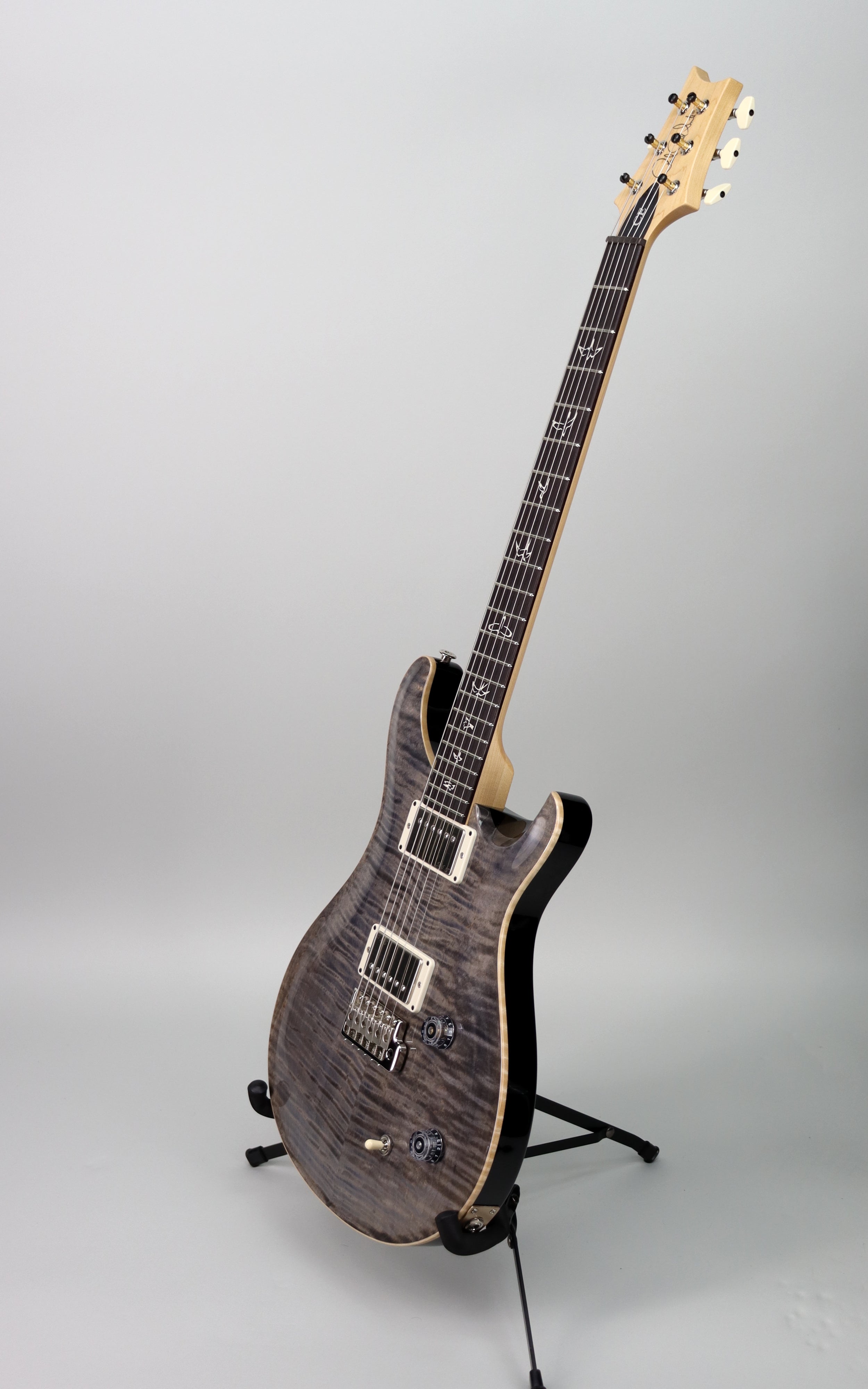 Specs: Mahogany solidbody with figured maple top; bolt‑on maple neck with scarf joint Pattern Regular profile; 25″ scale, 22 frets, 10″ radius rosewood fingerboard with iconic bird inlays; satin nitro neck; PRS Patented Tremolo bridge; Phase III Low‑Mass locking tuners with wing buttons. High gloss nitro-cellulose lacquer Faded Gray Black finish. Premium gigbag included.
