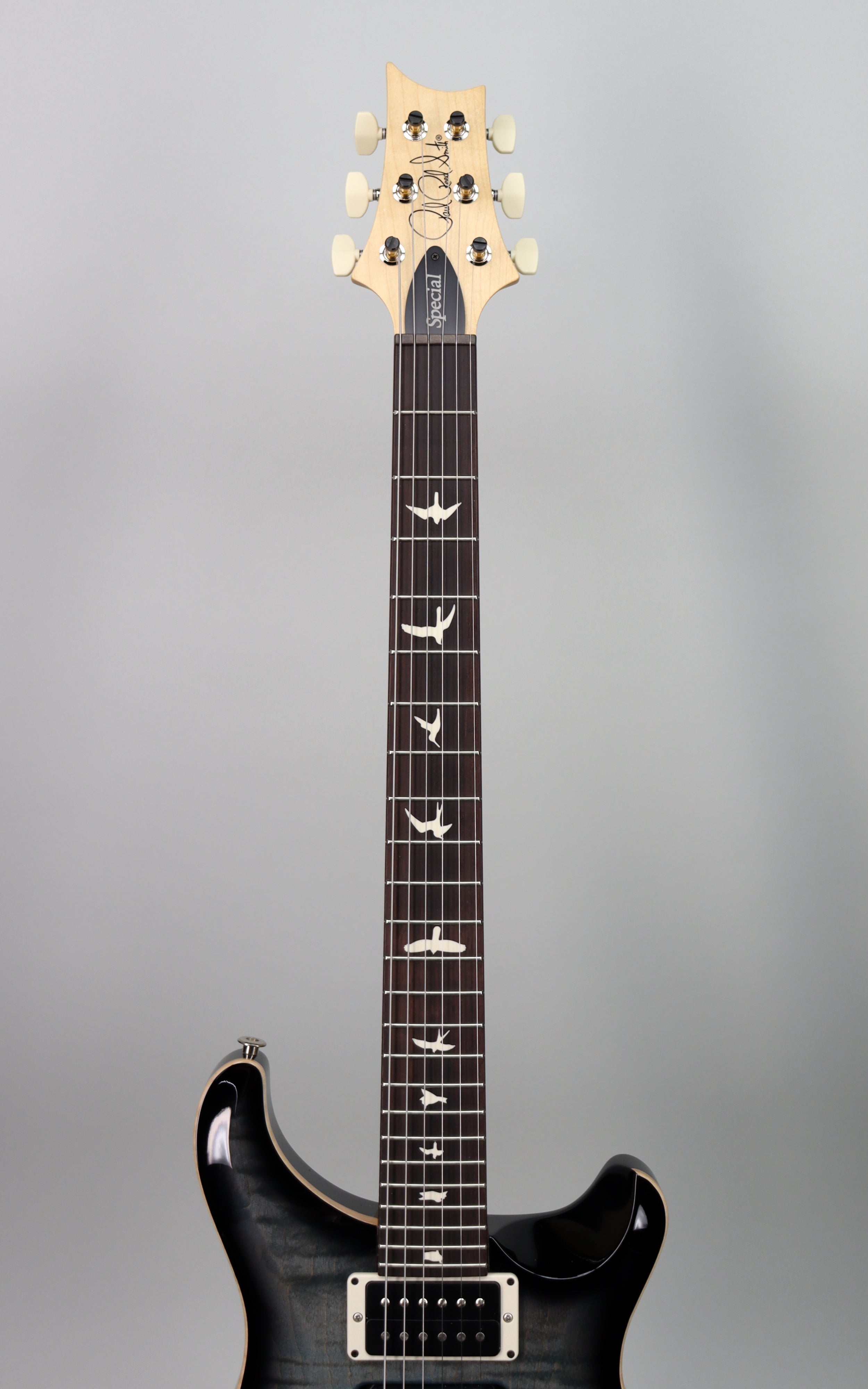 Specs: Solid mahogany body with a violin-carved maple top; maple bolt-on Patter Thin neck with rosewood fretboard ornamented with “Old School” bird inlays; 24 frets on a 25″ scale with 10″ radius;; nickel hardware; PRS patented tremolo; Phase III locking tuners with wing buttons; “Special” truss-rod cover. Nitro Faded Blue Smokeburst finish. PRS gig bag included.Weight: 7 lbs 7 oz.