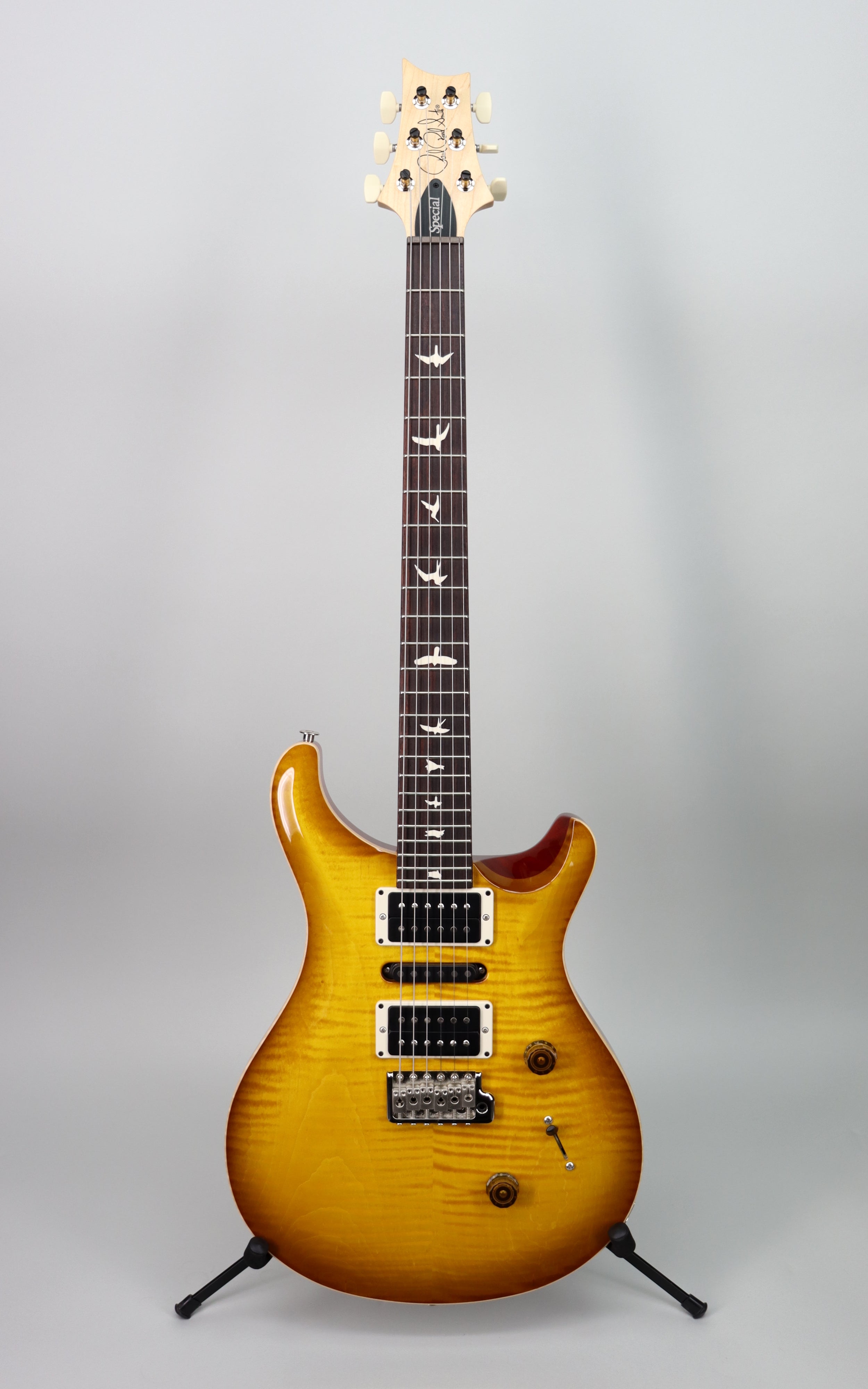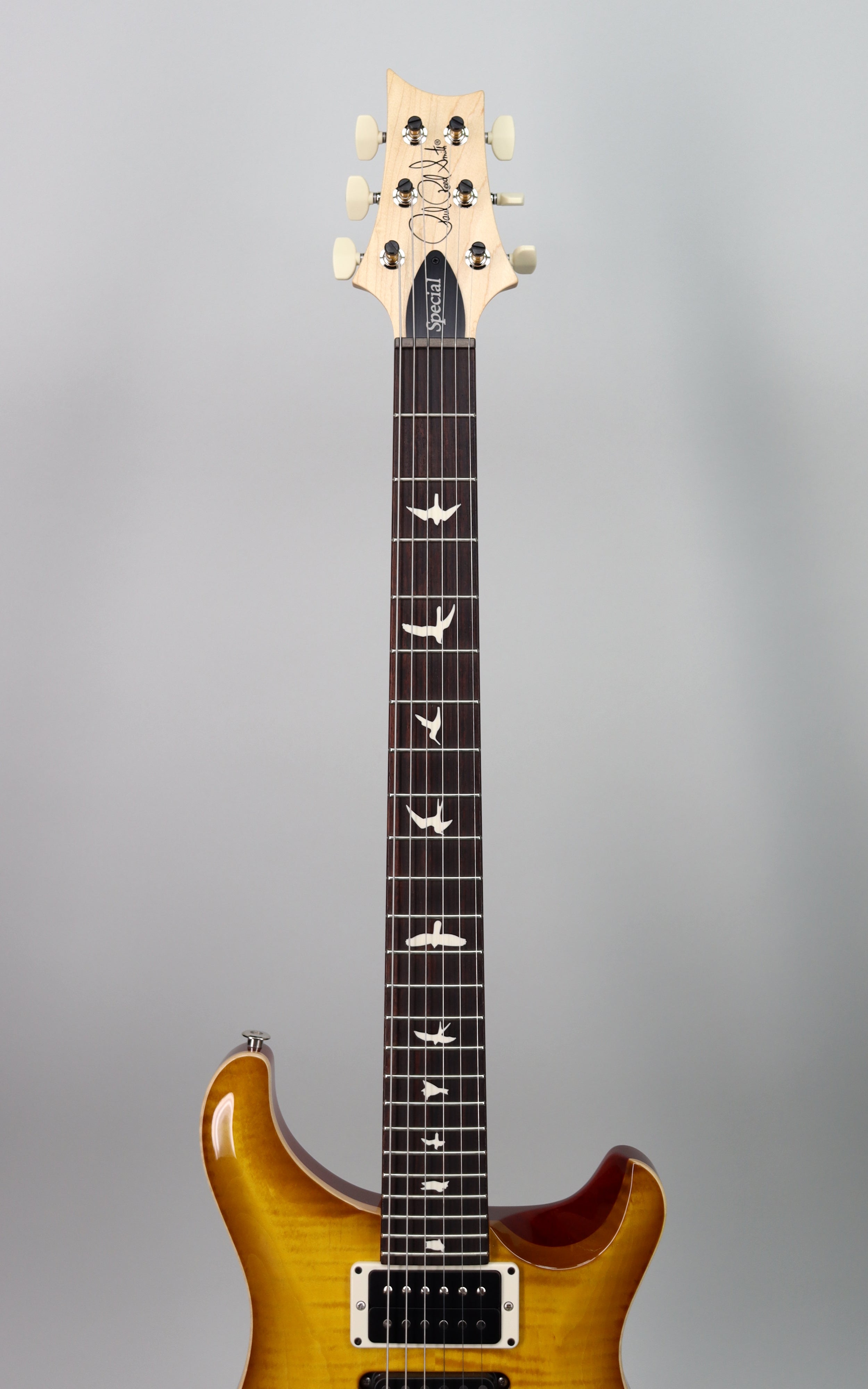 Specs: Solid mahogany body with a violin-carved maple top; maple bolt-on Patter Thin neck with rosewood fretboard ornamented with “Old School” bird inlays; 24 frets on a 25″ scale with 10″ radius;; nickel hardware; PRS patented tremolo; Phase III locking tuners with wing buttons; “Special” truss-rod cover. Nitro McCarty Sunburst finish. PRS gig bag included.Weight: 7 lbs 9 oz.