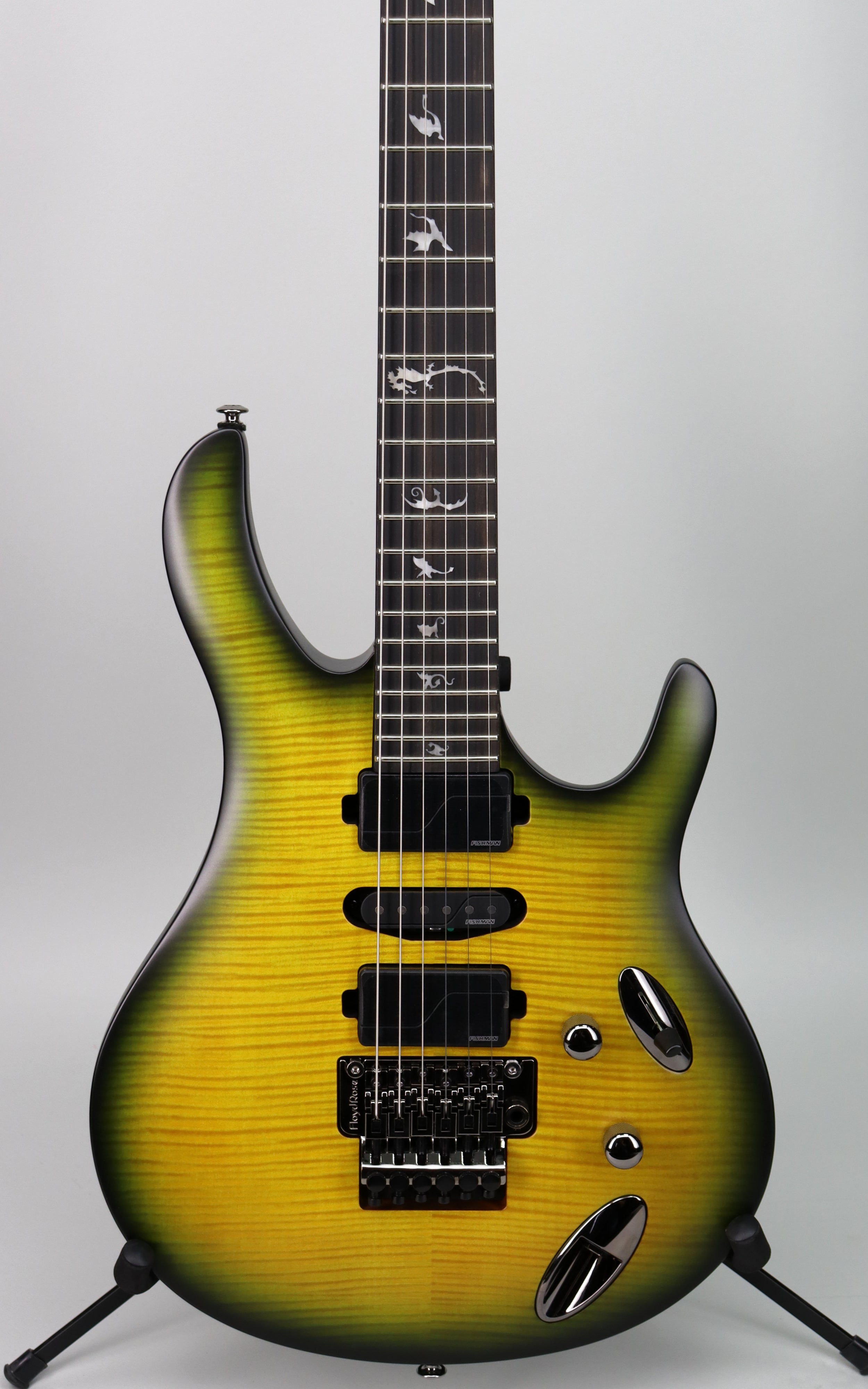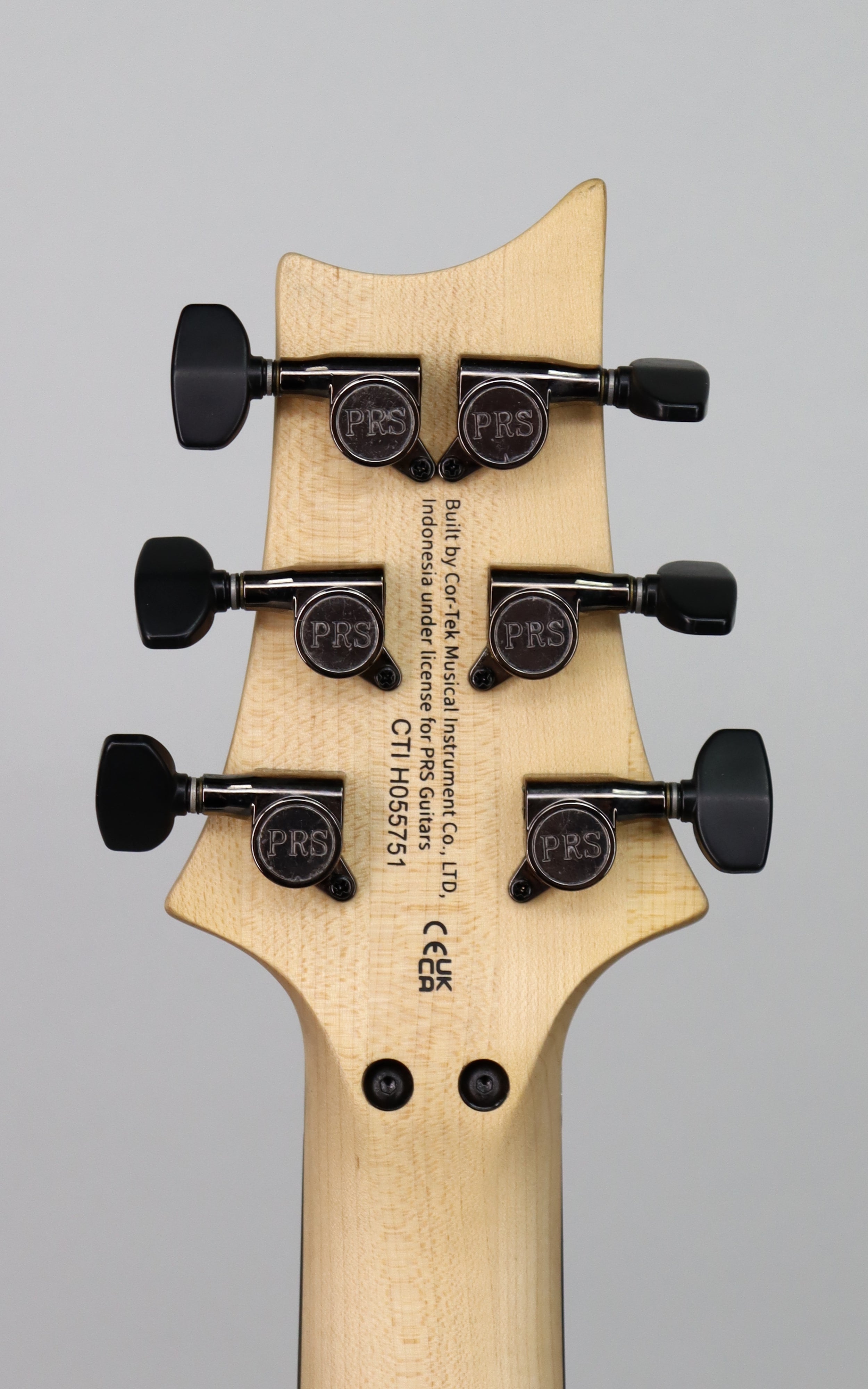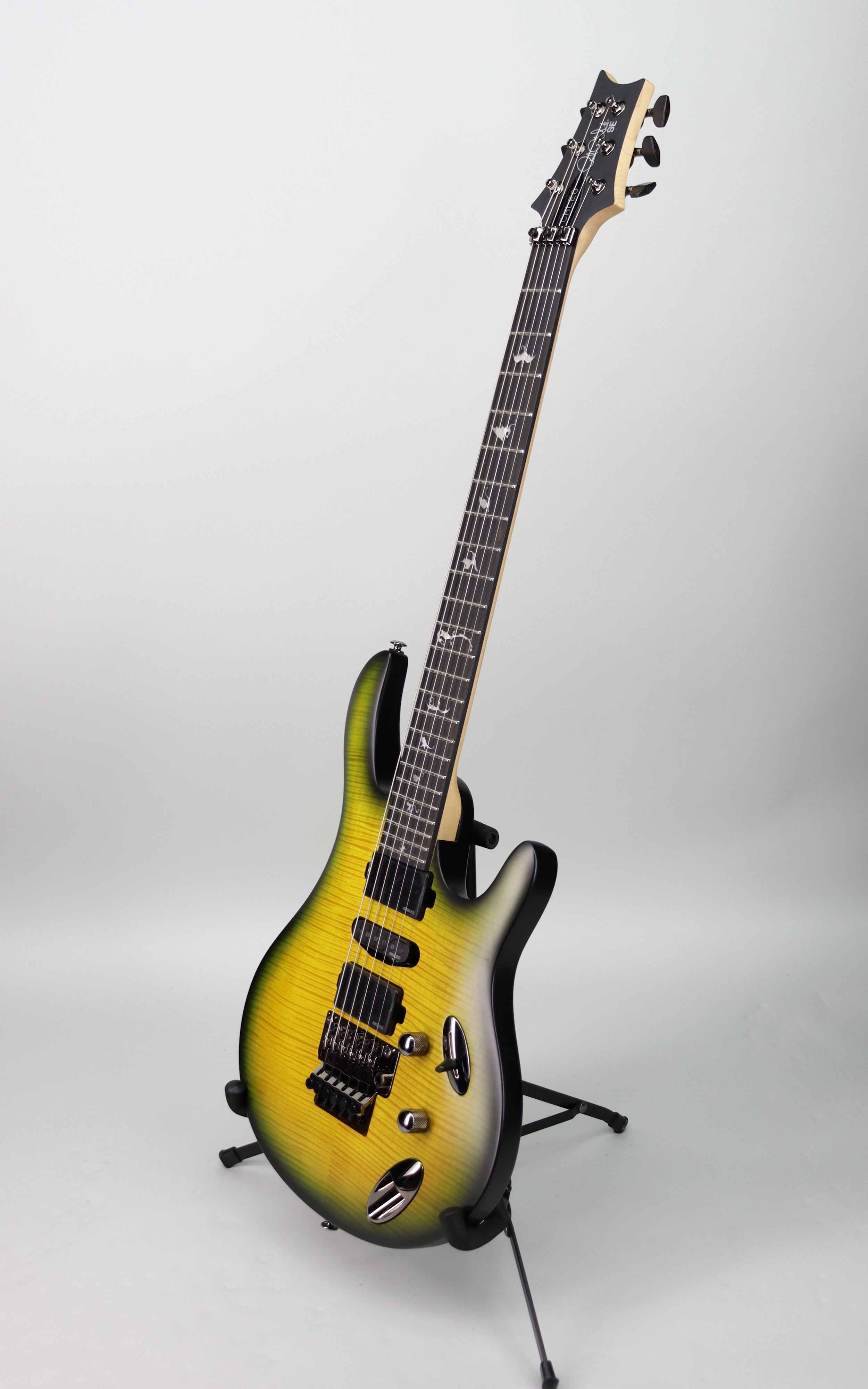 Specs: Maple top with flame maple veneer; mahogany back; maple Chleo neck; ebony fretboard; 24 frets; 20" fingerboard radius; 1.75" nut width; 25.5" scale length; smoked black hardware; PRS-designed tuners; Floyd Rose 1000 tremolo w/ PRS locking nut. Mantis Burst finish. Gig bag included.