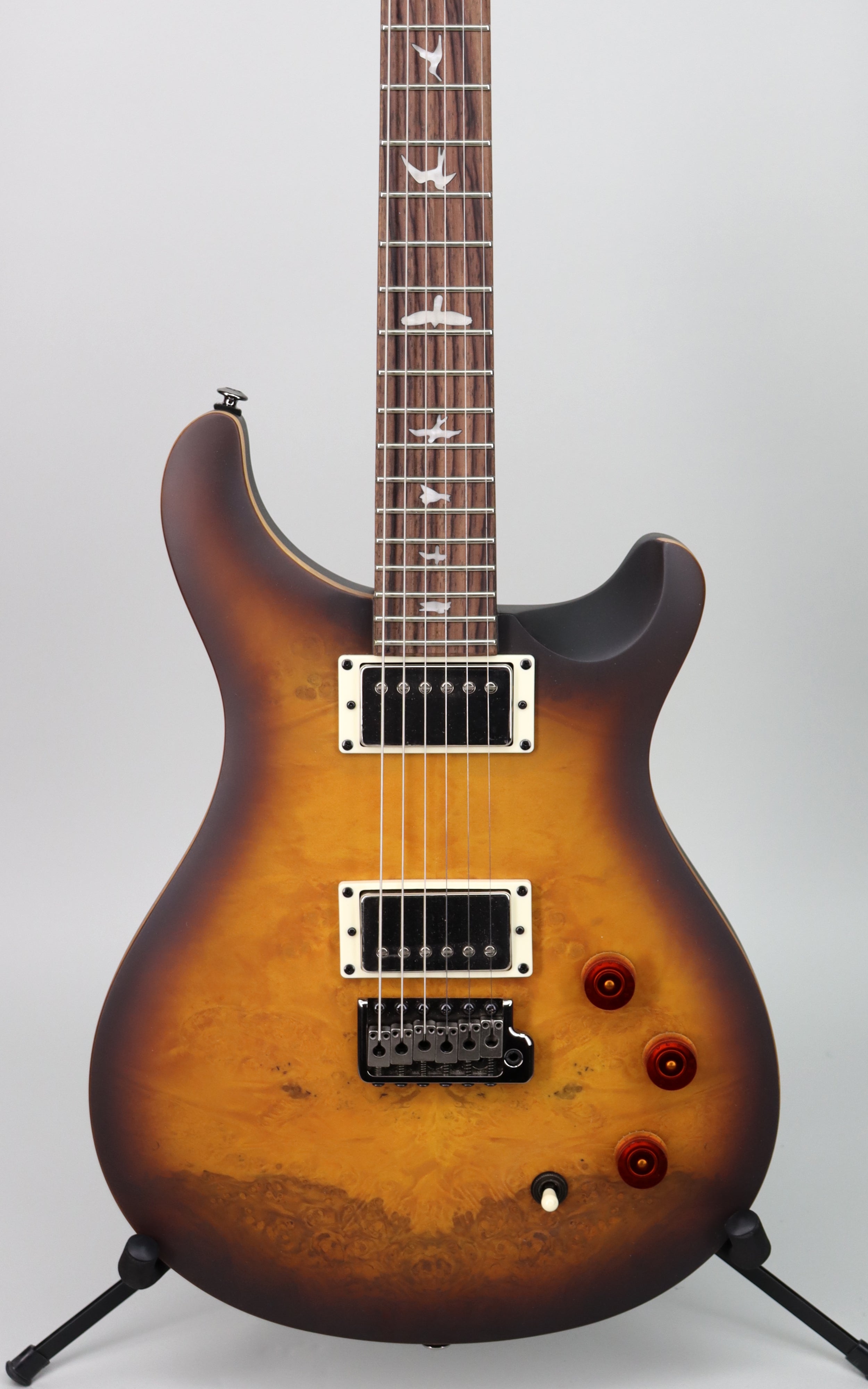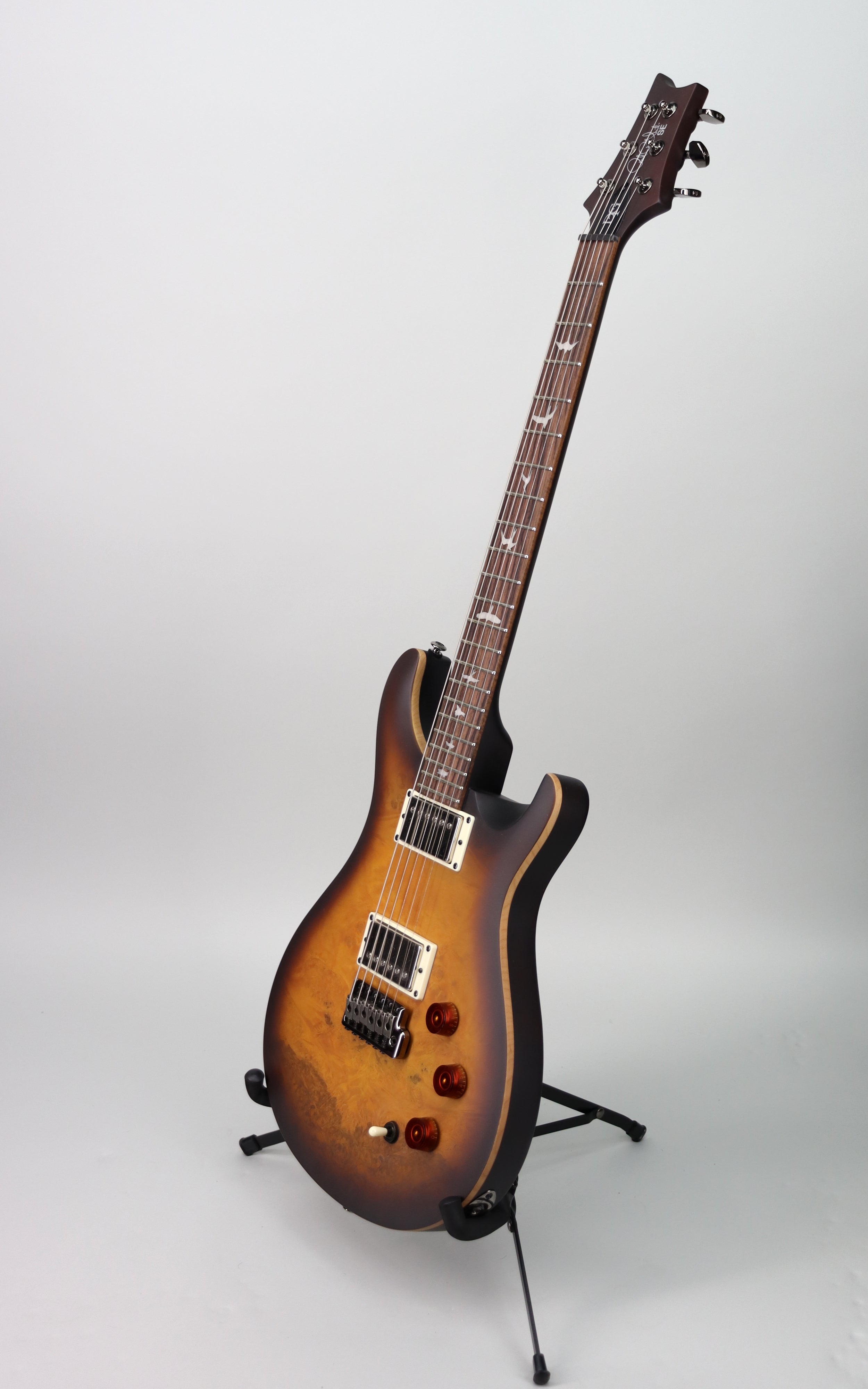 Specs: Maple top with laurel burl veneer; mahogany back; mahogany neck with DGT profile; rosewood fretboard; PRS bird inlays; 25" scale length; 22 frets; 10" radius; PRS patented tremolo; PRS-designed tuners. Nitrocellulose McCarty Tobacco Burst finish. Gigbag included.
