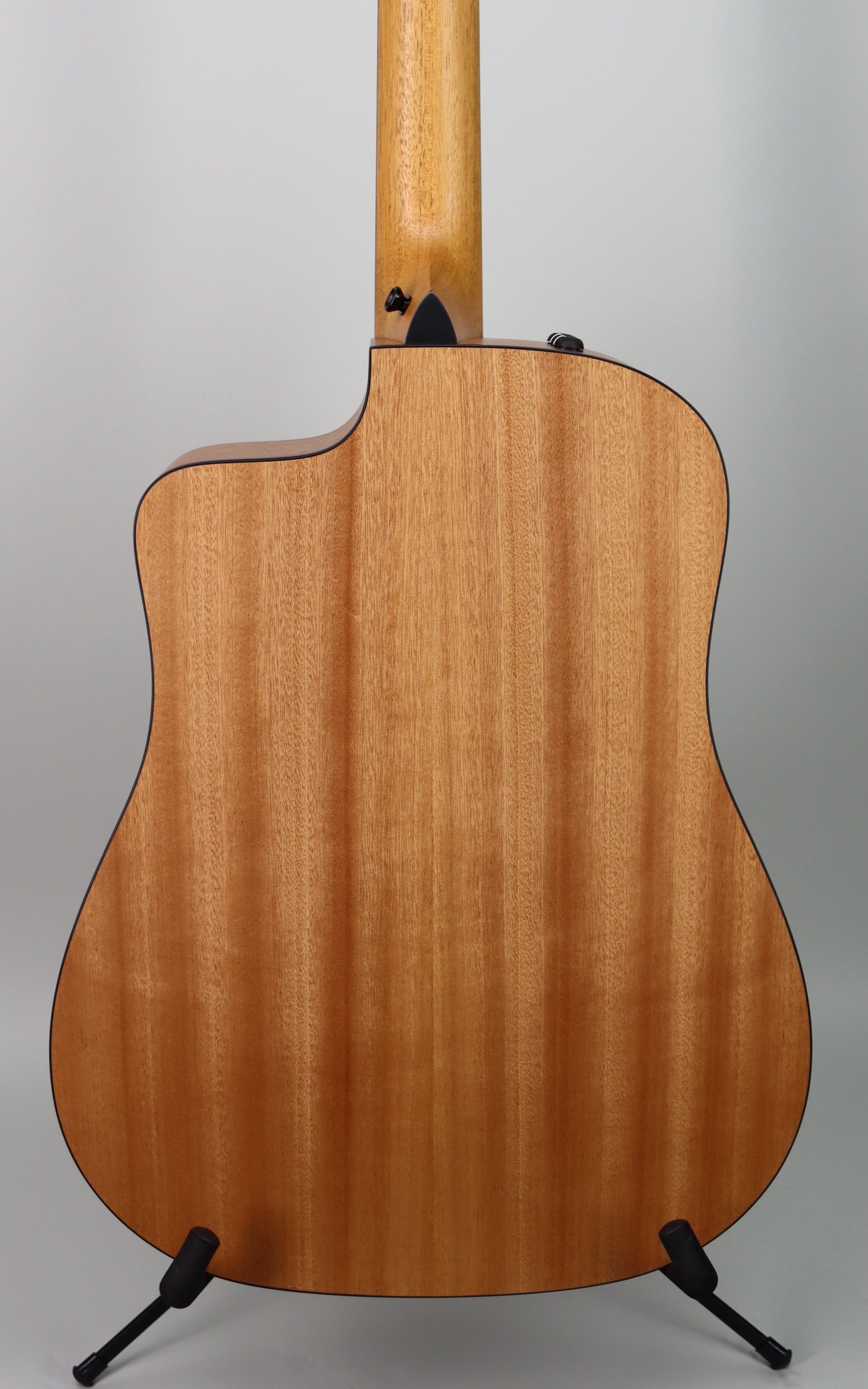 Specs: Dreadnought body with Venetian cutaway. Solid torrefied spruce top; layered sapele back and sides; Neo-Tropical Mahogany neck with matte finish; ebony fingerboard with 4 mm Italian acrylic dot inlays and no binding; ebony bridge; black body binding; matte peghead finish; Tusq nut, Micarta saddle. Includes gig bag.