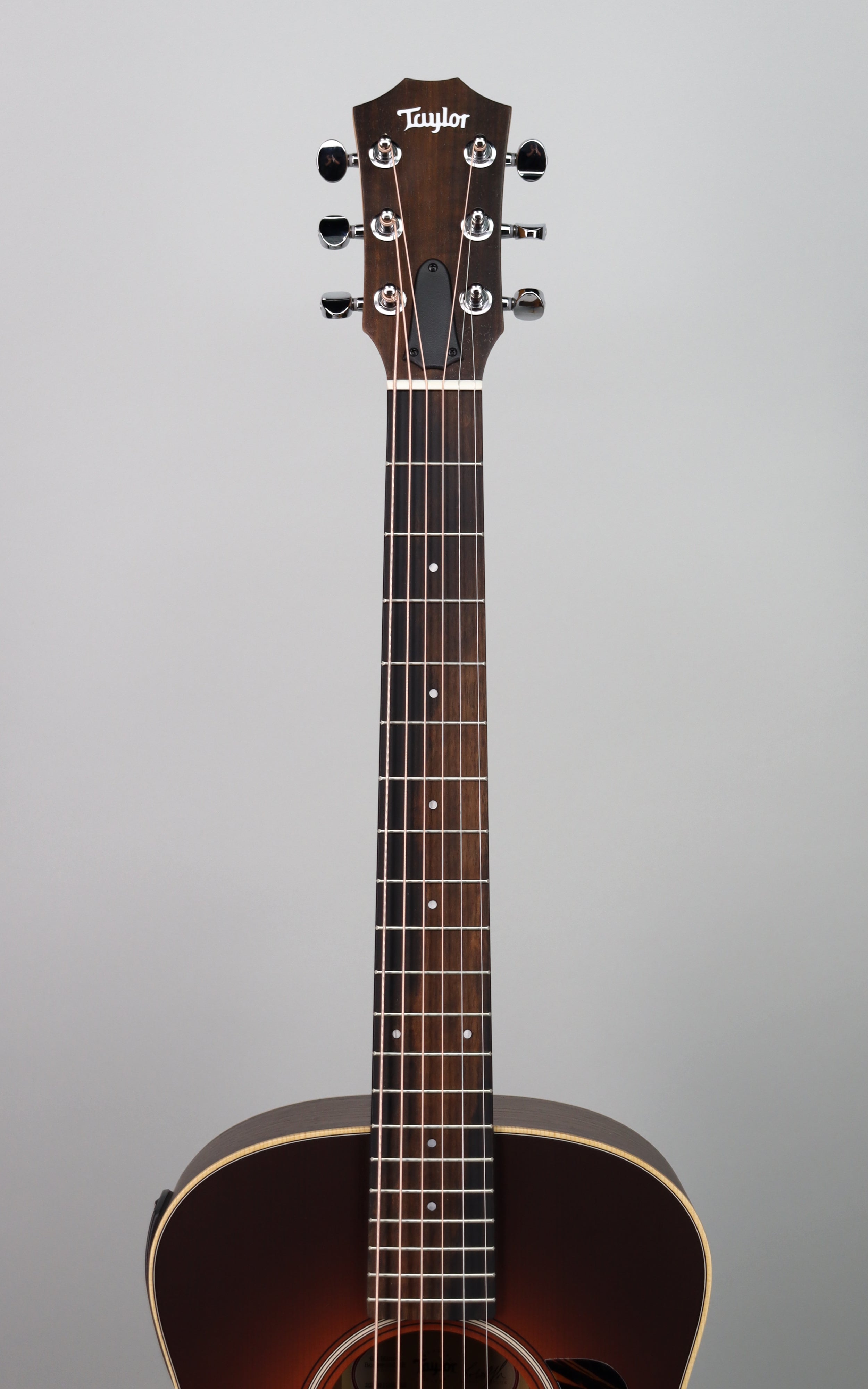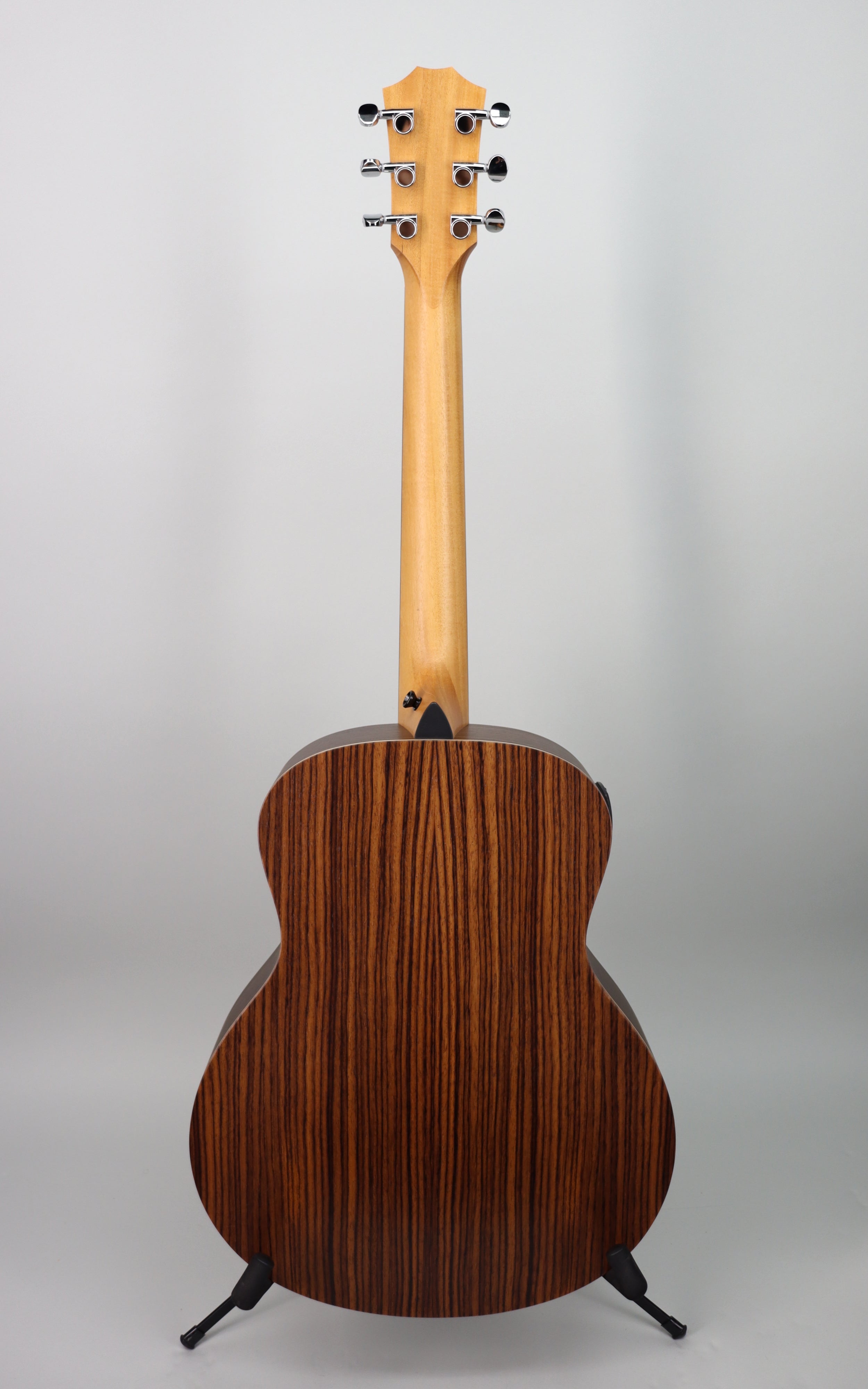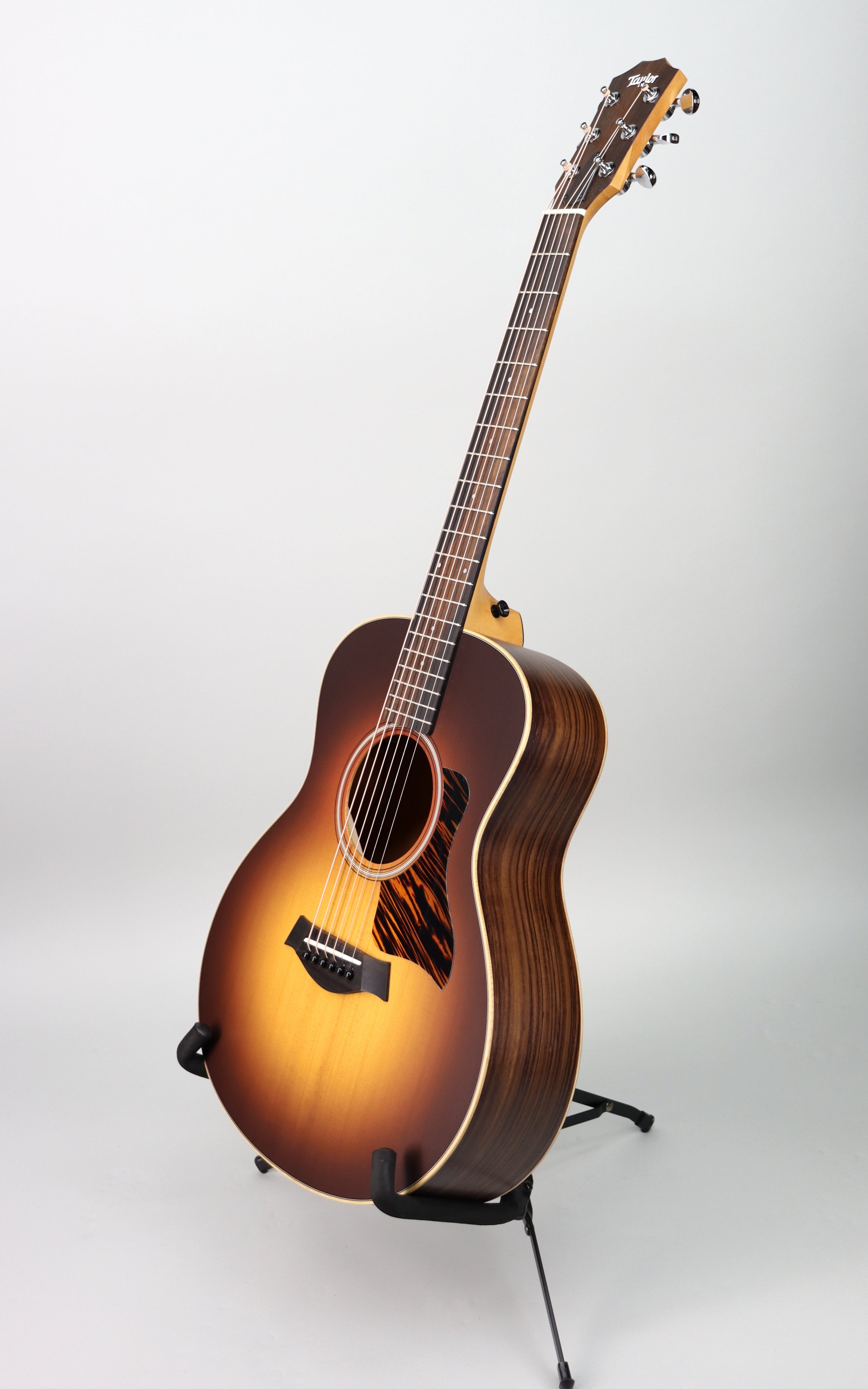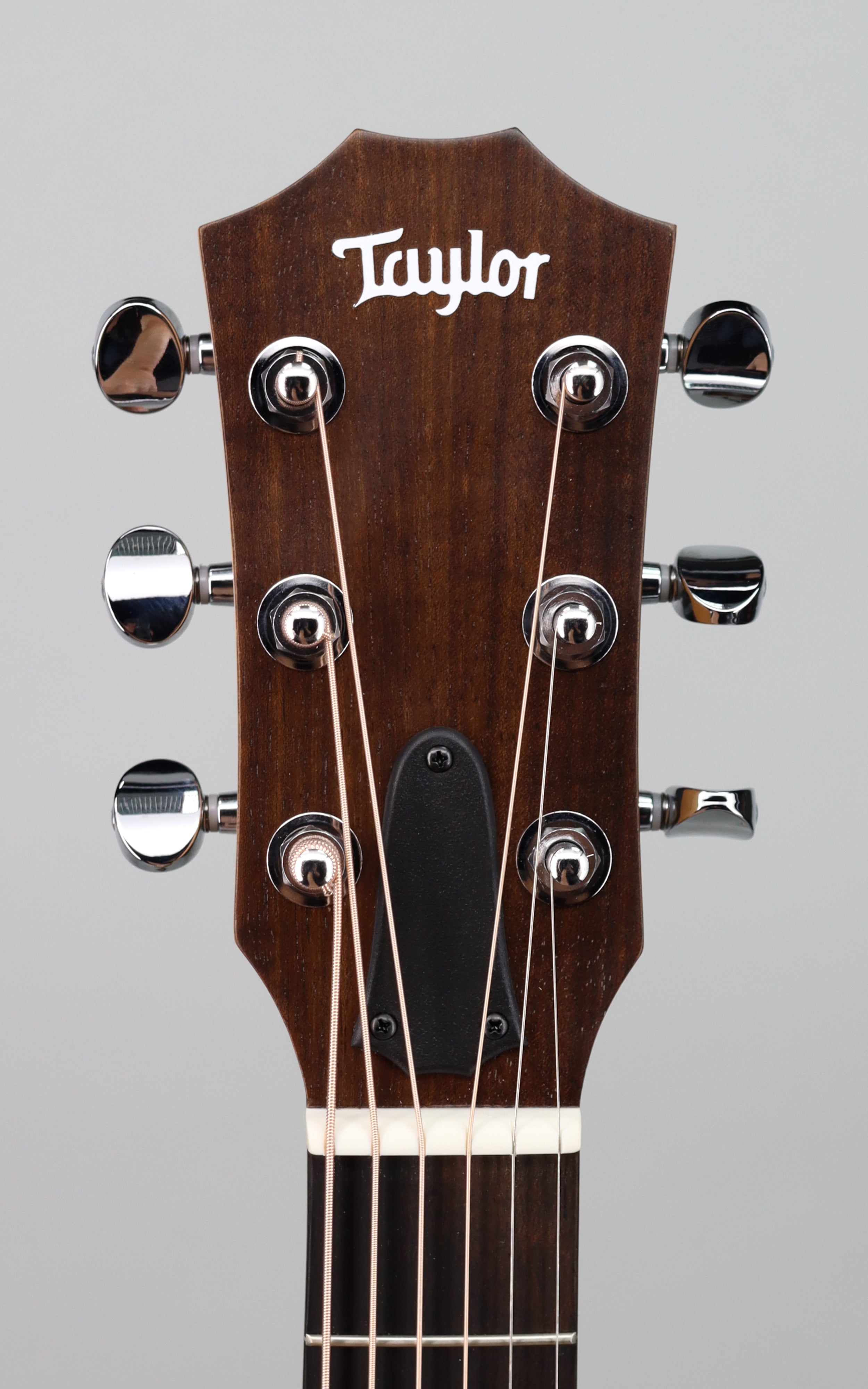 Specs: Sitka spruce top; layered Indian rosewood back & sides; Neo-Tropical mahogany neck; West African Crelicam ebony fretboard & bridge; 23 ½″ scale length; 1 11⁄16″ nut width. Taylor structured gig bag included.