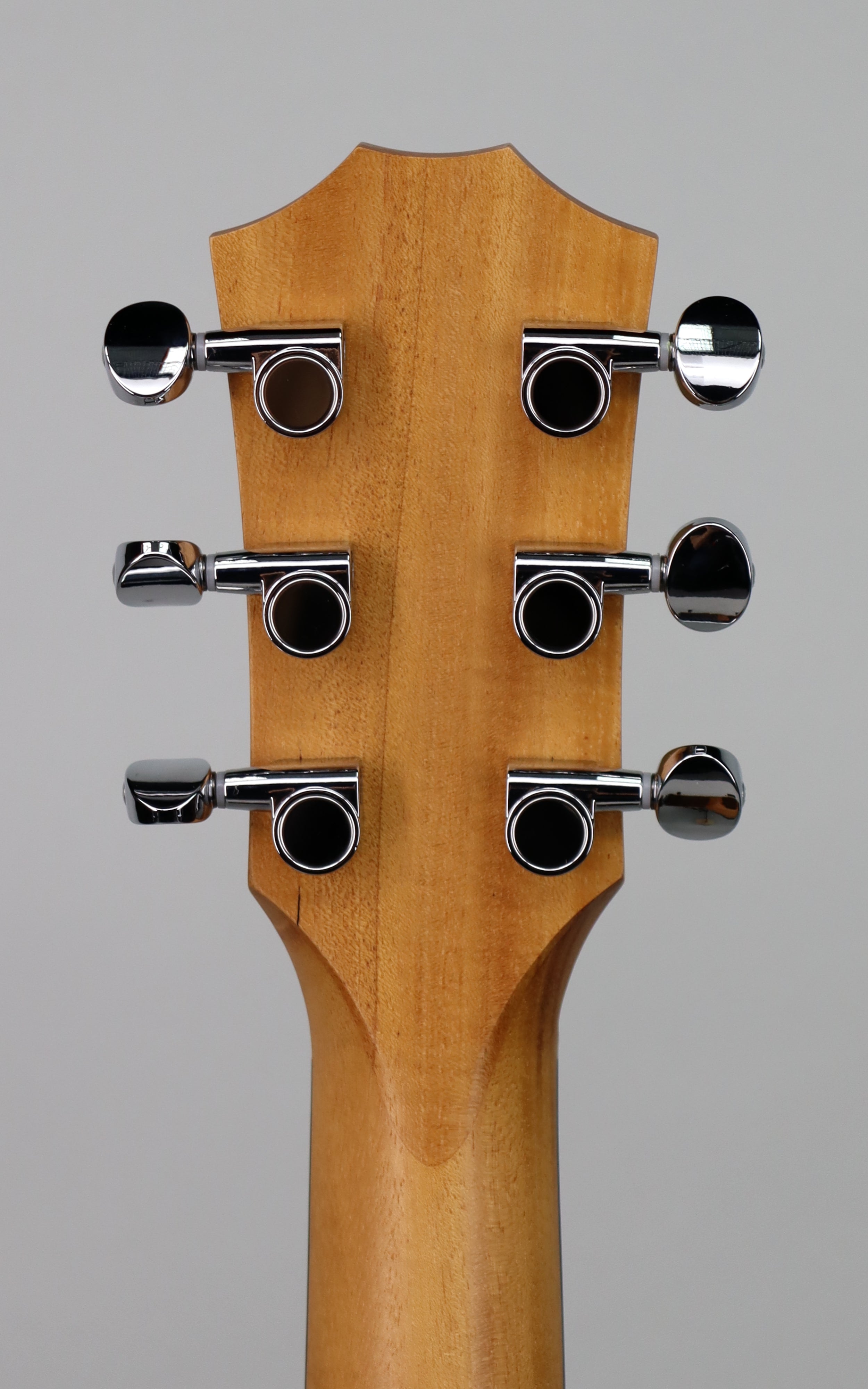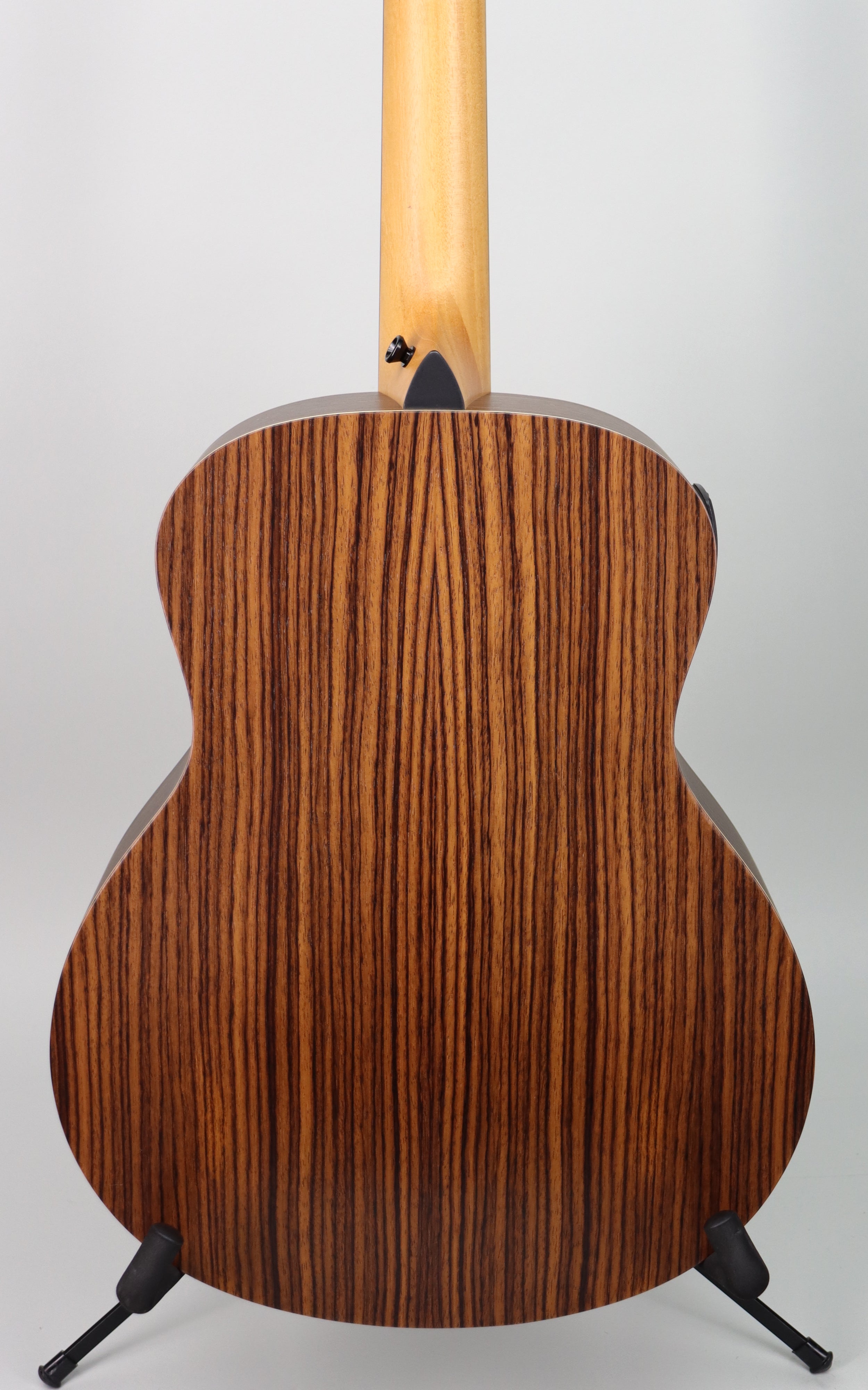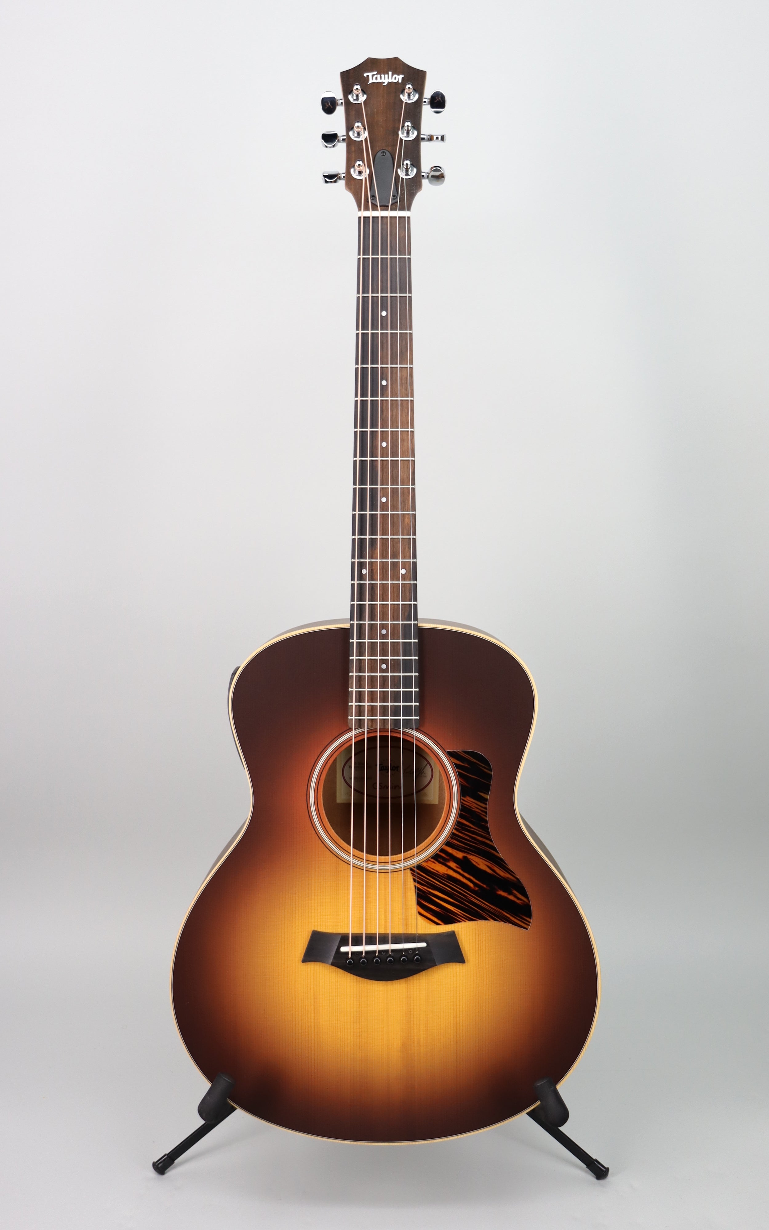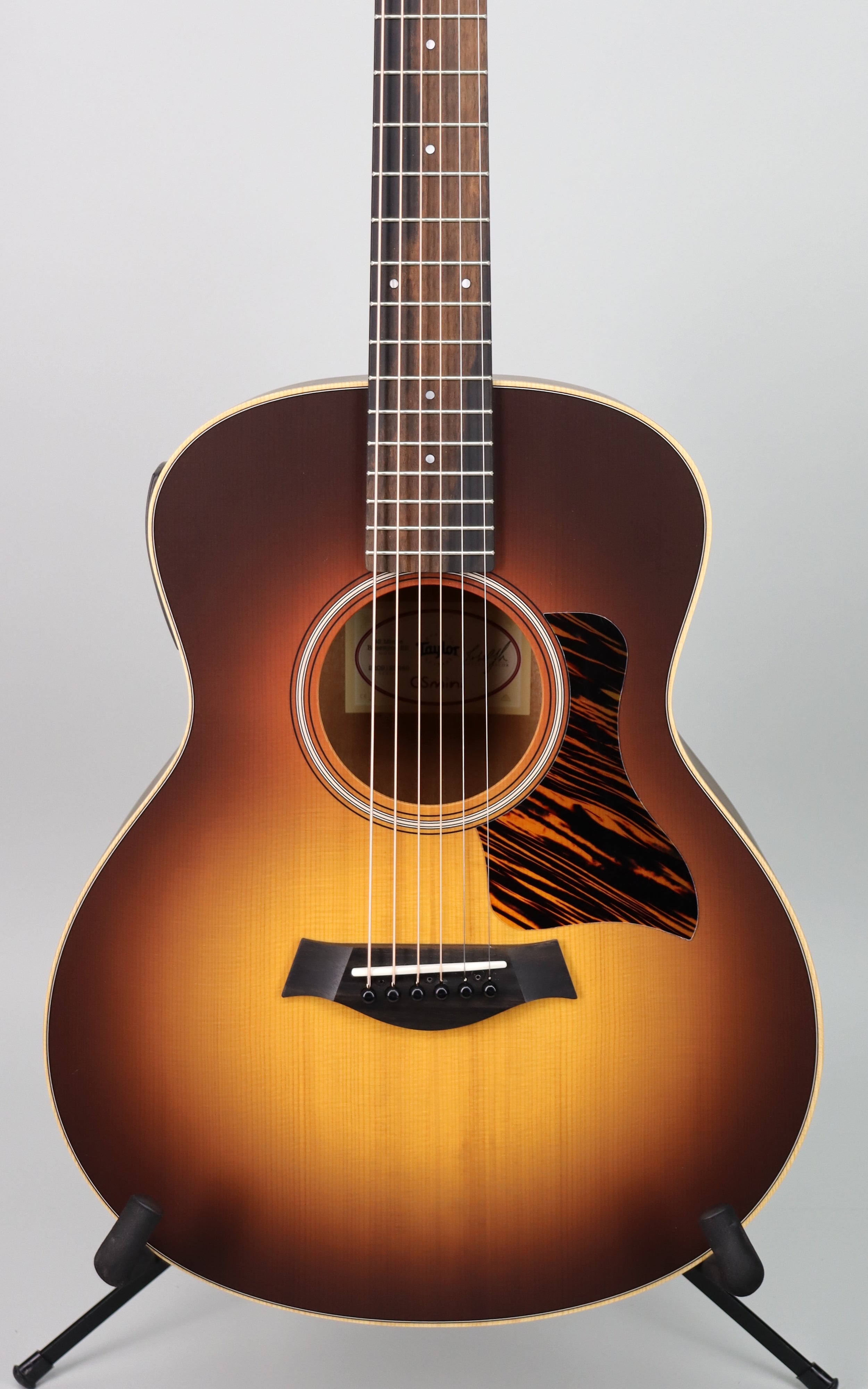 Specs: Sitka spruce top; layered Indian rosewood back & sides; Neo-Tropical mahogany neck; West African Crelicam ebony fretboard & bridge; 23 ½″ scale length; 1 11⁄16″ nut width. Taylor structured gig bag included.