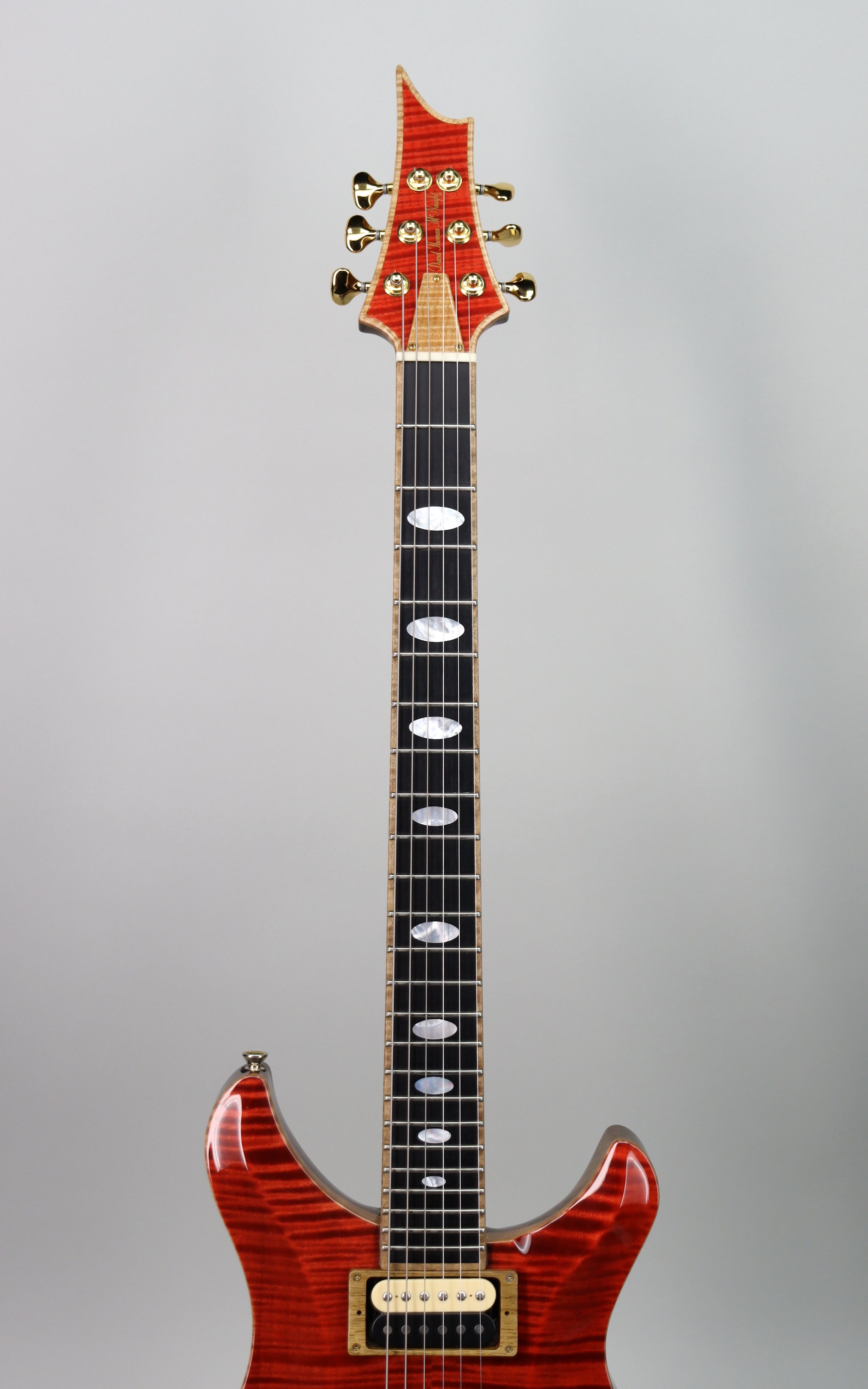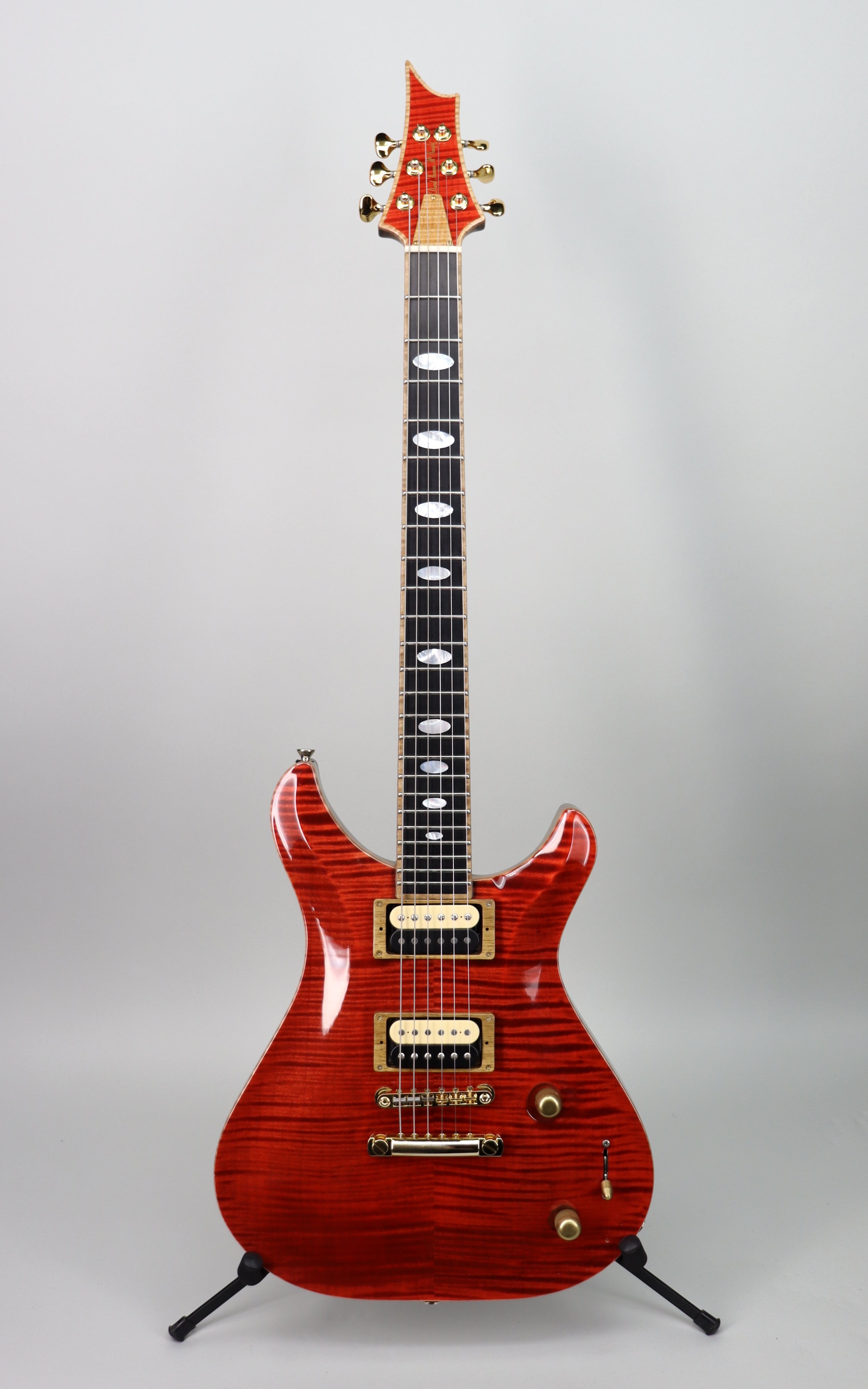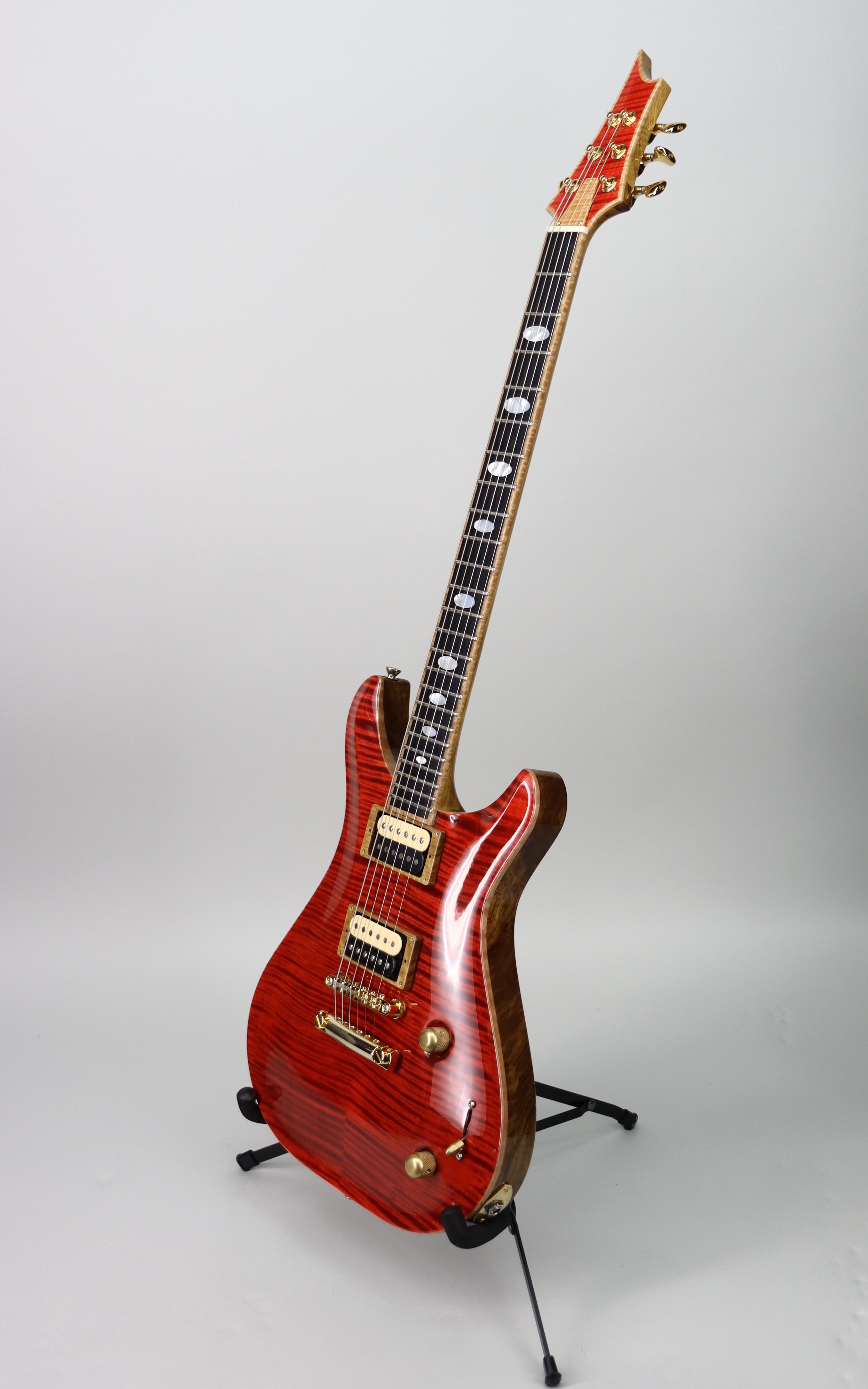 Specs: Diamond flame maple top; black limba back; black limba neck; neck dimensions: 1st .860" ~ 12th .924" ebony fingerboard; 24 jumbo frets; 24.75" scale length; 12" fingerboard radius; 1-11/16" nut width; mother of pearl inlays; ABR-1 bridge; Gotoh 510 tuners. Transparent Red finish. Hard shell case included.