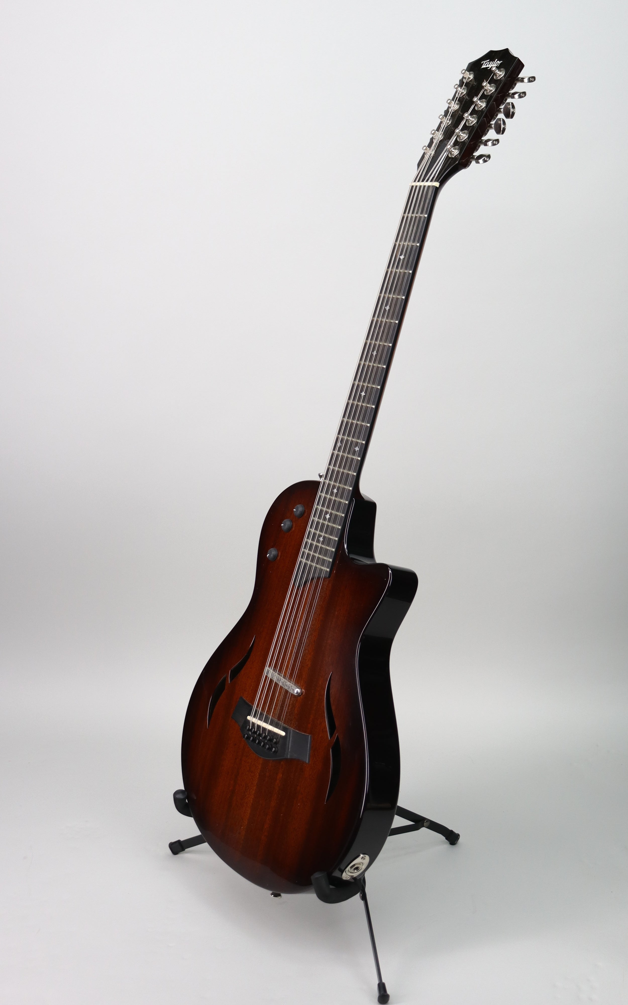 Specs: Semi-hollowbody T5z-12 Classic design with a neo-tropical mahogany top and sapele back and sides; satin-finished body with single cutaway and bolt-on neo-tropical mahogany neck; 24.875″ scale length with 12″ fingerboard radius and jumbo frets on a Tusq nut with 1.6875″ width; ebony fingerboard with small diamond inlays; ebony bridge with Micarta saddle and Taylor closed-gear tuners; . Original Taylor hard shell case included.