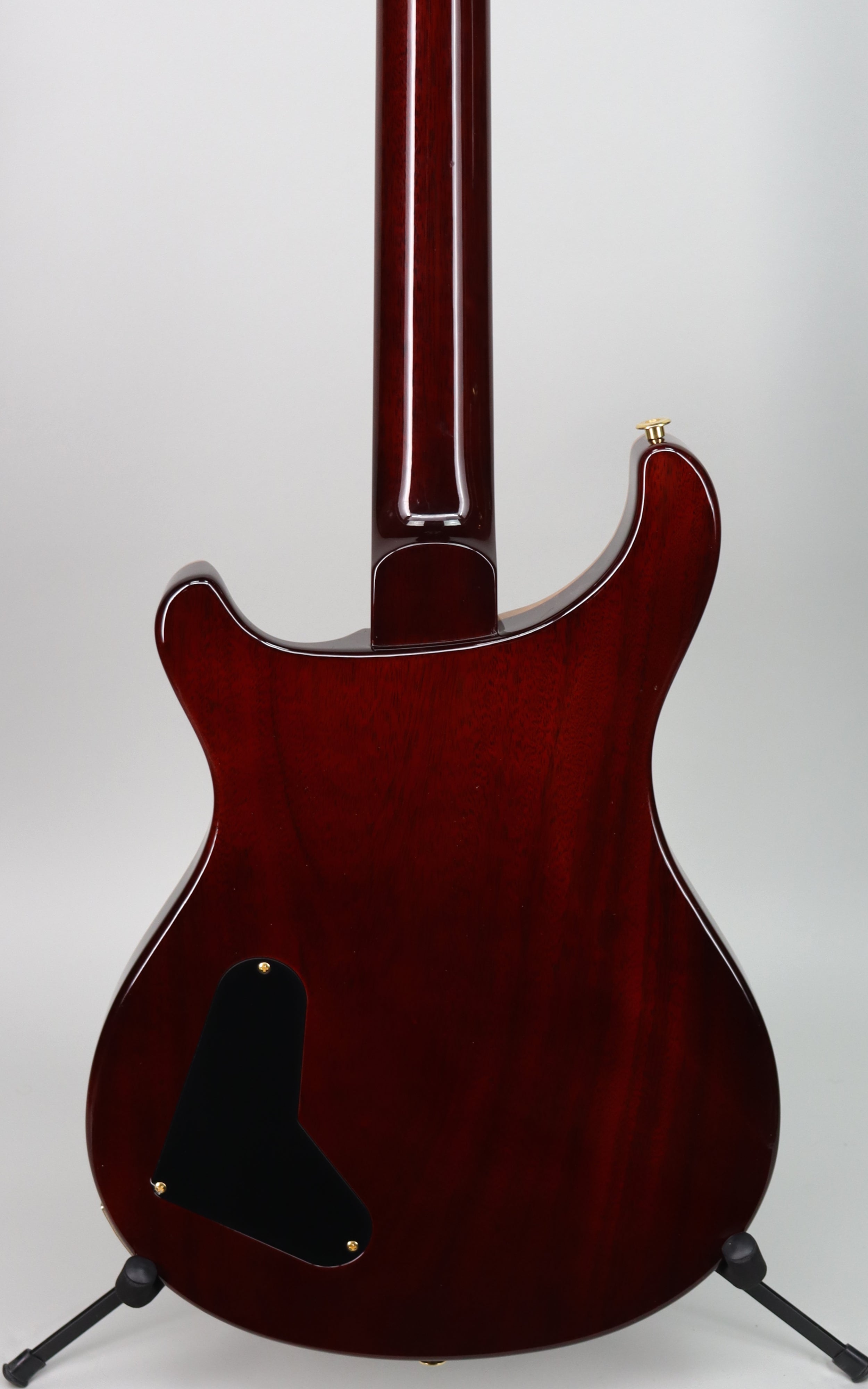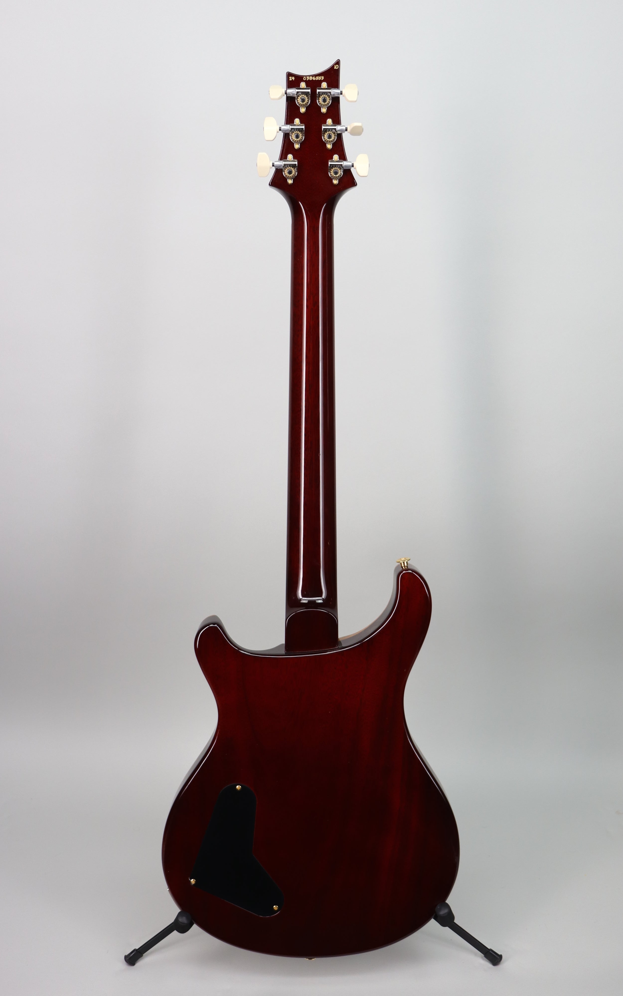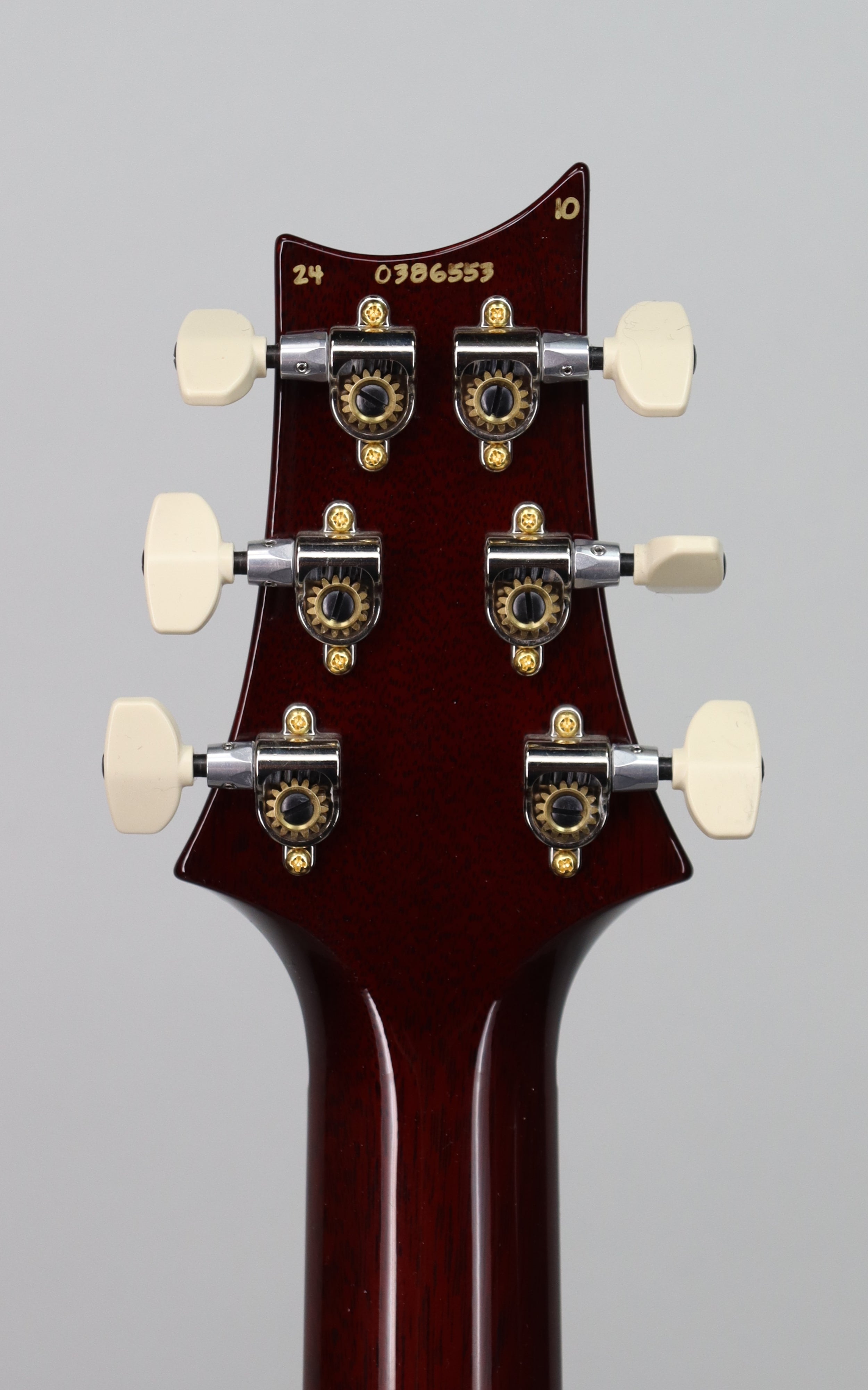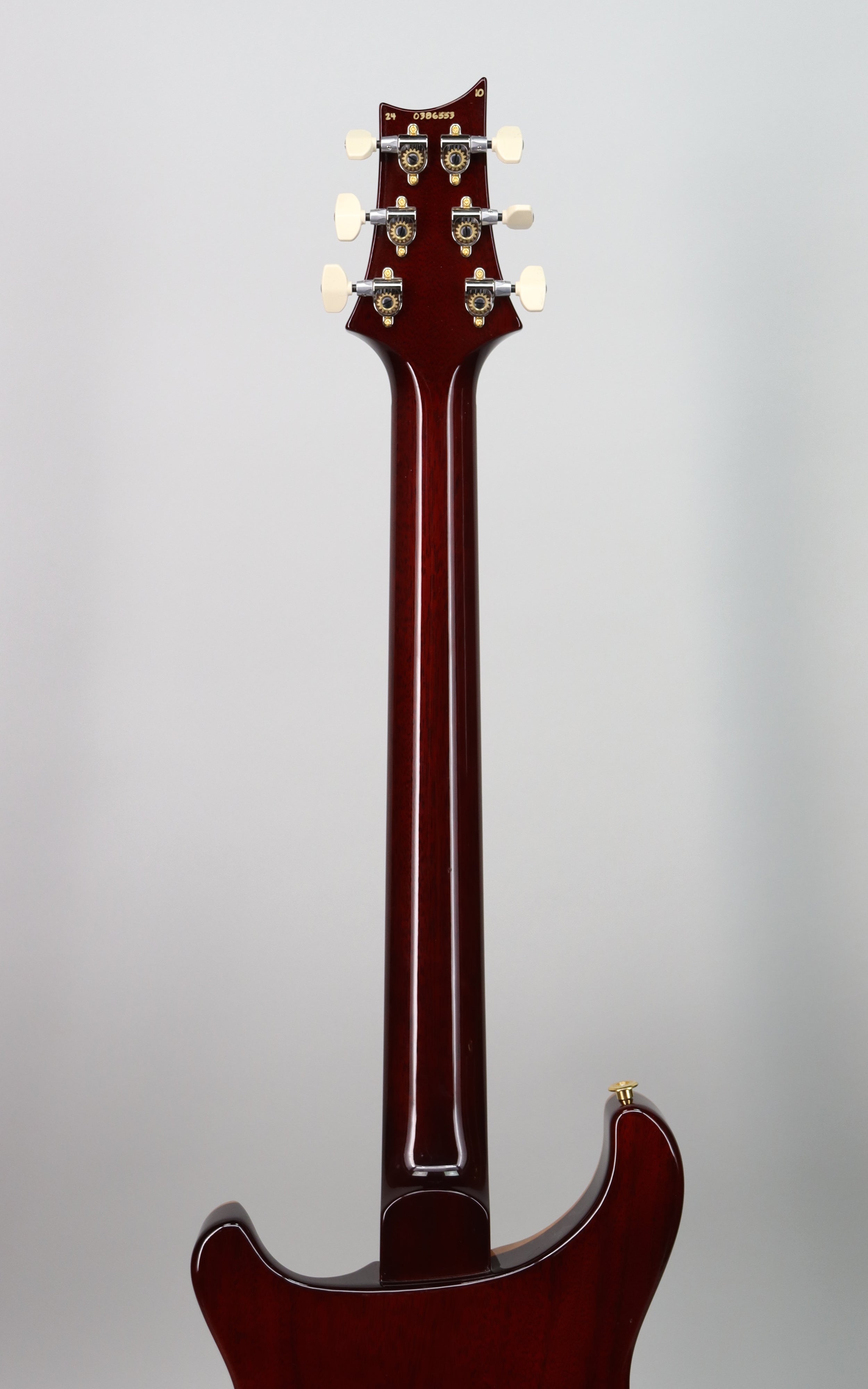 Specs: Carved figured maple "10" top; mahogany back; mahogany neck with Pattern carve; 22 frets on a 25" scale length; Honduran rosewood fingerboard with PRS Brushstroke bird inlays and 10" radius; PRS stoptail bridge with brass inserts; PRS Phase III locking tuners with wing buttons; nickel hardware. High Gloss Nitro Dark Cherry Burst finish. Original hard shell case and COA.