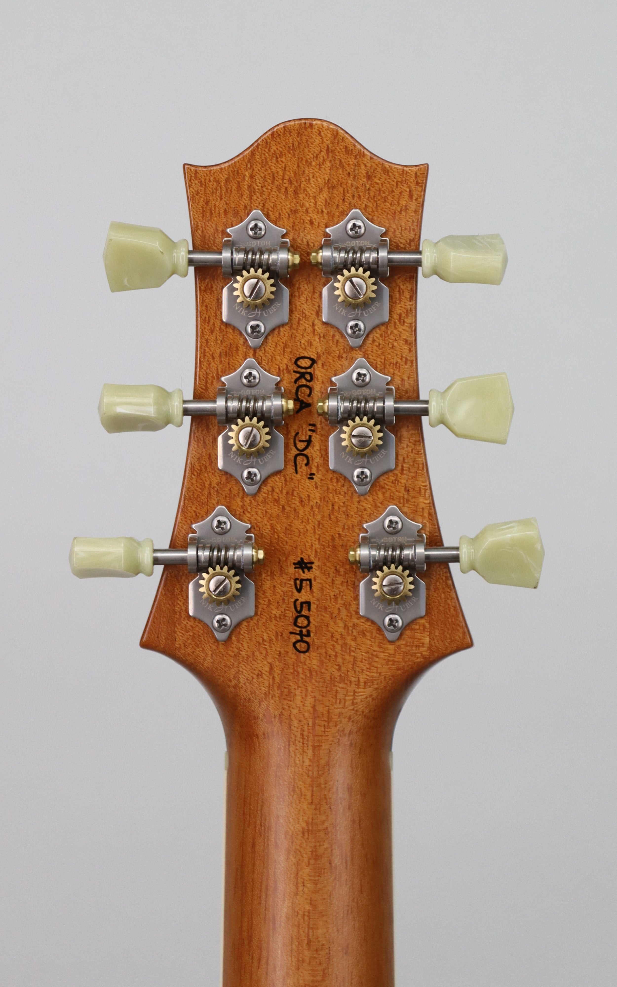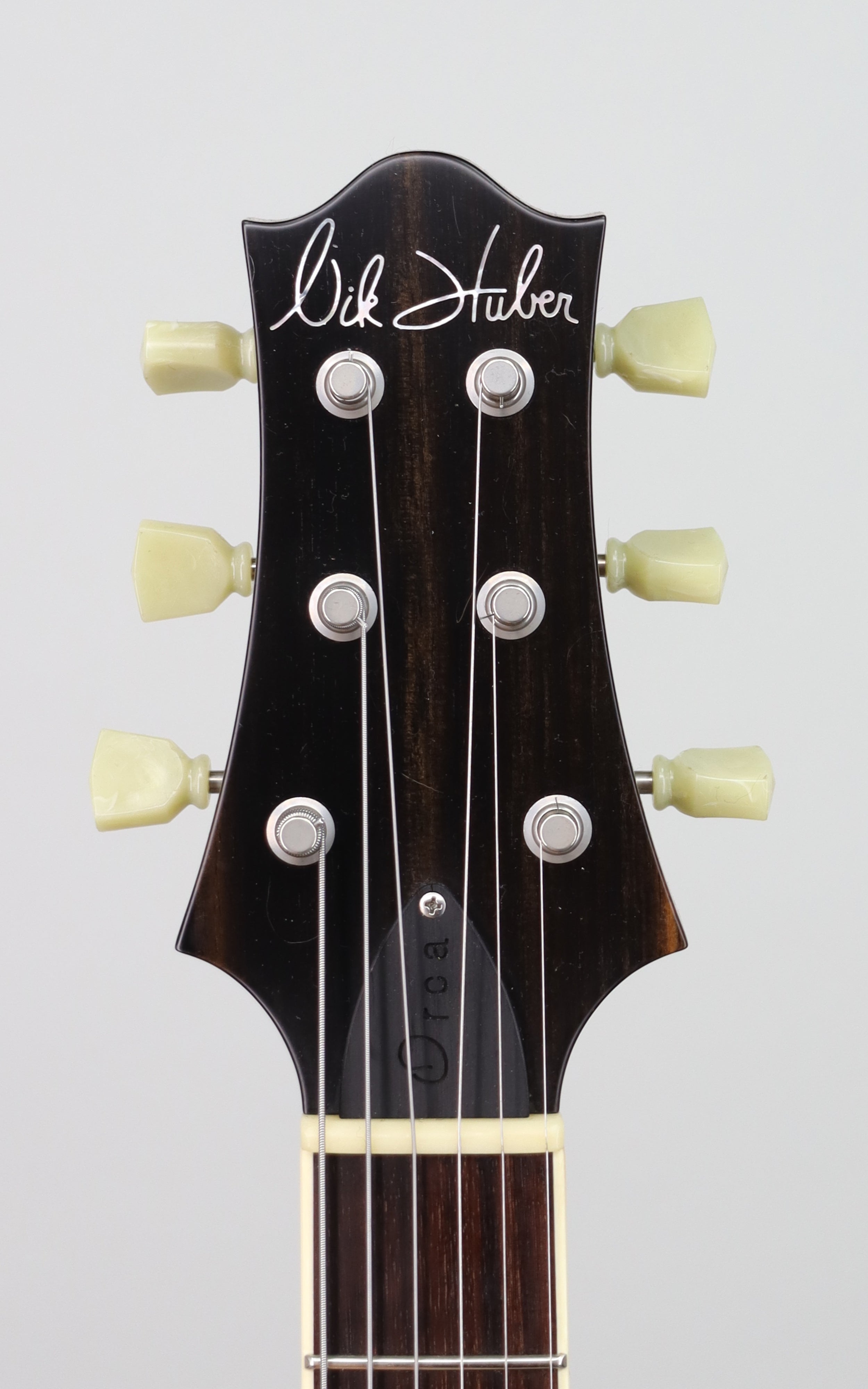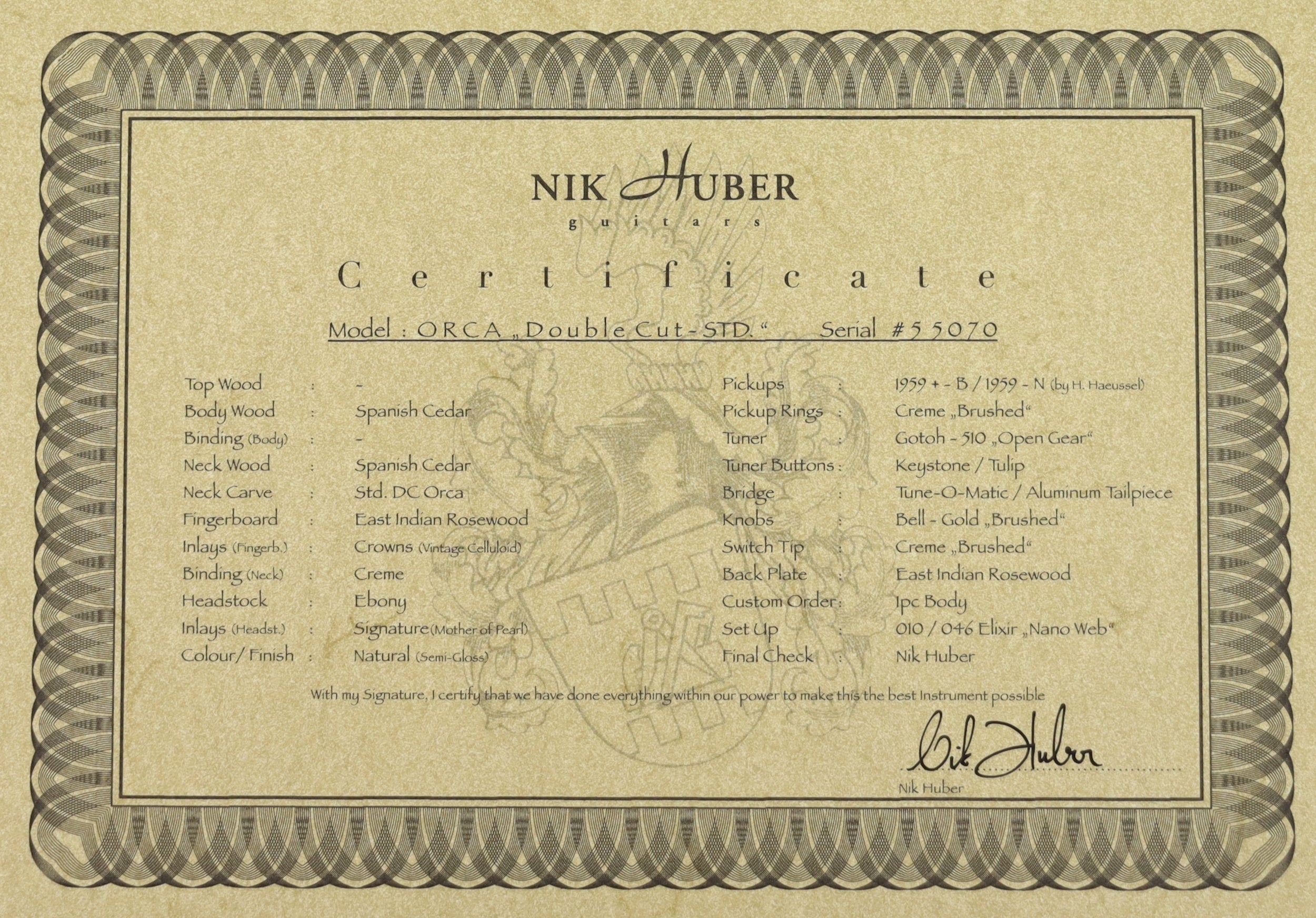 Specs: Spanish cedar body; Spanish cedar neck with Standard DC Orca carve; East Indian rosewood fingerboard with vintage celluloid crown inlays; creme neck binding; ebony headstock veneer with mother-of-pearl signature inlay; Tune-O-Matic bridge with aluminum tailpiece; Gotoh 510 open-gear tuners with keystone/tulip buttons; brushed gold bell knobs with creme brushed switch tip; East Indian rosewood back plate. Natural semi-gloss finish. Hardshell case included. Original Nik Huber certificate of authenticity included.